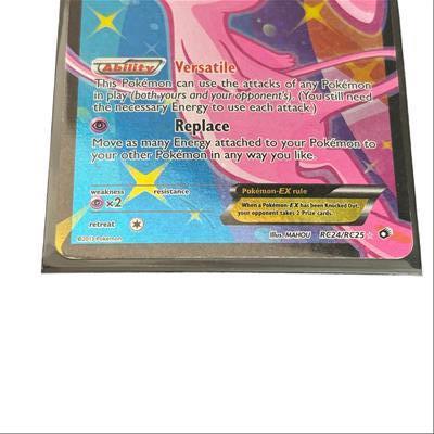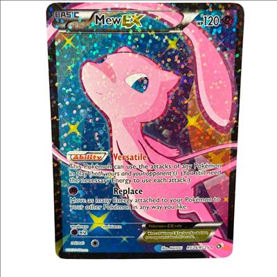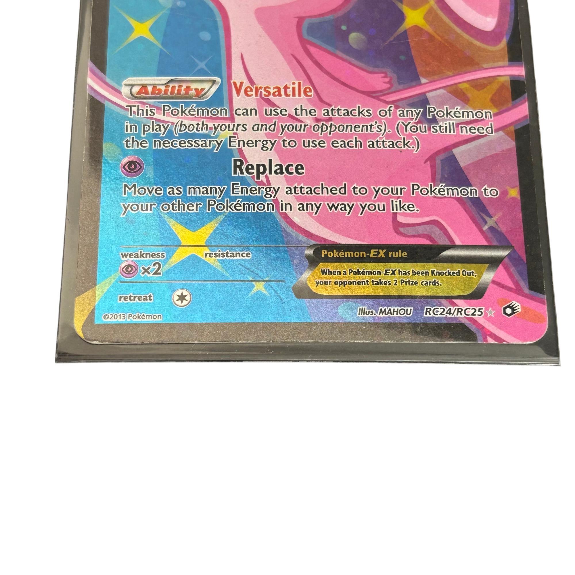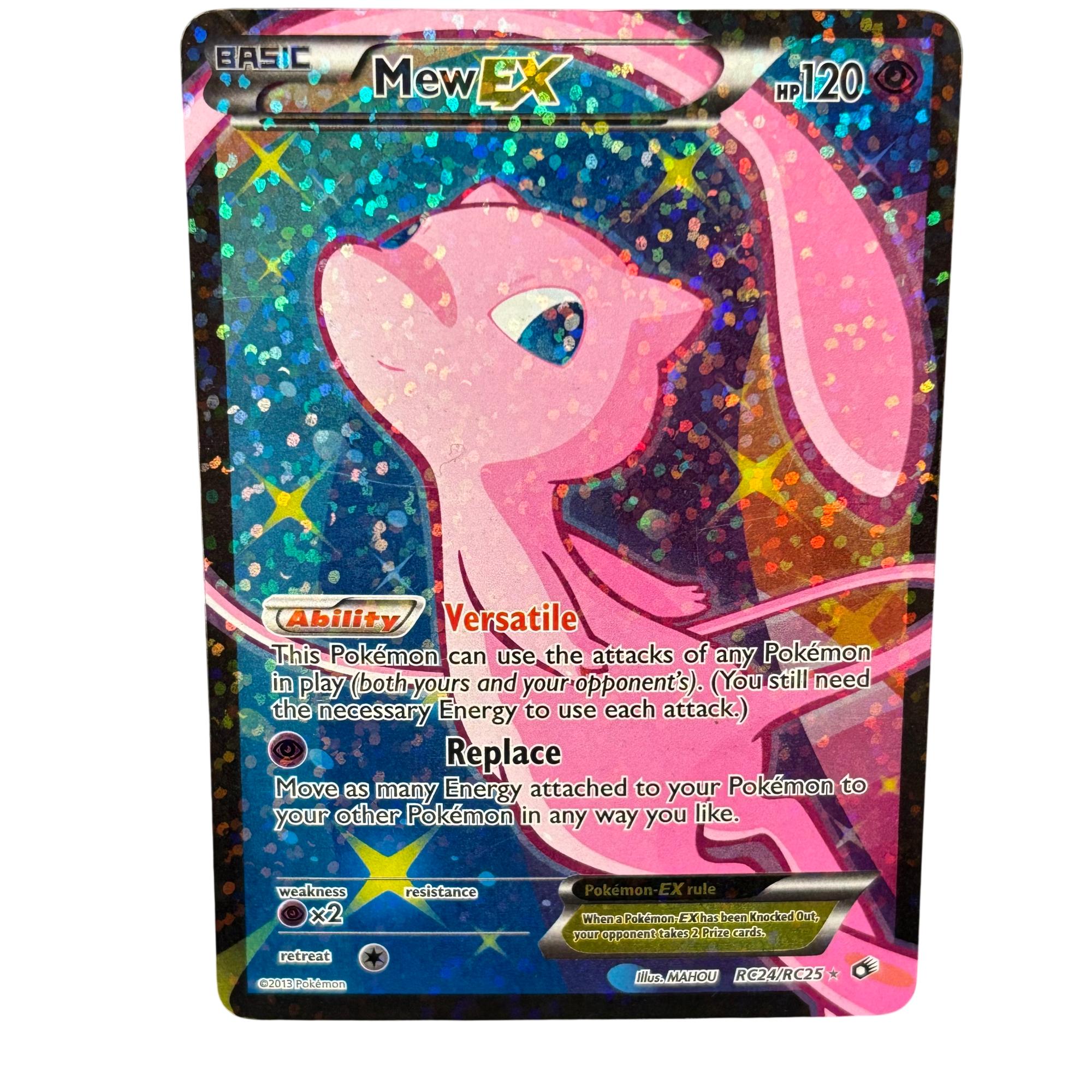 Pokémon TCG Mew EX (Full Art) RC24/RC25 Legendary Treasures: Radiant Collection Holo 2013 features a striking full art design showcasing Mew with vibrant colors and intricate details. This versatile card allows Mew to use the attacks of any Pokémon in play, requiring the necessary Energy for each attack, and includes game mechanics such as Energy movement and prize cards upon knockout. Its holographic finish enhances the collectible appeal, making it a sought-after piece for Pokémon Trading Card Game enthusiasts and collectors.