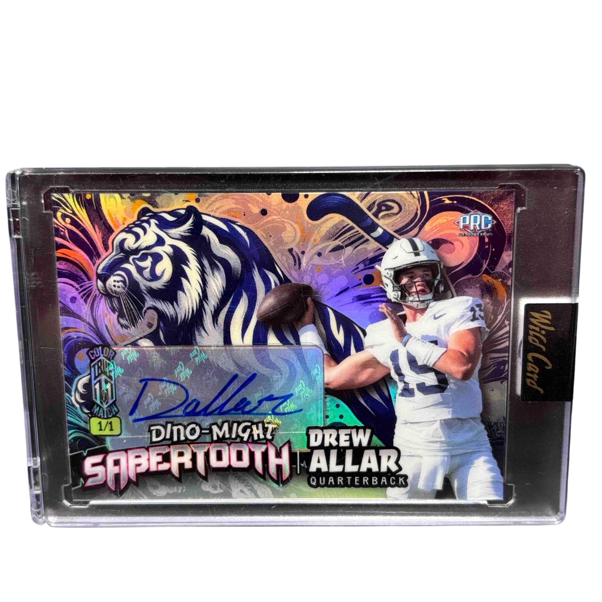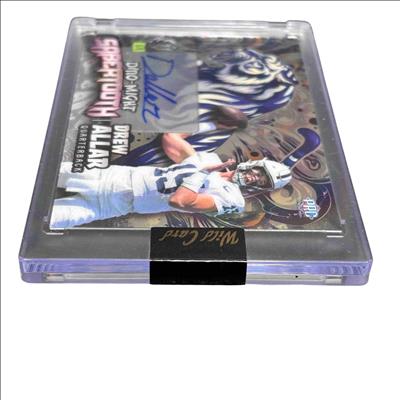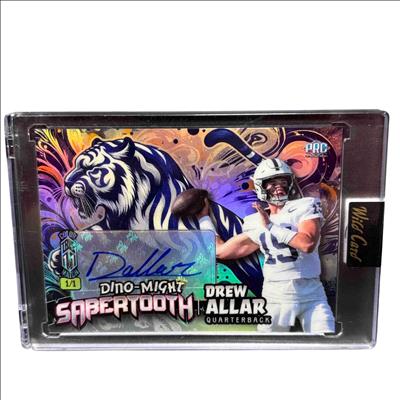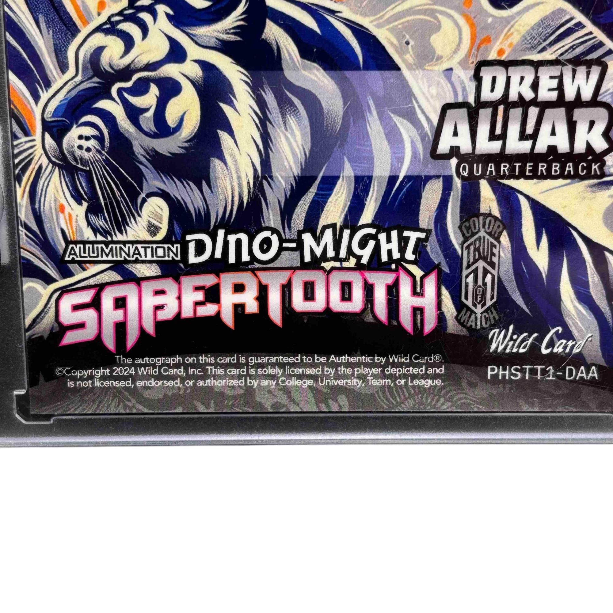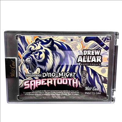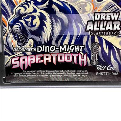 The 2024 Wild Card Alumination Dino-Might Sabertooth 1/1 Quarterback Drew Allar Autograph Card is a rare football trading card featuring a unique design inspired by prehistoric themes. This collectible highlights Drew Allar in his quarterback role, encased in premium material showcasing the distinctive Dino-Might Sabertooth artwork and autograph. Its one-of-a-kind numbered edition makes it a prized item for serious sports card collectors and football fans.
