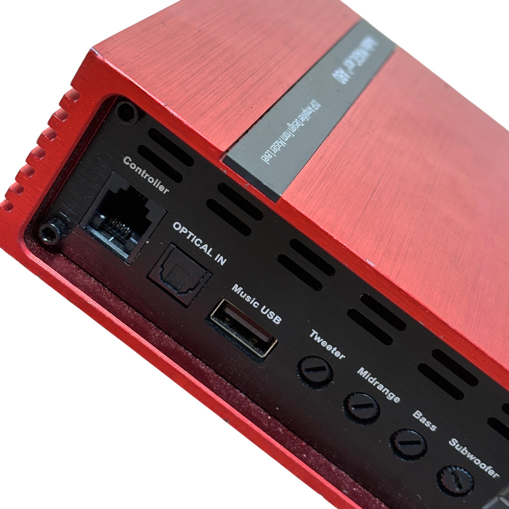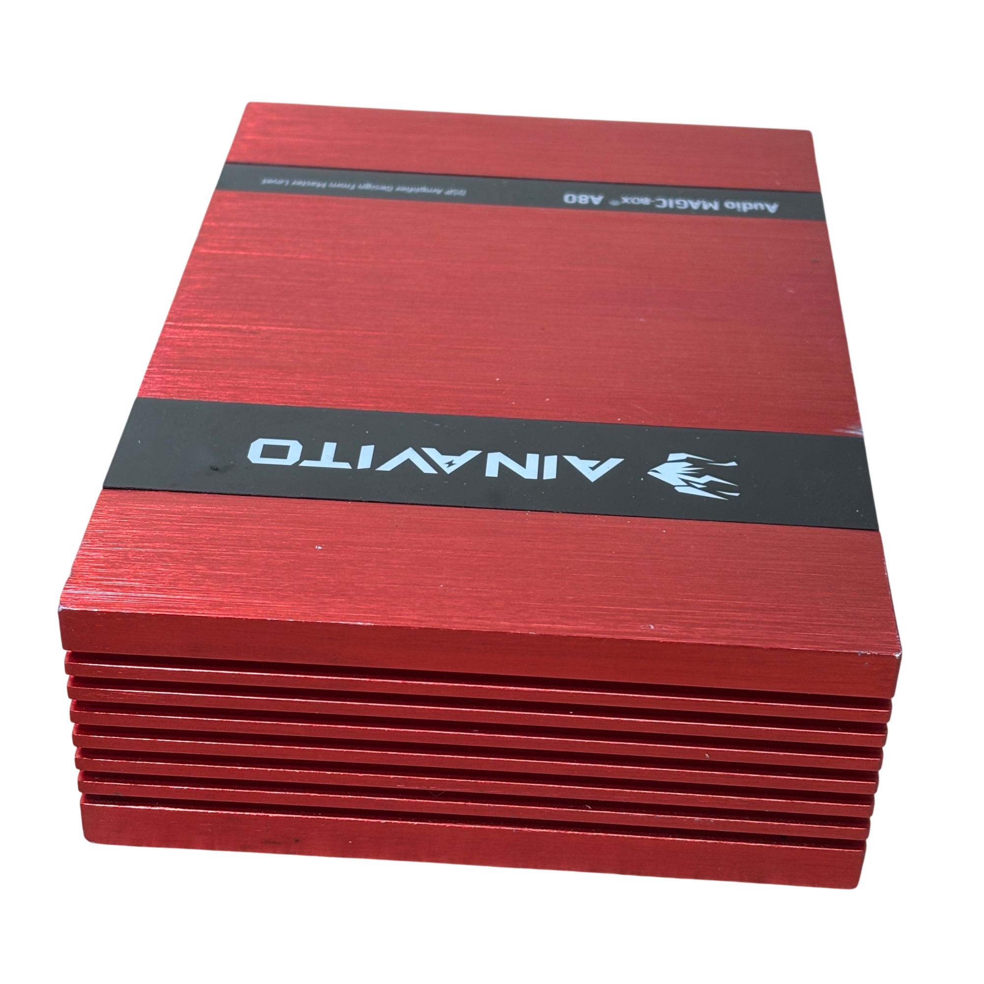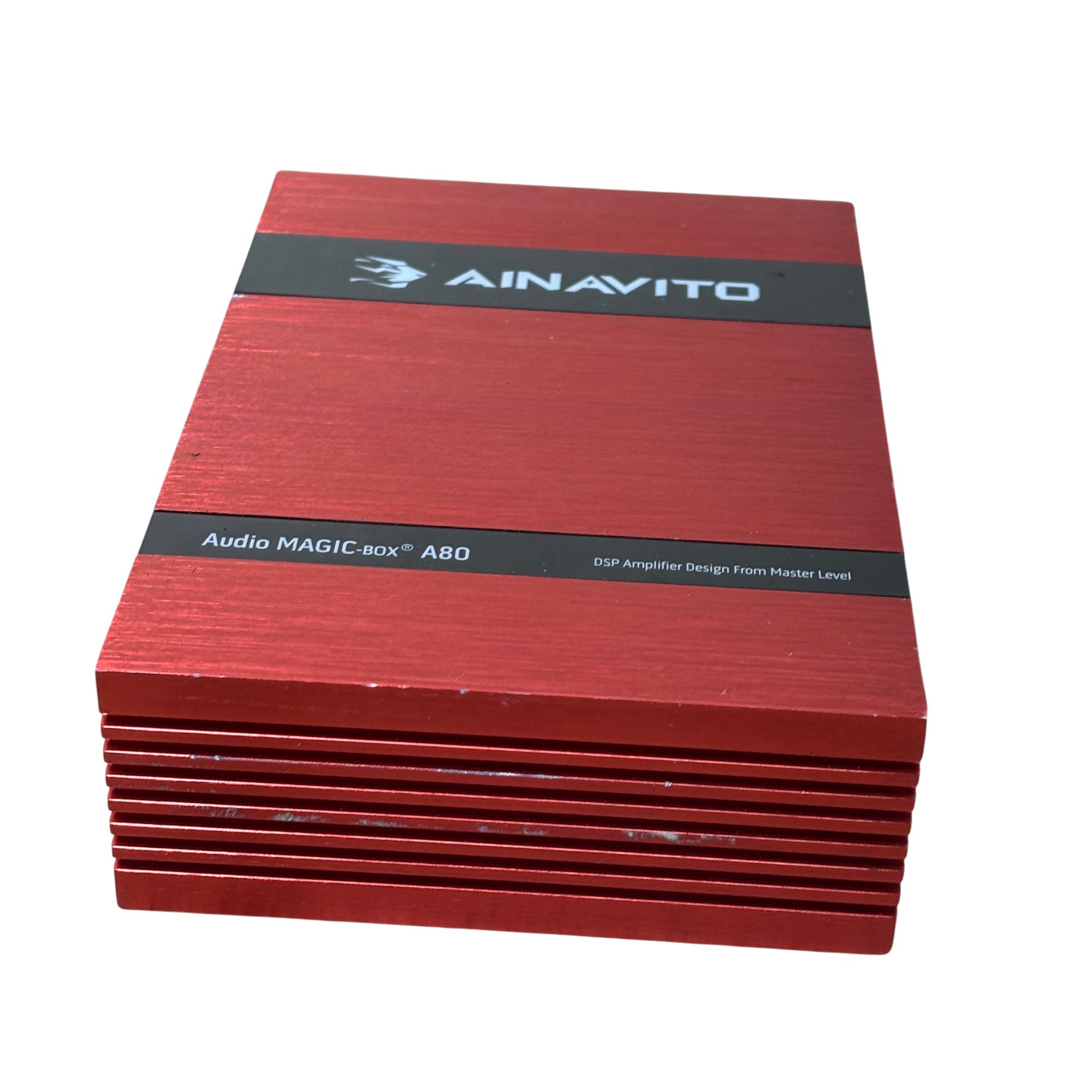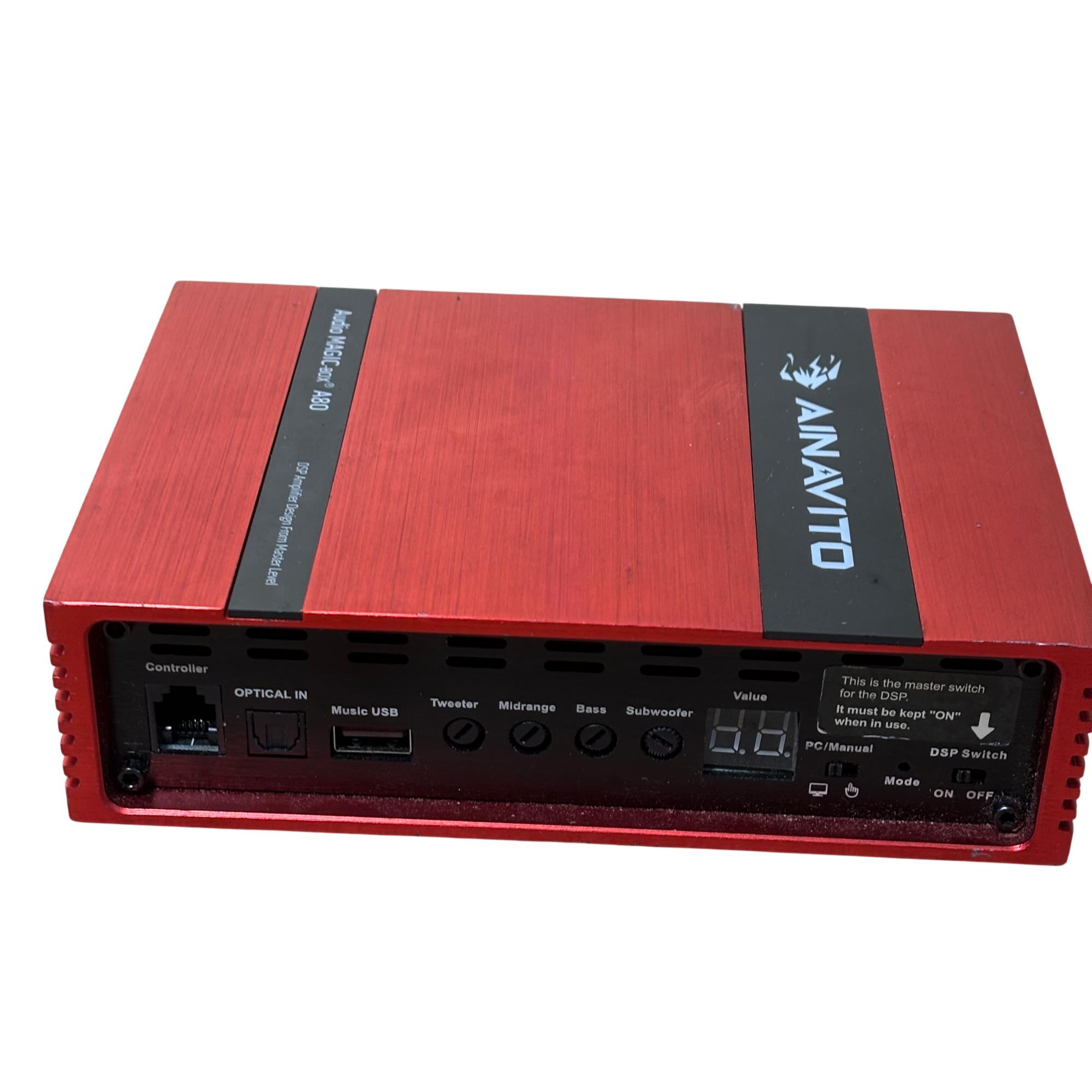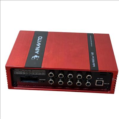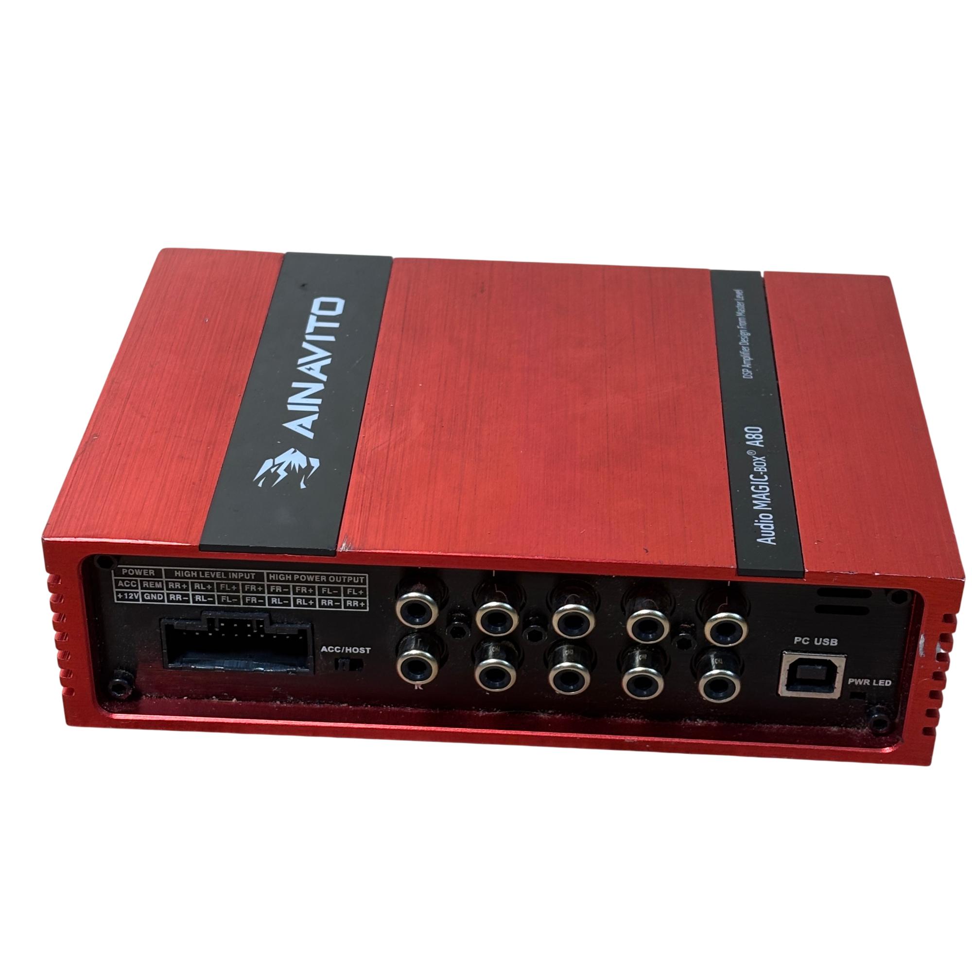 AINAVITO Audio MAGIC-BOX A80 DSP Car Amplifier is a high-performance 8-channel digital signal processor designed for advanced car audio tuning. It features a 31-band equalizer and multiple input/output options including optical and USB, enabling precise sound customization in a compact red chassis with black controls. This amplifier offers professional-grade audio processing to enhance clarity, bass, and overall sound quality in automotive audio systems.