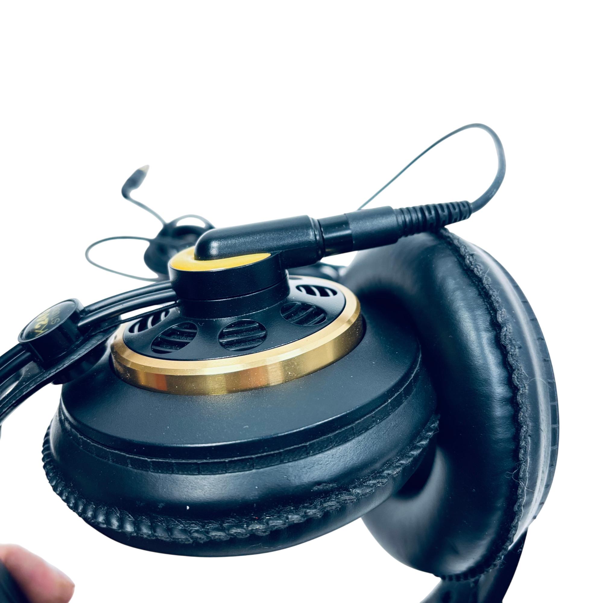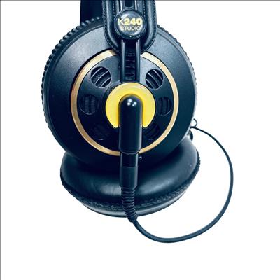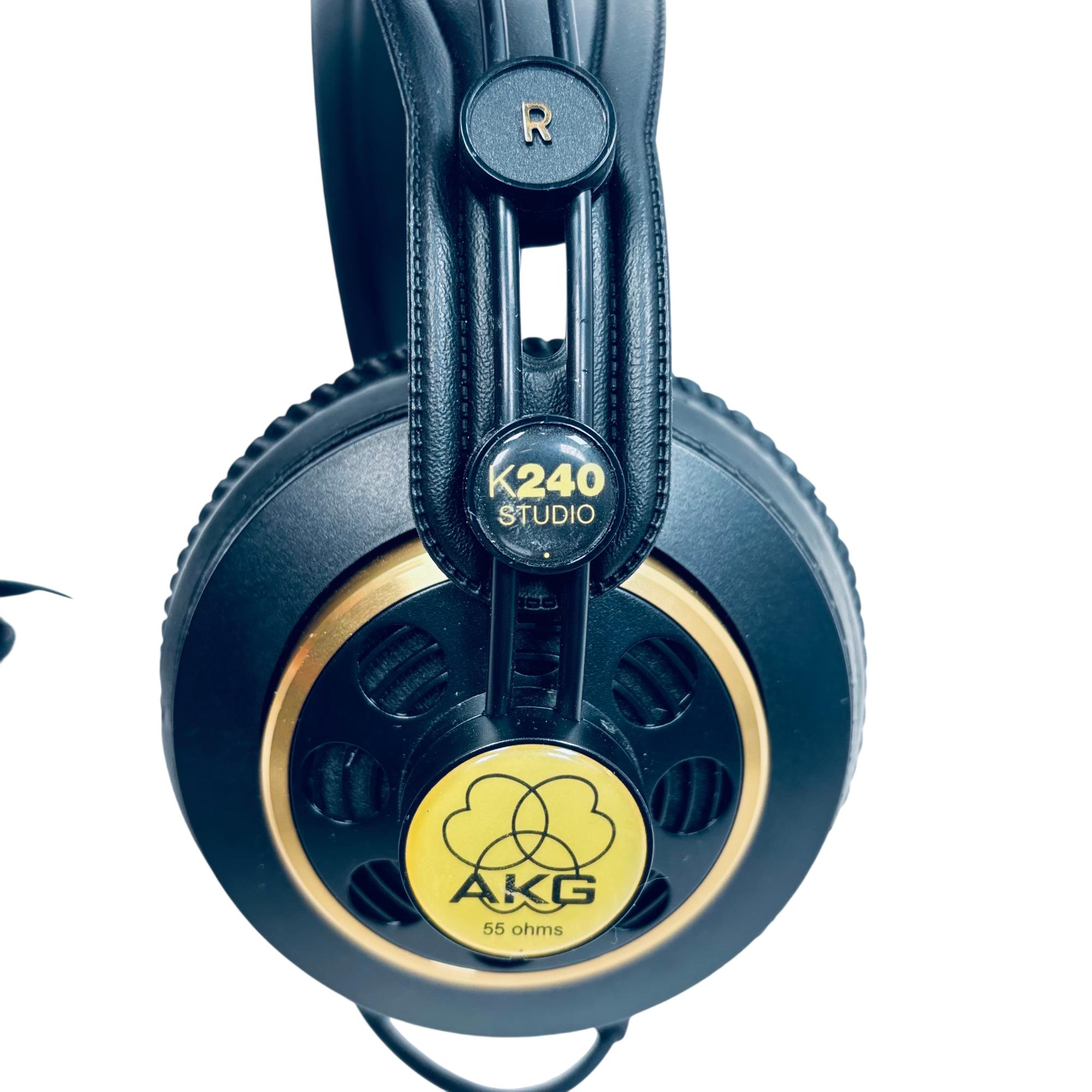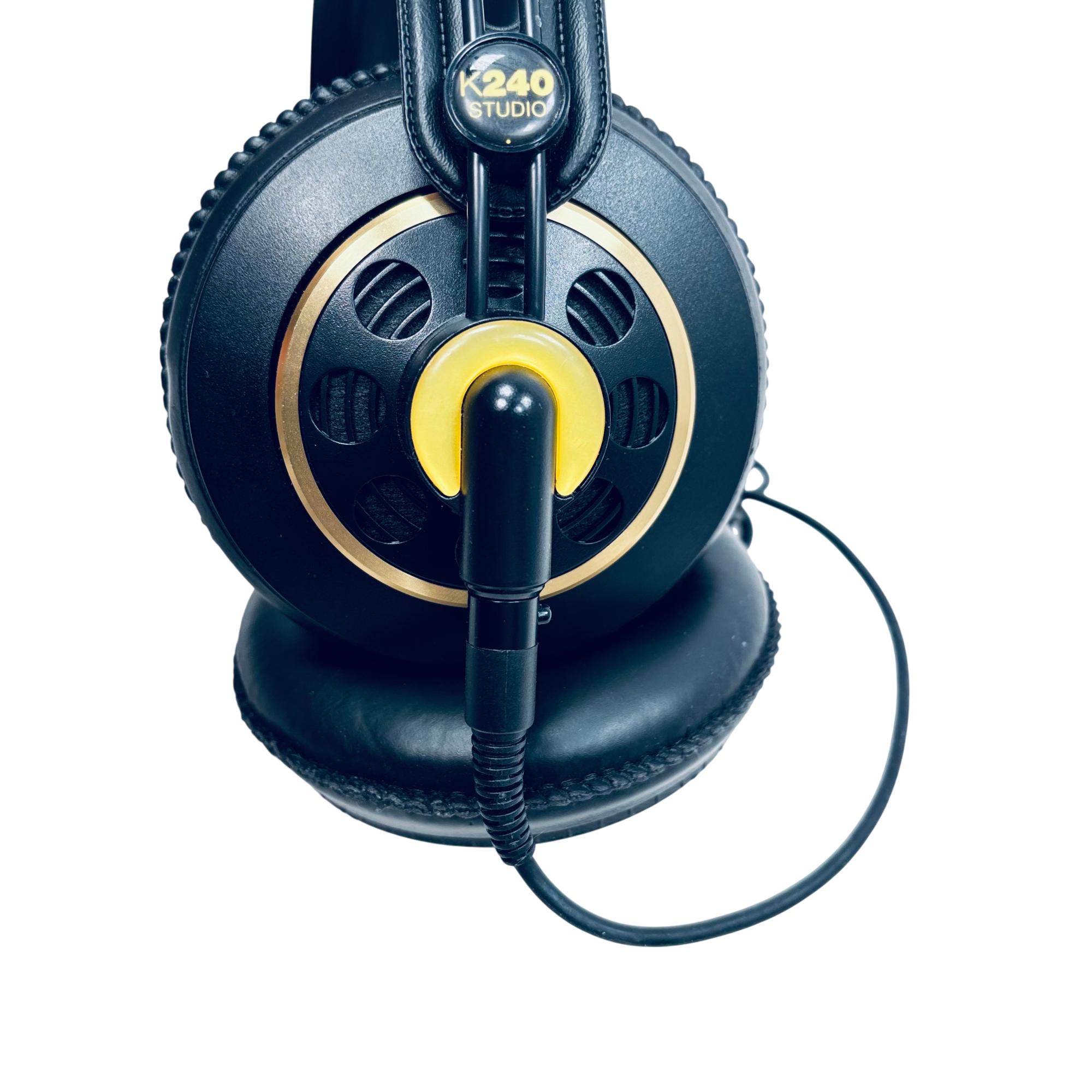 AKG K240 Studio Professional Semi-Open Over-Ear Headphones deliver precise and natural sound with a semi-open design that enhances audio clarity while reducing ear fatigue. These headphones feature a 55-ohm impedance and large ear pads for comfortable, extended listening sessions, making them ideal for studio monitoring and critical listening. The black and gold color scheme adds a stylish and professional look to this high-quality audio equipment.
