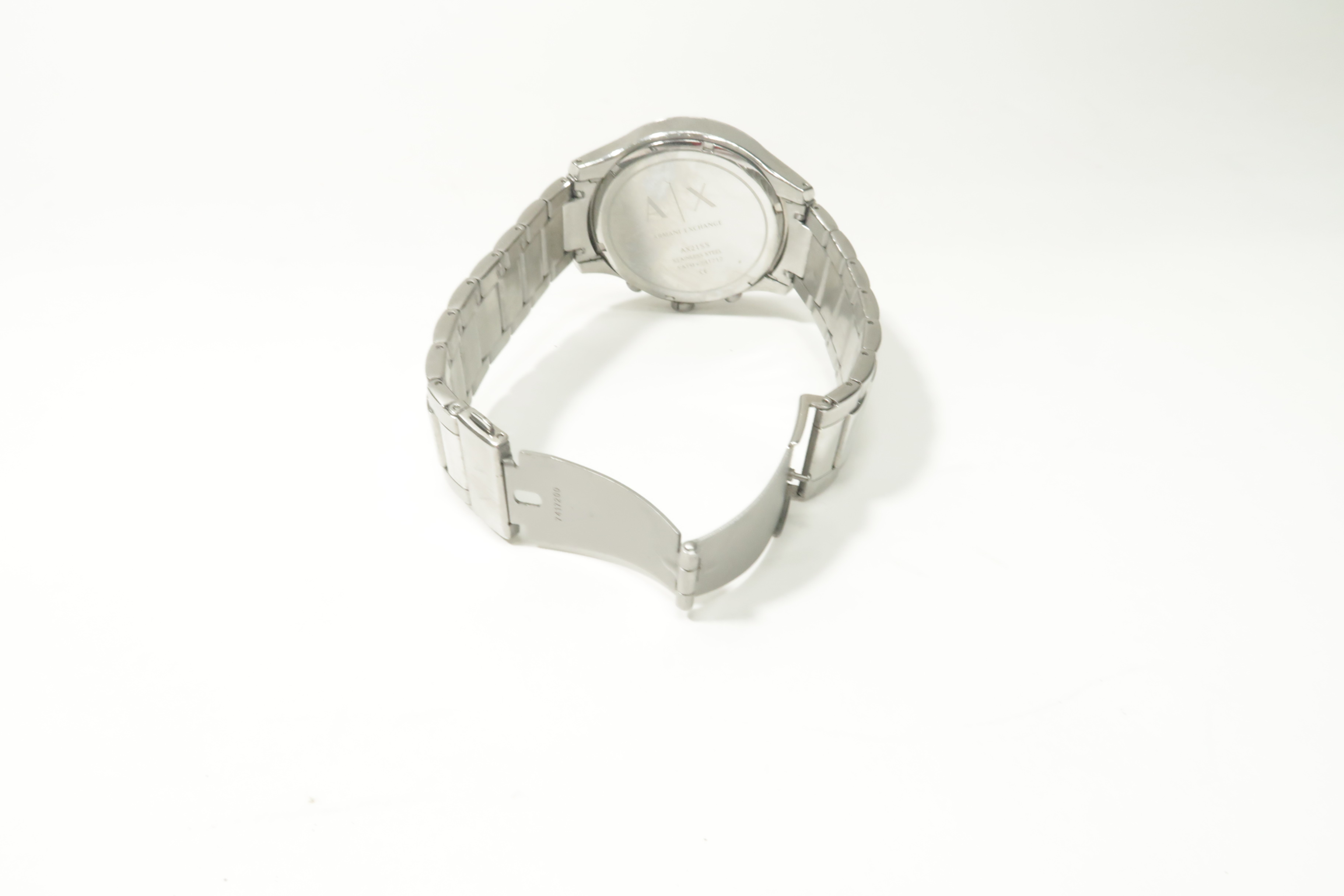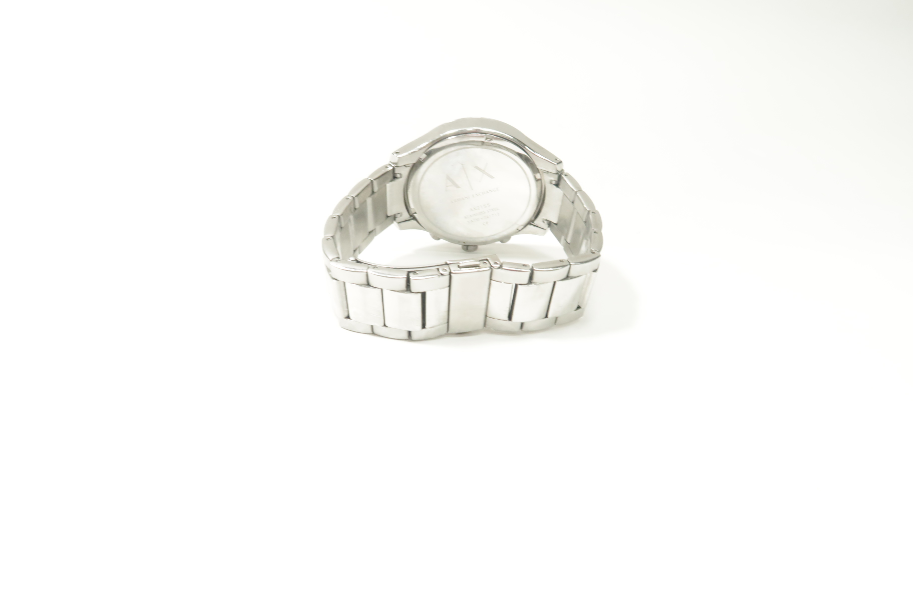 Stainless steel case with a stainless steel bracelet. Fixed stainless steel bezel. Blue dial with silver-tone hands and index hour markers. Minute markers around the outer rim. The Armani Exchange AX logo appears at the 12 o'clock position. Dial Type: Analog. Chronograph - three sub-dials displaying: 60 second, 60 minute and 1/10th of a second. Quartz movement. Scratch resistant mineral crystal. Push / pull crown. Solid case back. Case diameter: 46 mm. Case thickness: 7 mm. Round case shape. Band width: 22 mm. Fold over clasp. Water resistant at 50 meters / 165 feet. Functions: chronograph, hour, minute, second. Casual watch style. Armani Exchange Chronograph Blue Dial Stainless Steel Men's Watch AX2155.