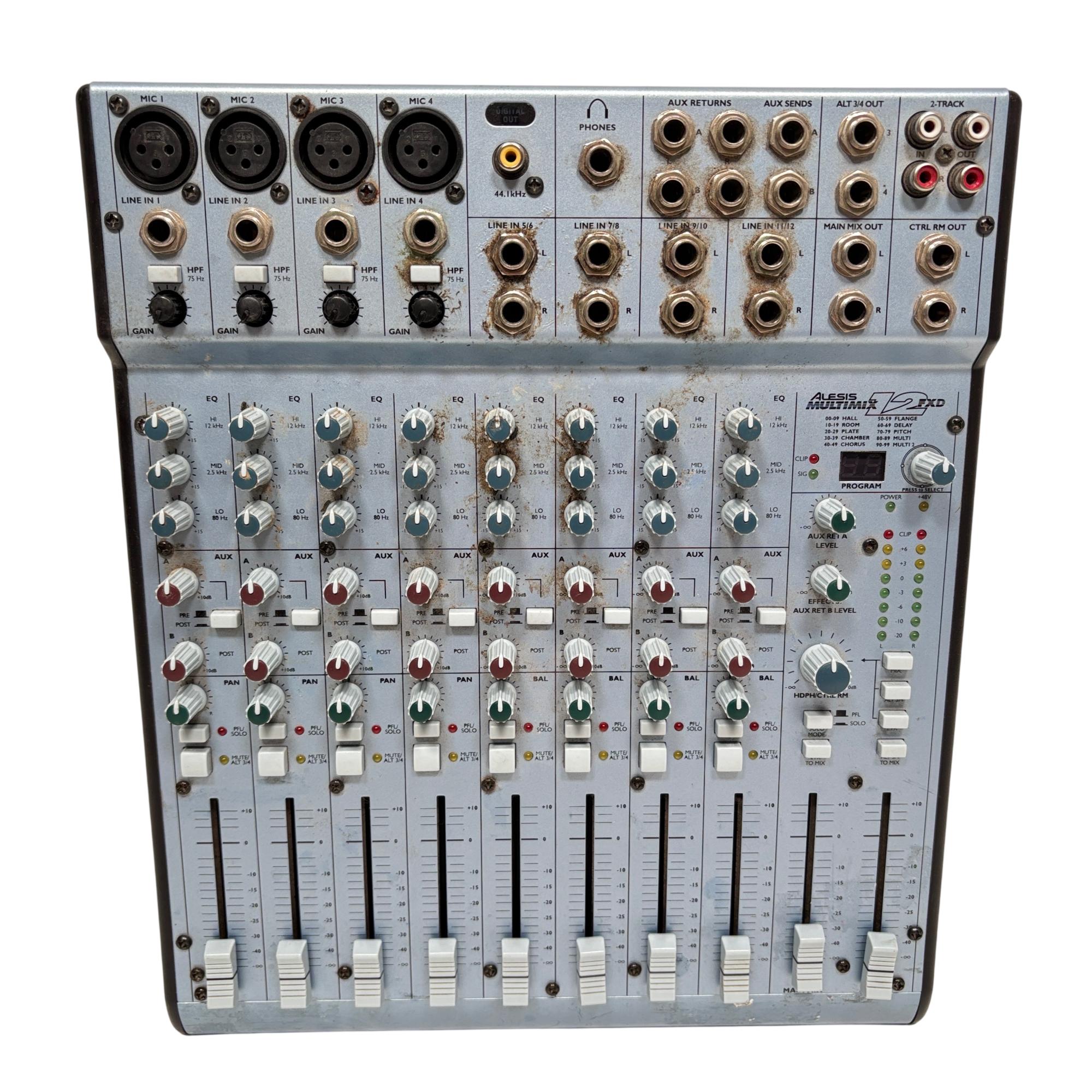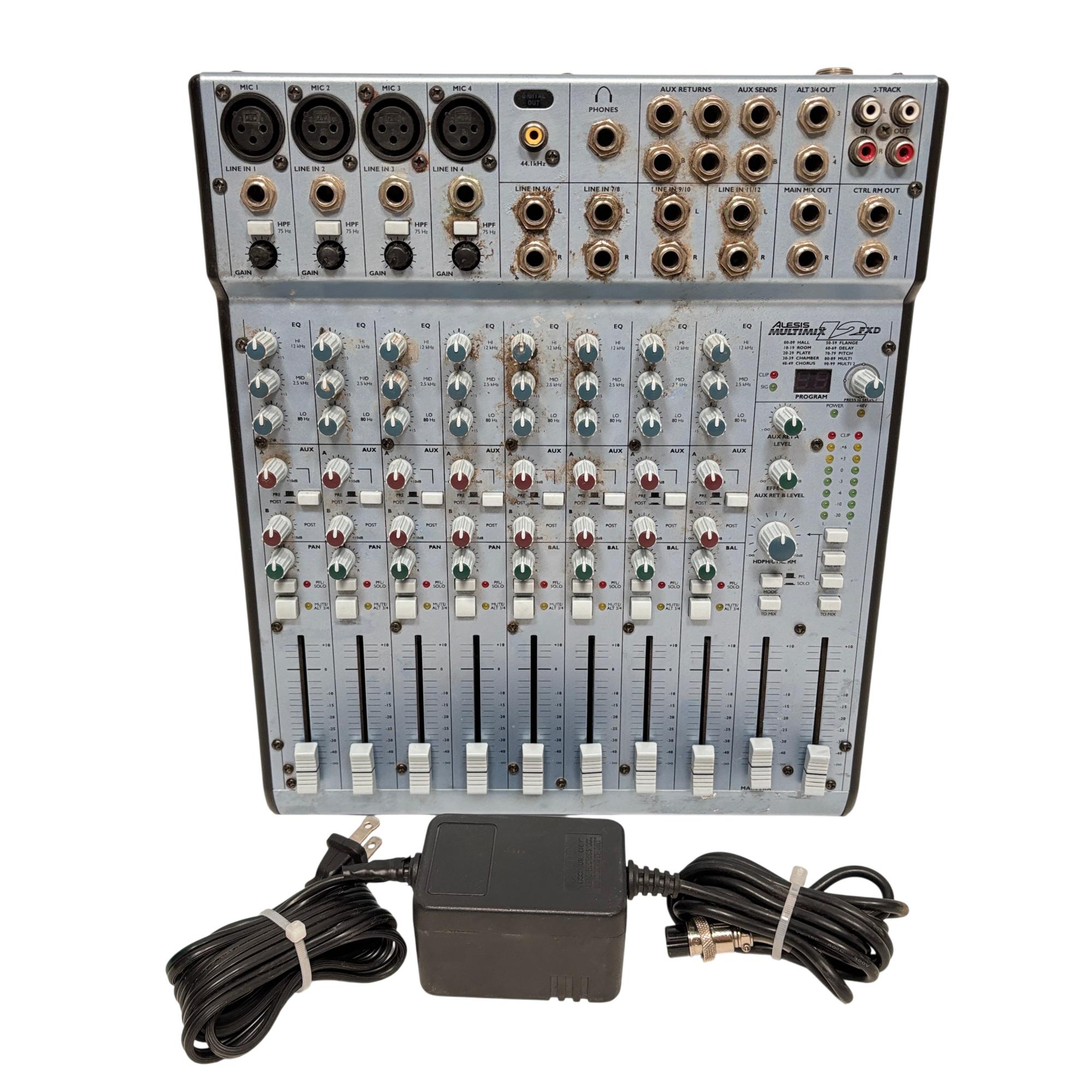 Alesis MultiMix 12FXD 12-Channel Mixer with DSP Effects offers versatile audio mixing with 12 input channels and built-in digital signal processing effects. Designed for both live and studio settings, it features multiple line and mic inputs, comprehensive EQ controls, and auxiliary sends for flexible sound shaping and routing. This mixer delivers professional-grade audio quality suitable for musicians, podcasters, and sound engineers seeking precise control over their mix.