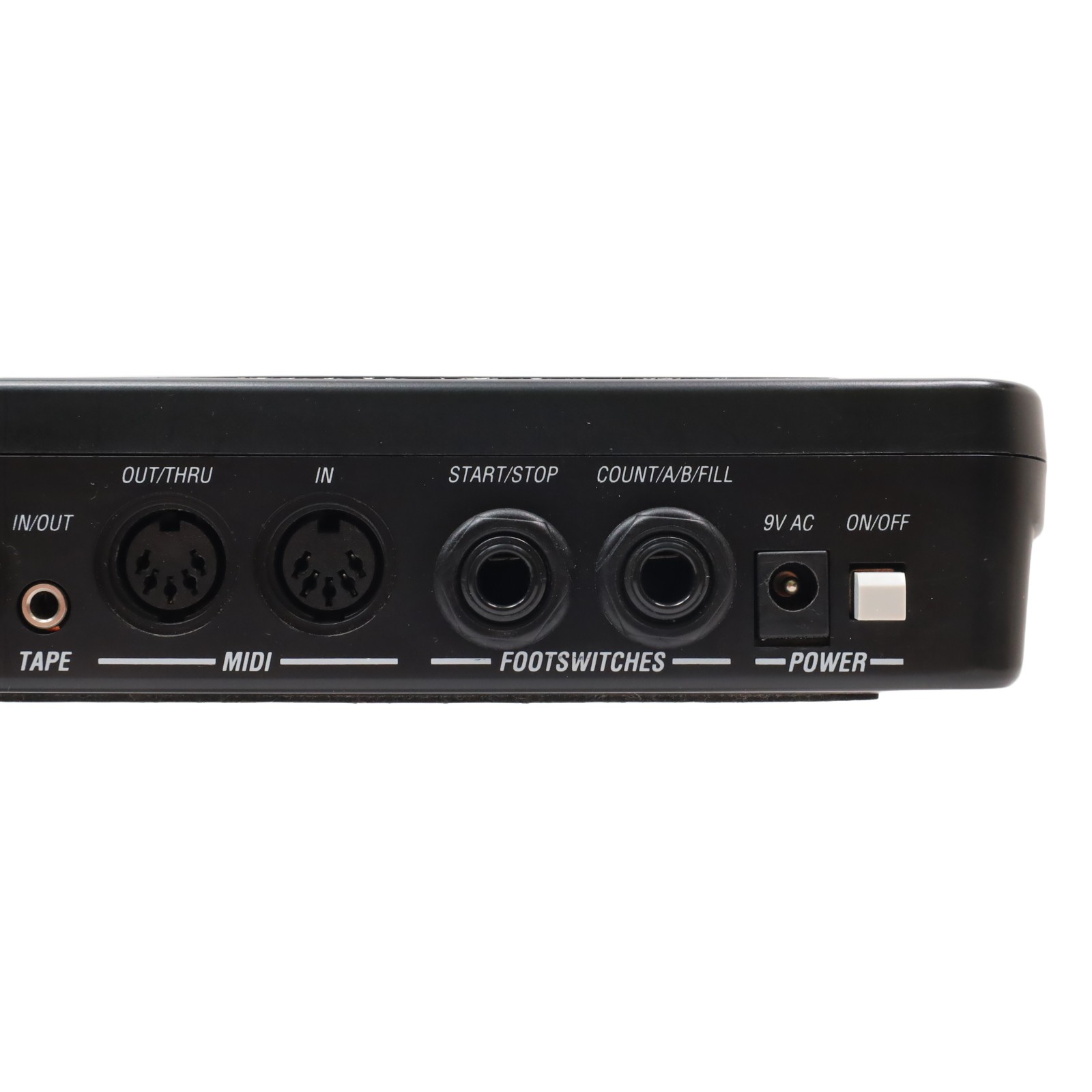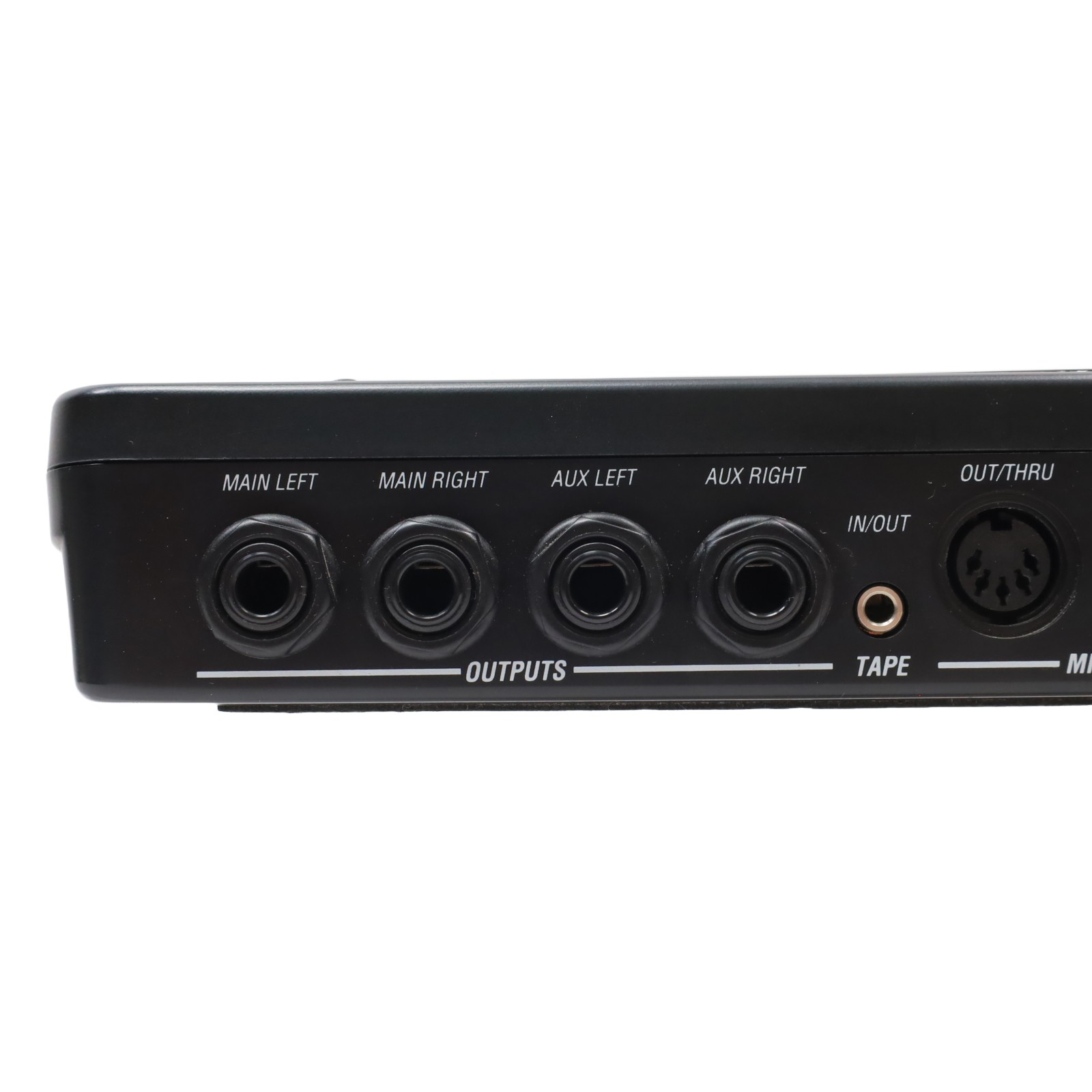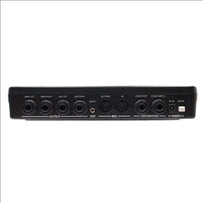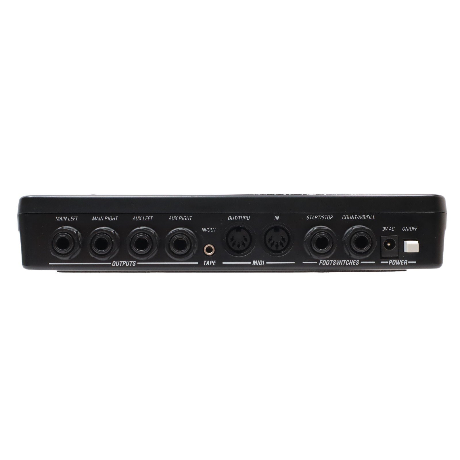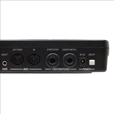 A programmable drum machine suitable for practice, production, and performance. It features a 24-bit sound engine with 233 drum sounds, offering both dry and reverb options. Rhythms can be played directly on 12 velocity-sensitive pads, programmed and edited, or selected from 50 preset patterns created by professional drummers, each with variations and fills. Connectivity includes MIDI in/out/thru for external control, as well as outputs for Main Left, Main Right, Aux Left/Right, and headphones, and dual pedal inputs for start/stop and fill control.