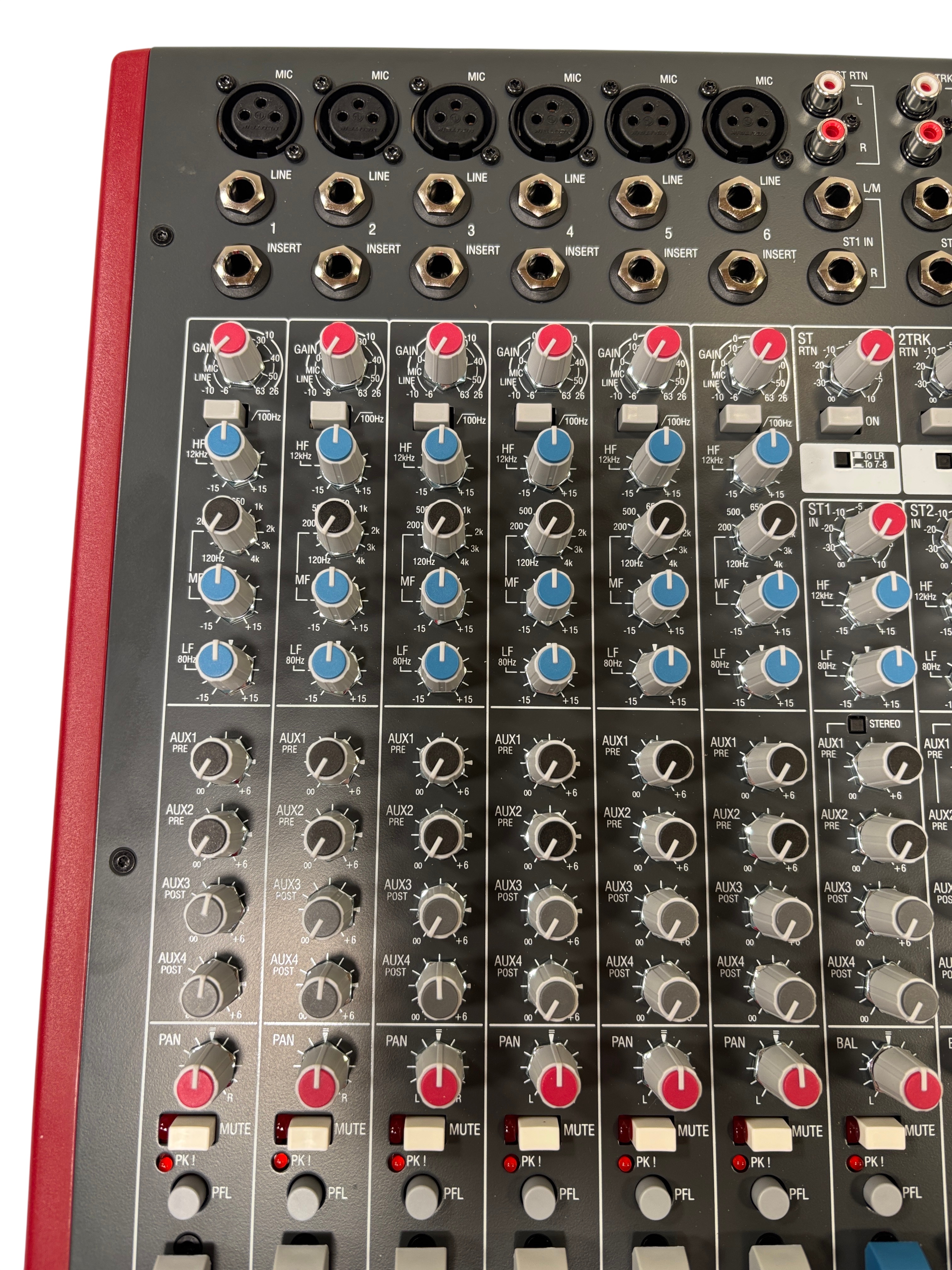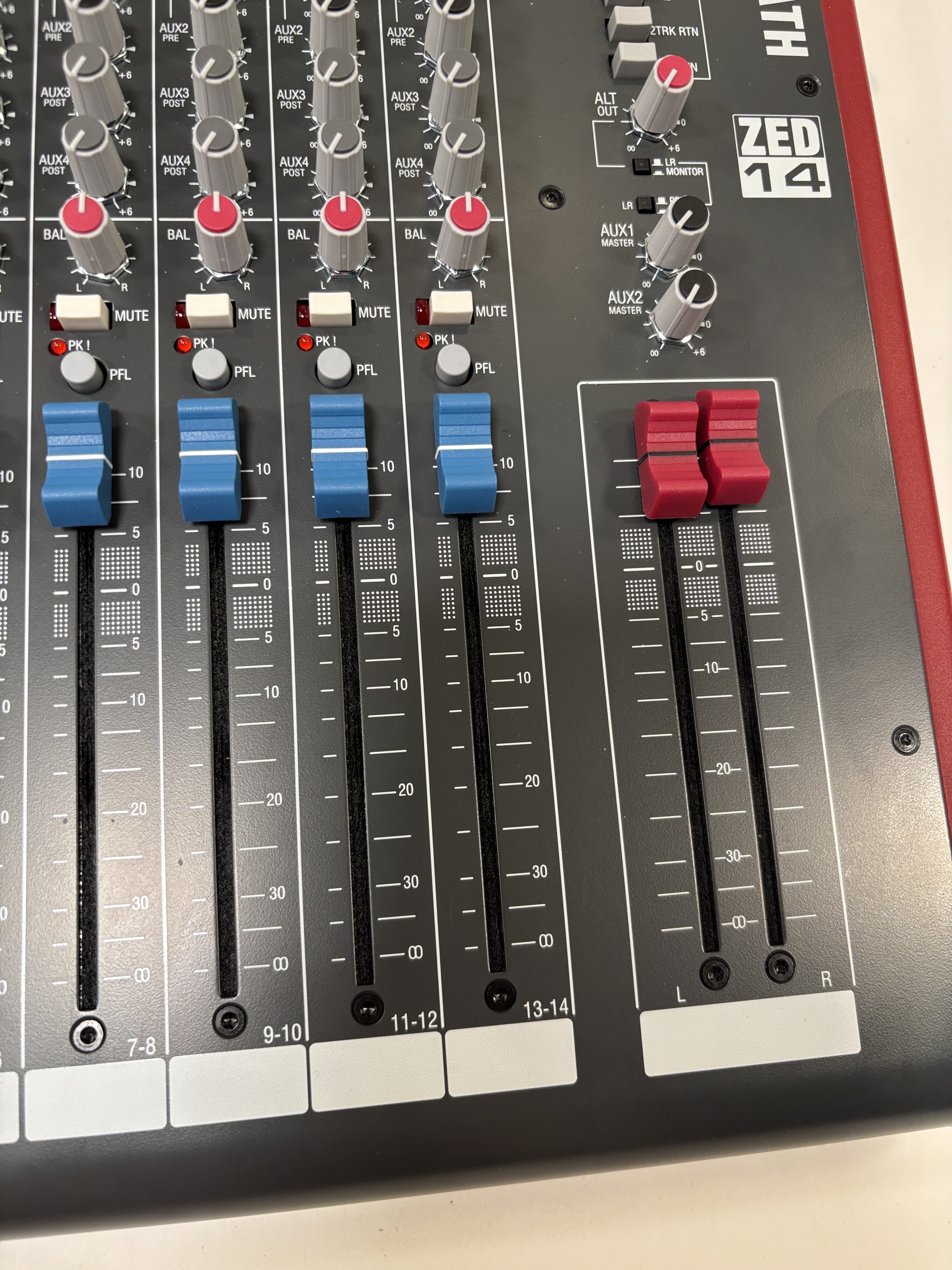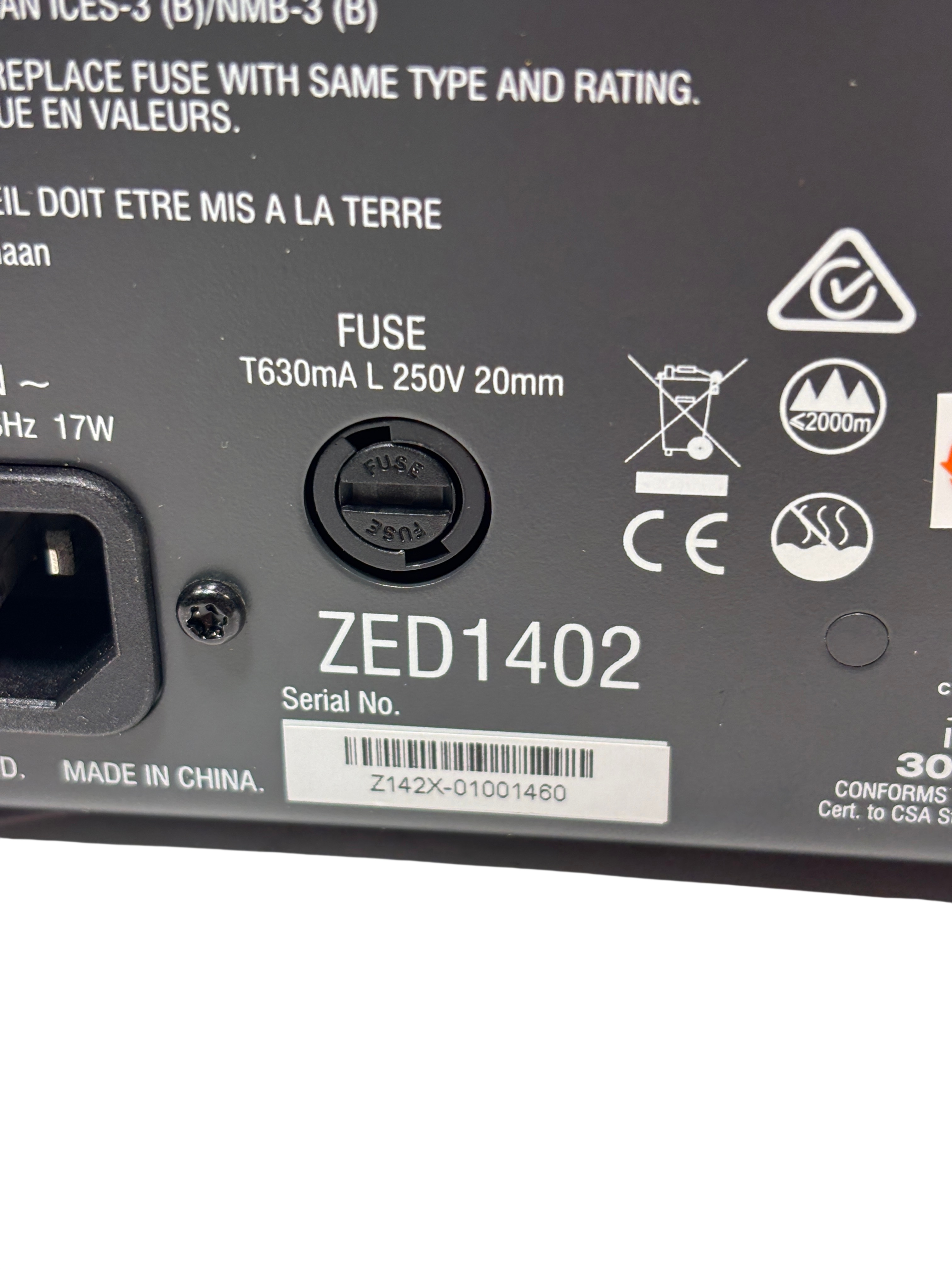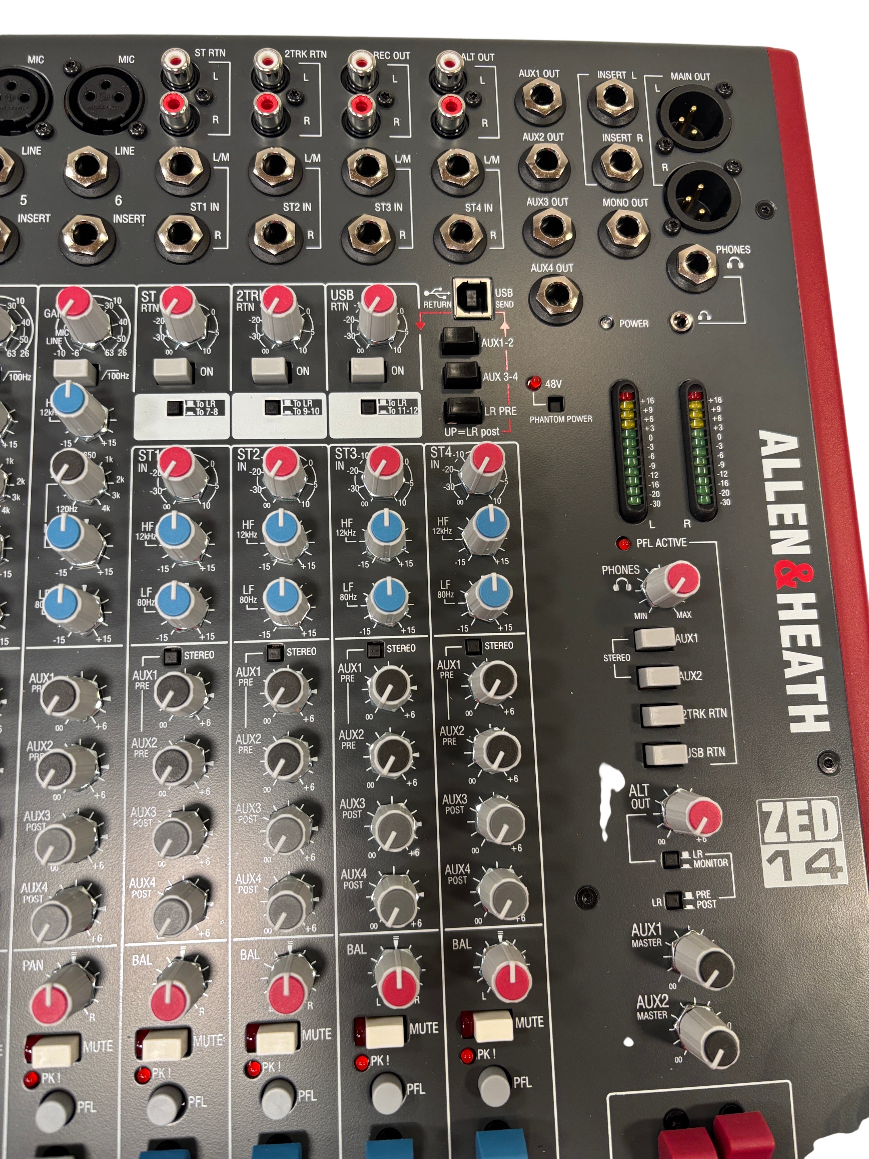 The Allen & Heath ZED1402 Audio Mixer is a versatile 14-channel analog mixing console designed for live sound and studio applications. Featuring 6 mono mic/line inputs with insert points and 4 stereo line inputs, this mixer offers flexible routing and control. It includes 48V phantom power for condenser microphones and a built-in USB interface for seamless recording and playback with your computer. Compact yet robust, the ZED1402 provides multiple aux sends, main XLR outputs, and a headphone output, making it ideal for musicians, podcasters, and sound engineers who need a reliable and feature-rich mixer.