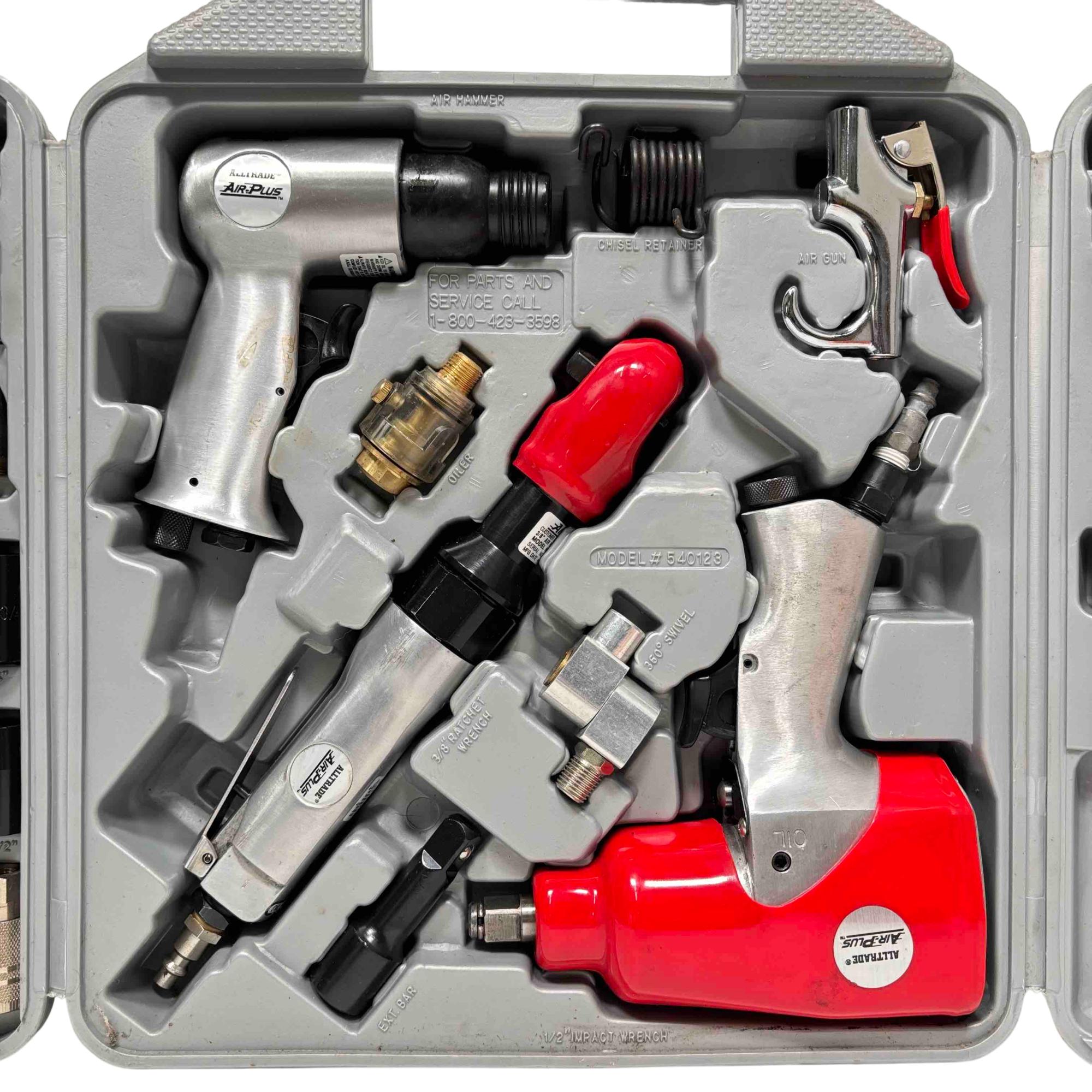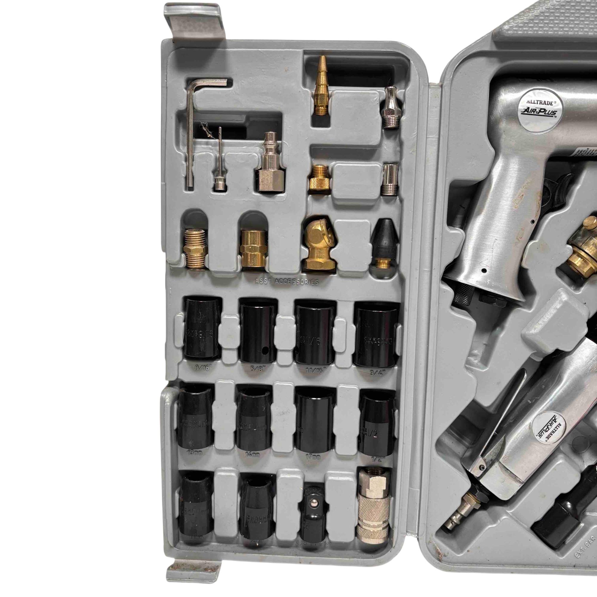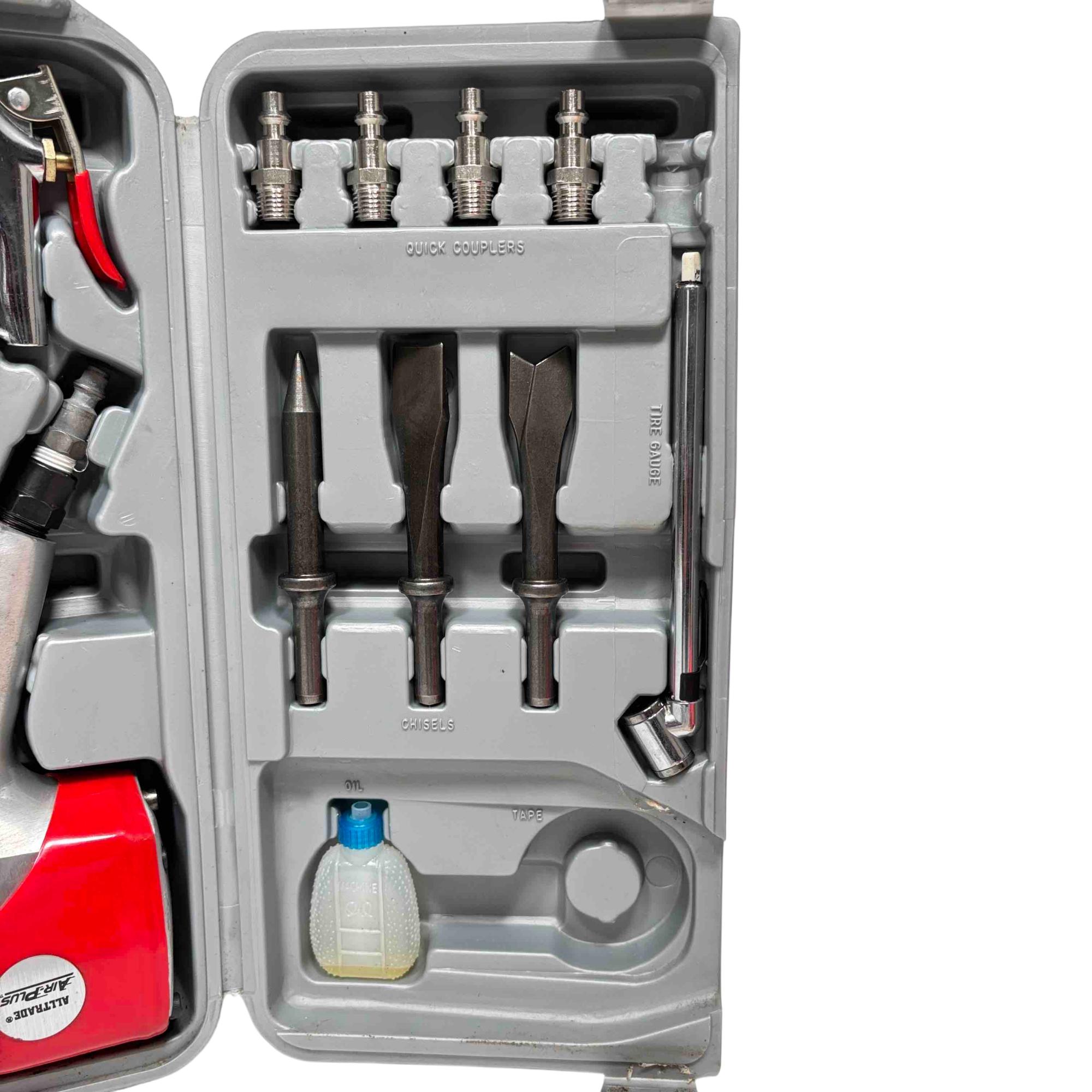 This Alltrade Air-Plus Pneumatic Air Tool Kit (Model 540123) delivers reliable performance for DIYers and professionals alike, featuring a 3/8" air ratchet wrench, air hammer, air gun, quick couplers, chisel set, sockets, and assorted accessories. The durable tools, paired with their convenient carrying case, ensure youre prepared for a variety of automotive, workshop, or household tasks. Lightly used, this set offers outstanding value and versatility at a fraction of the original price.
