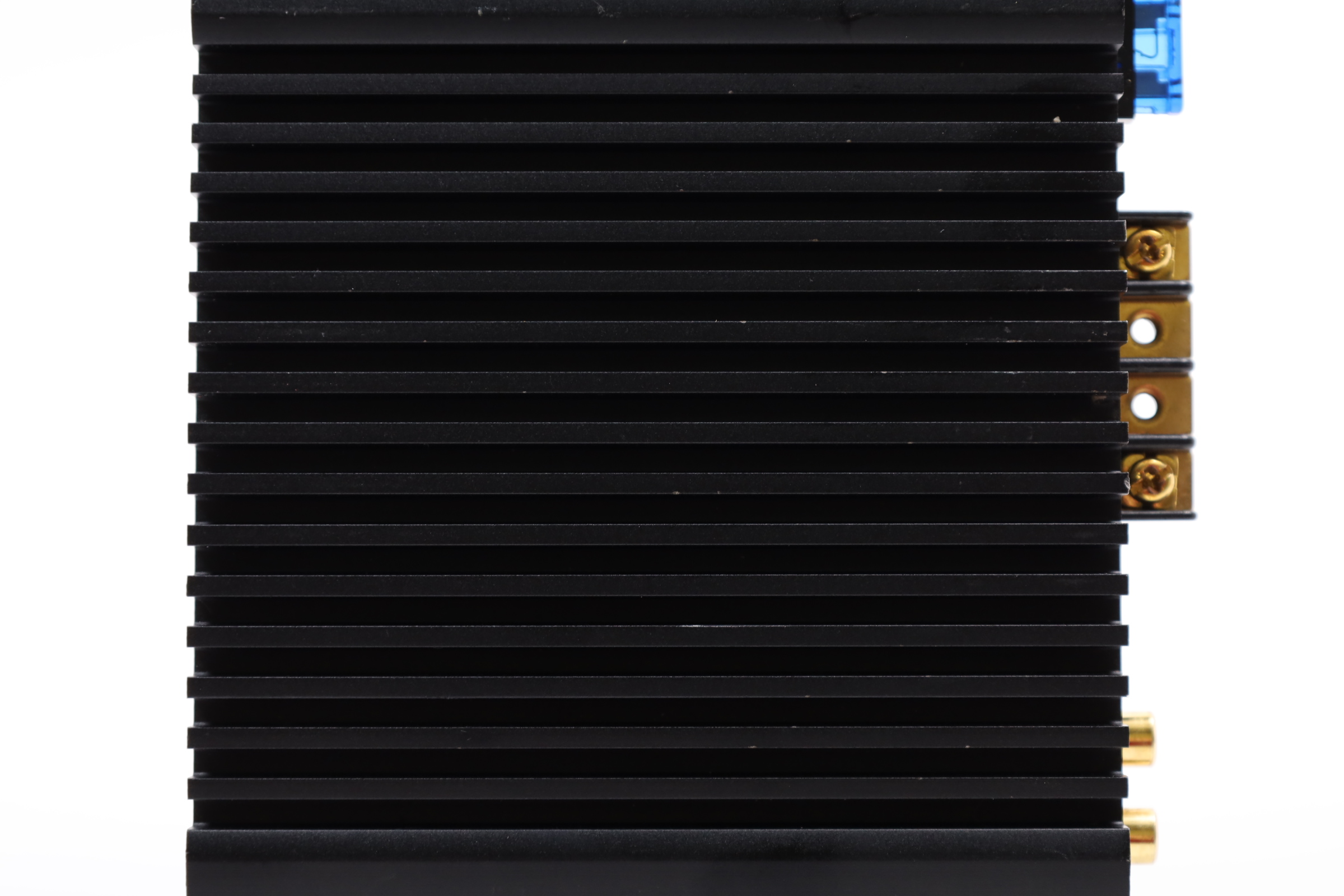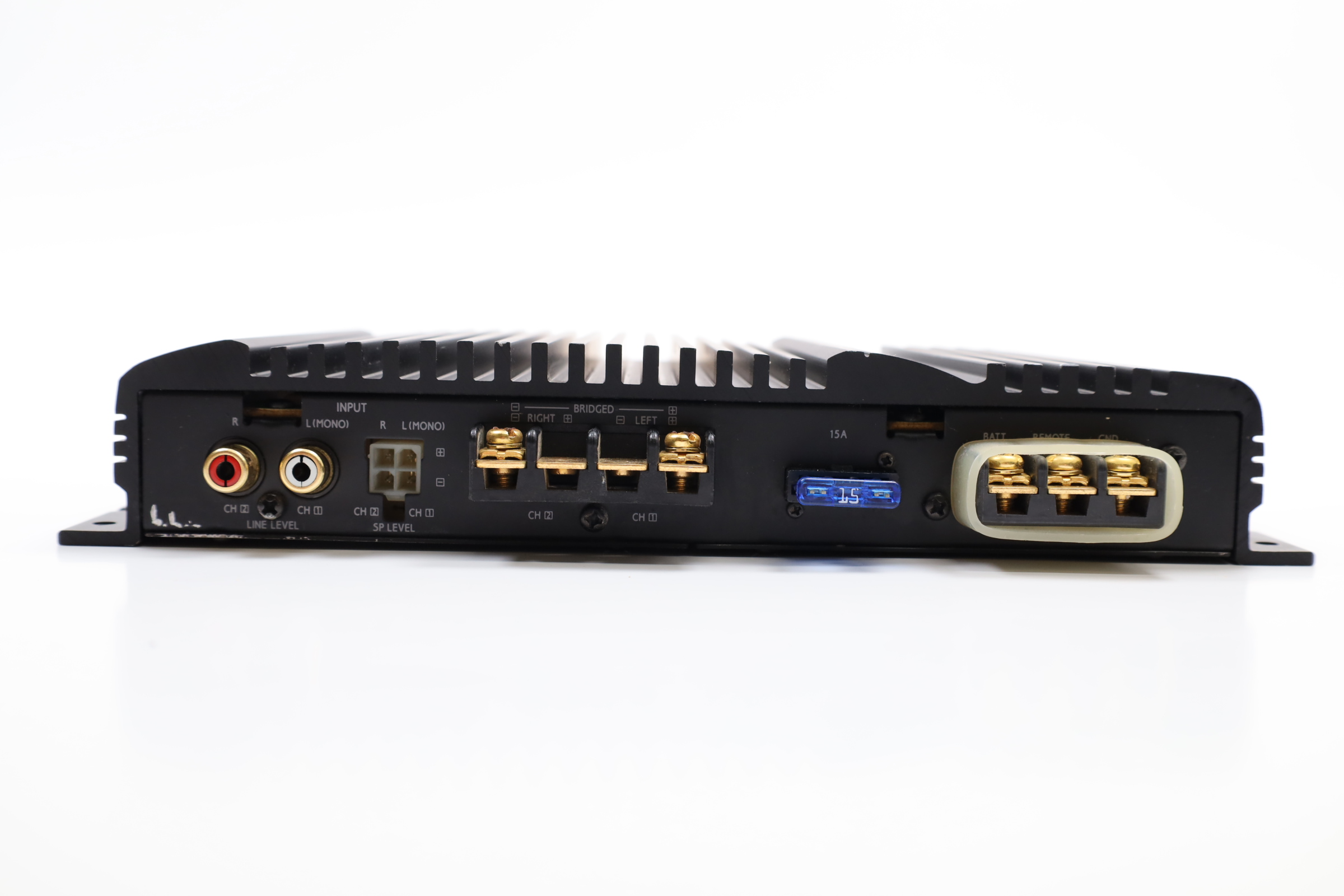 A bridgeable power amplifier capable of delivering 1 × 37 watts on a single channel at 4 Ohms, and 2 × 33 watts across channels 1 and 2 at 4 Ohms, with an efficiency of 57.6% and a current consumption of 8.5A. When bridged, it can provide 1 × 83 watts across channels 1 and 2 at 4 Ohms, with an efficiency of 45.4% and a current consumption of 13.5A, amounting to a total power output of 83 watts.