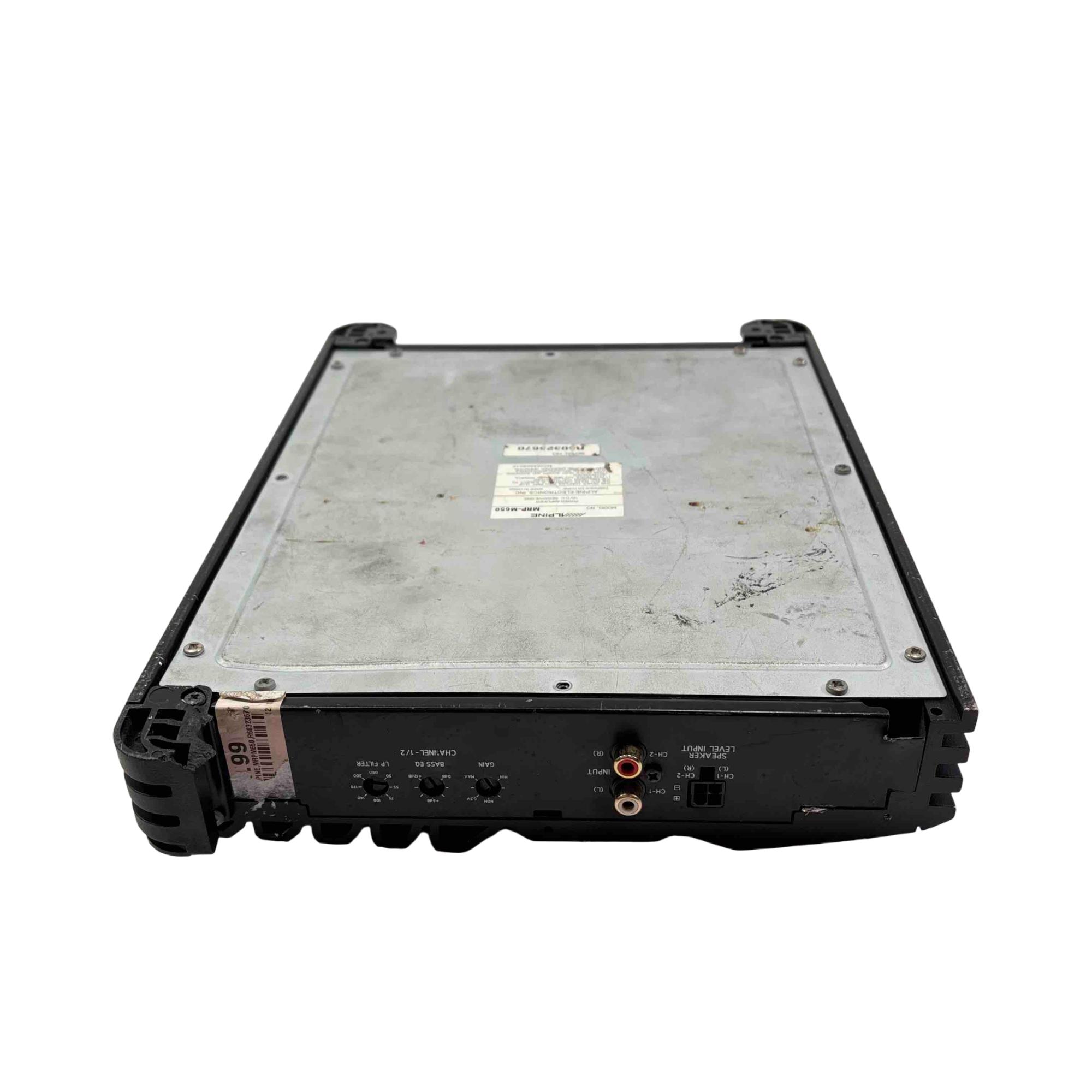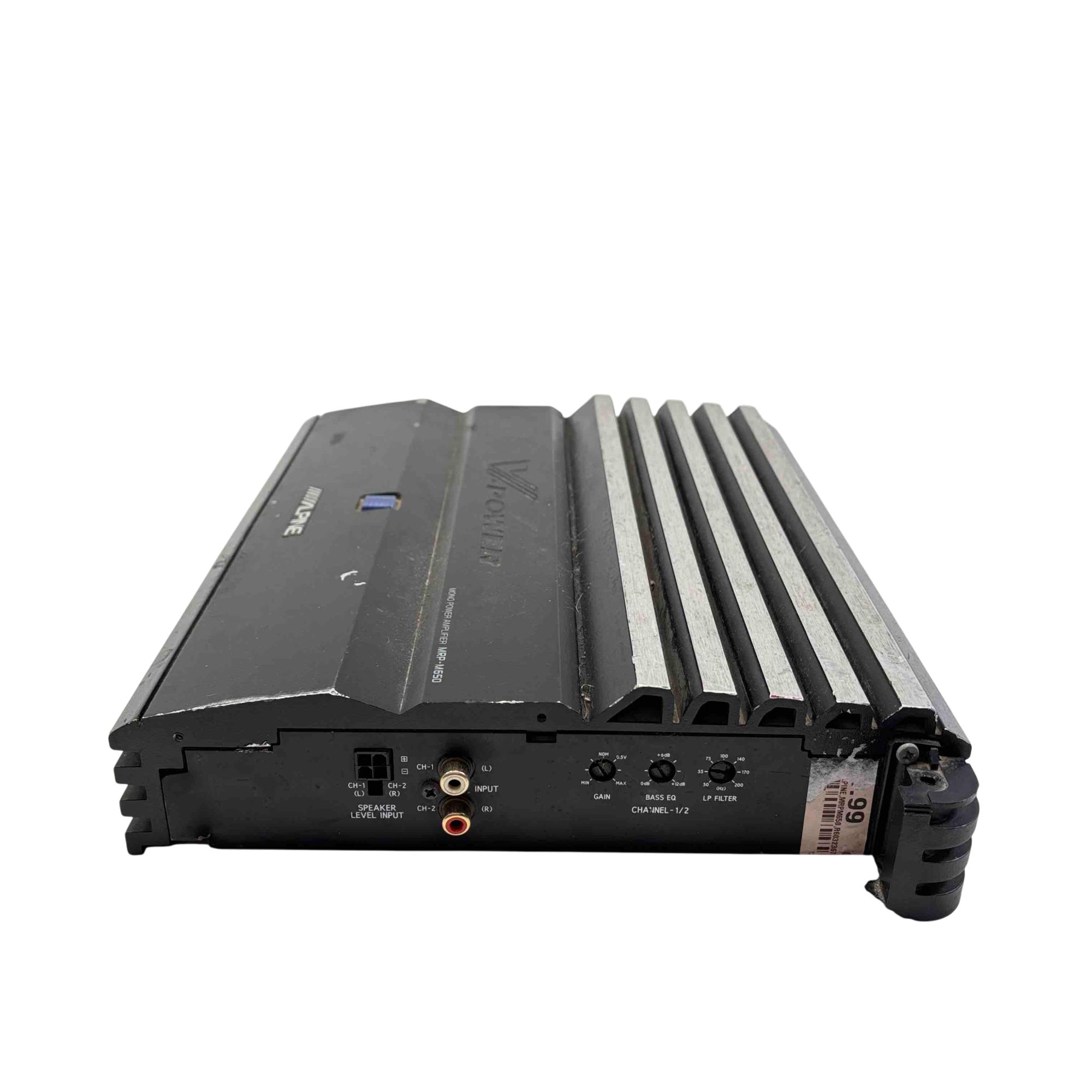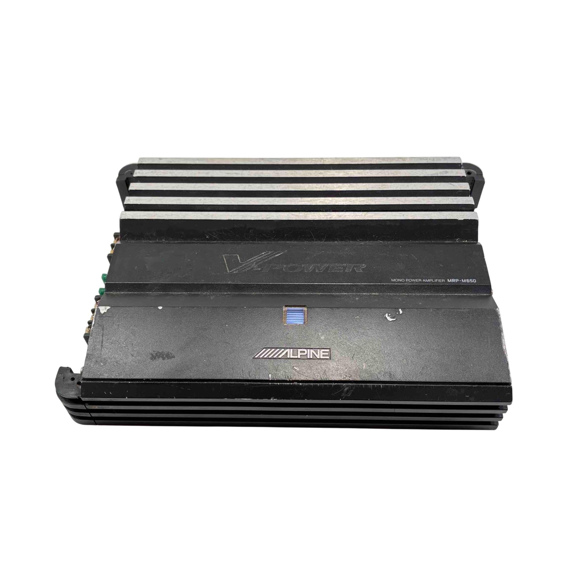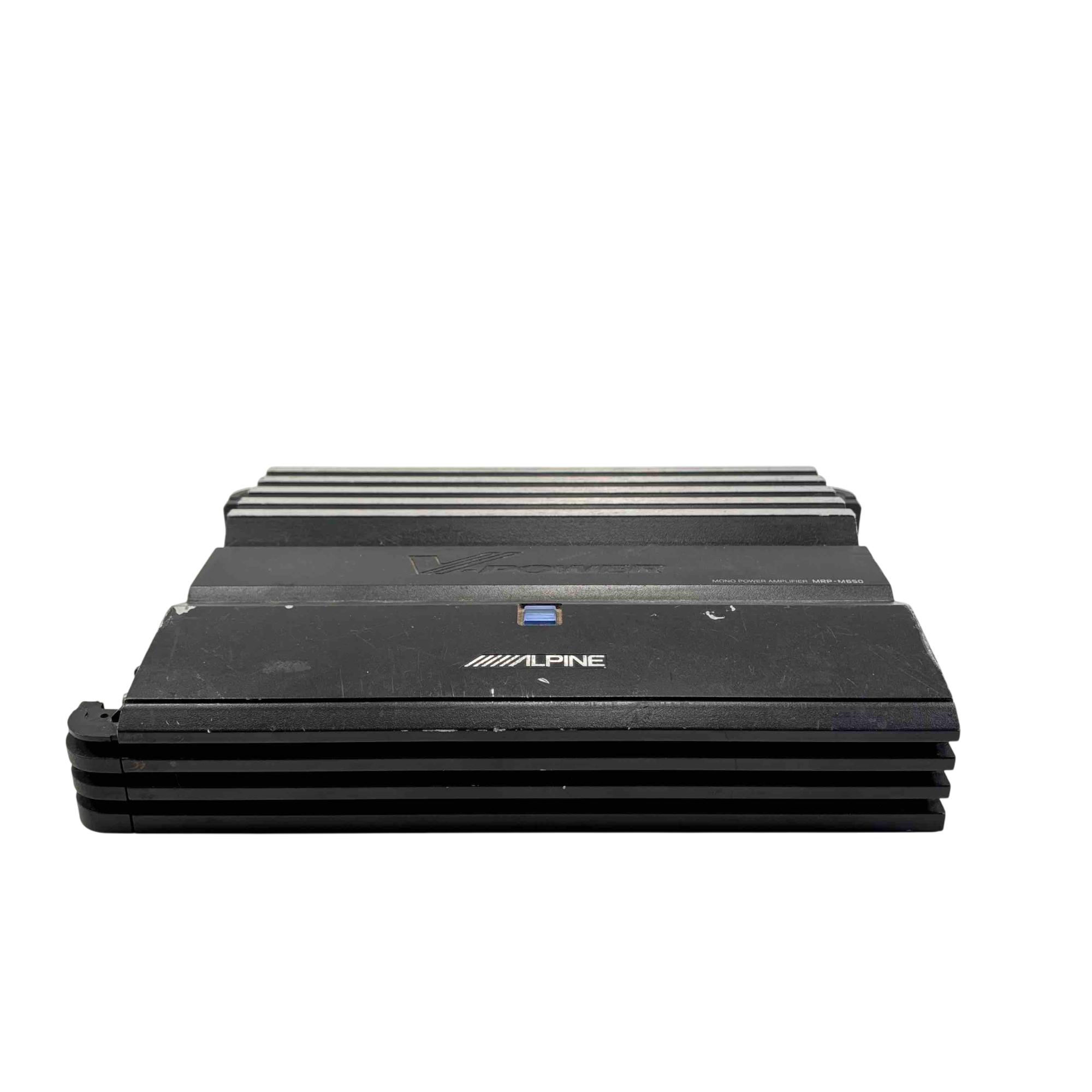 Alpine V-Power MRP-M650 Mono Power Amplifier is a high-performance car audio amplifier designed for powerful mono subwoofer output. Featuring a sleek black rectangular design with blue and white controls, this Alpine amplifier delivers clean and efficient power for enhanced audio clarity in automotive sound systems.
