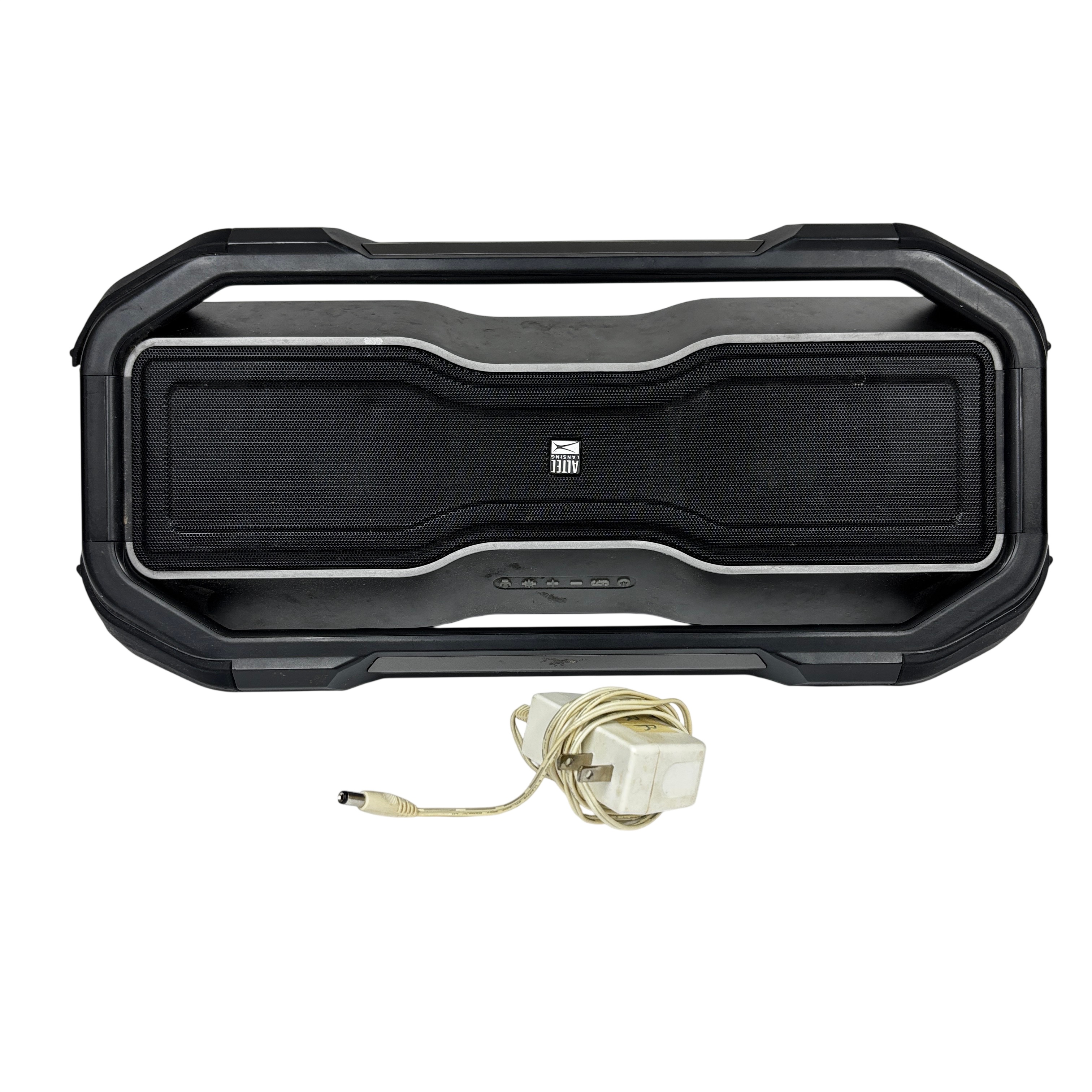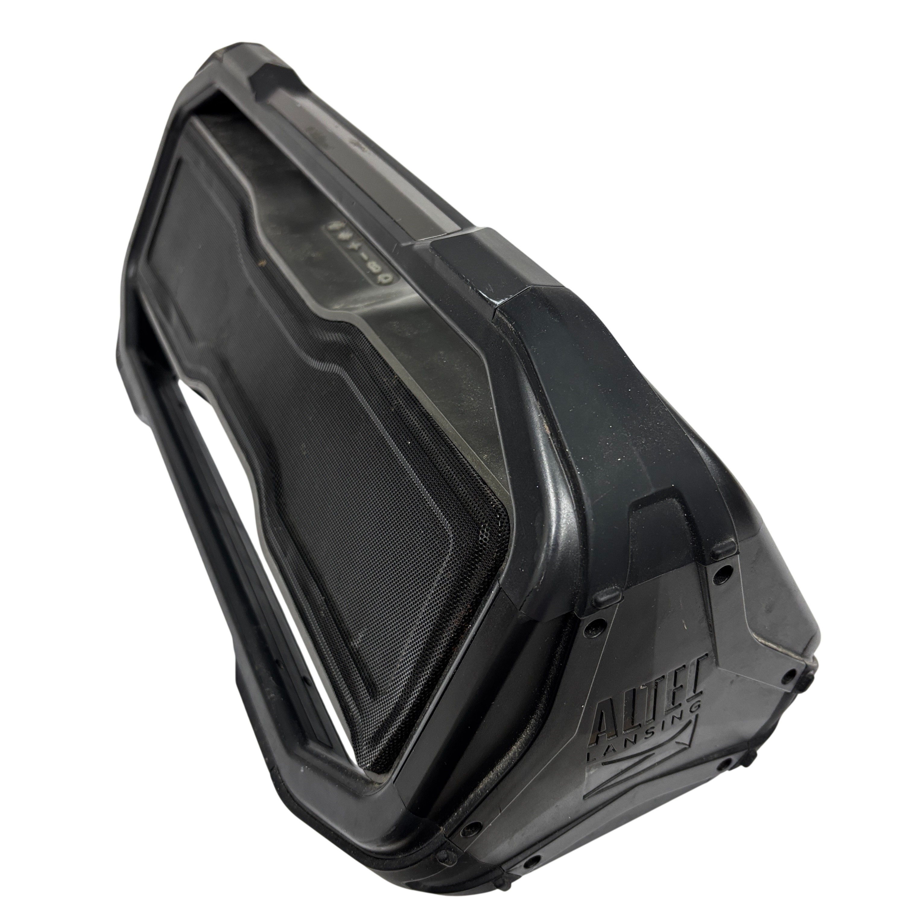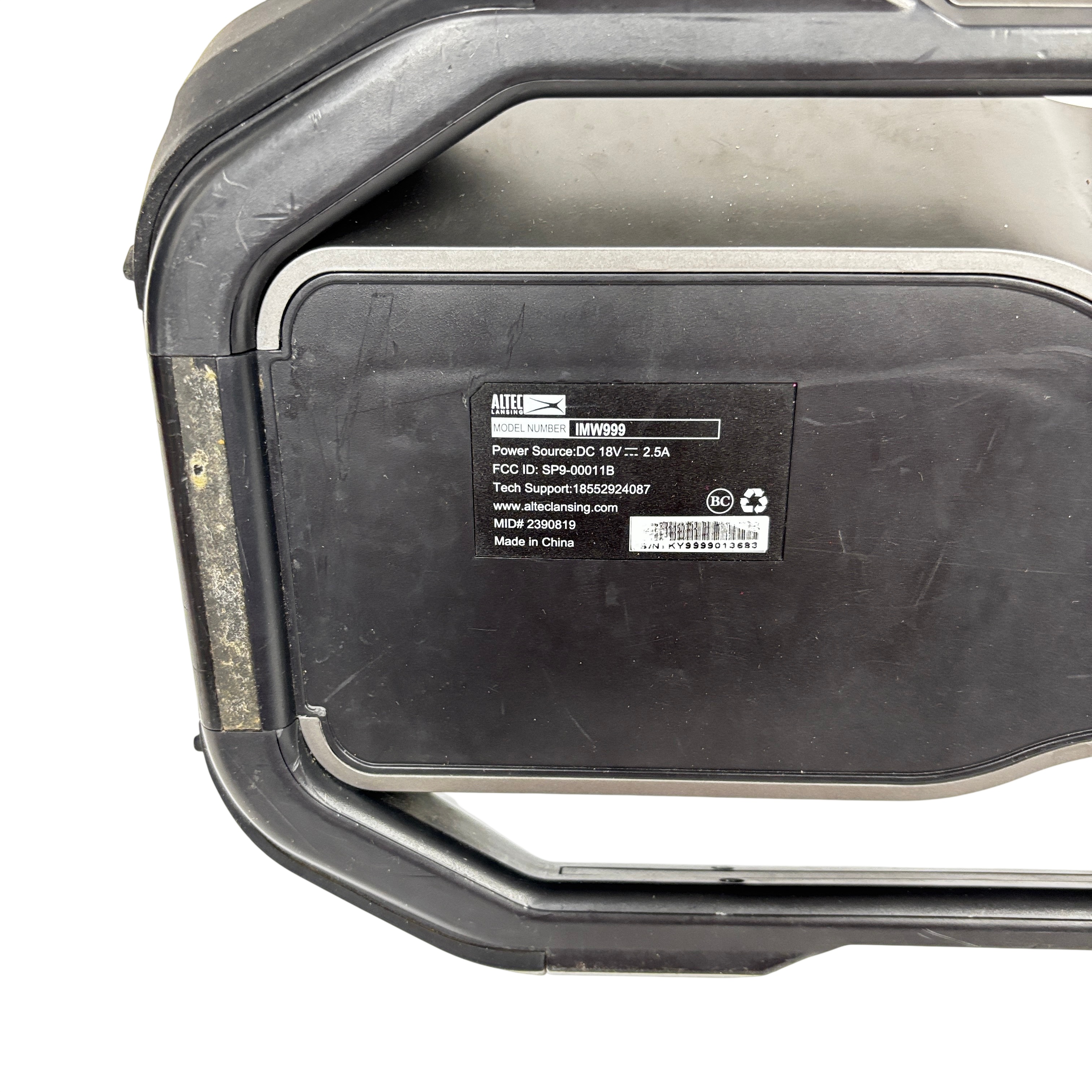 The Altec Lansing Rockbox IMW999 is a portable speaker designed for powerful audio output with a rugged and durable build. Operating on an 18V DC power source at 2.5A, this speaker delivers clear sound performance suitable for indoor and outdoor use. Included with the speaker is the original power adapter for convenient plug-in operation. Its compact size and integrated handle make it easy to carry, making it an ideal choice for music lovers seeking portability and reliable sound.