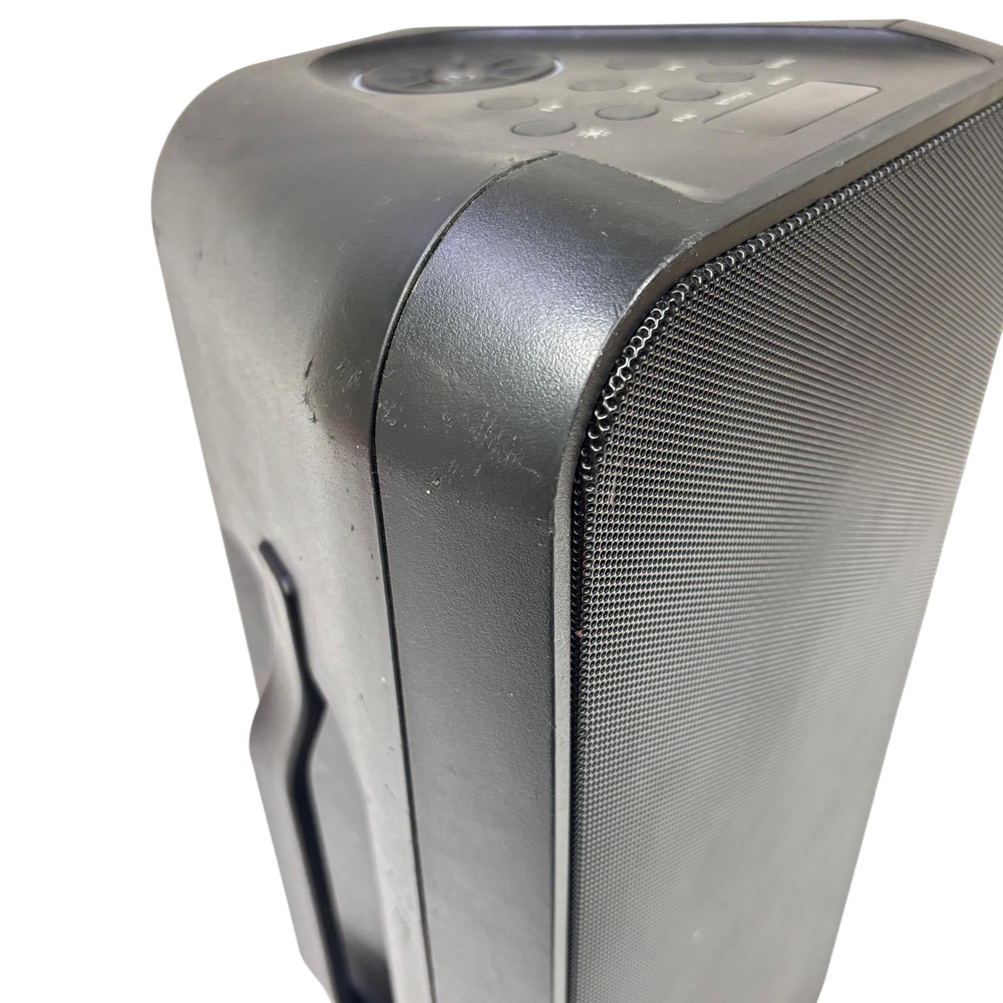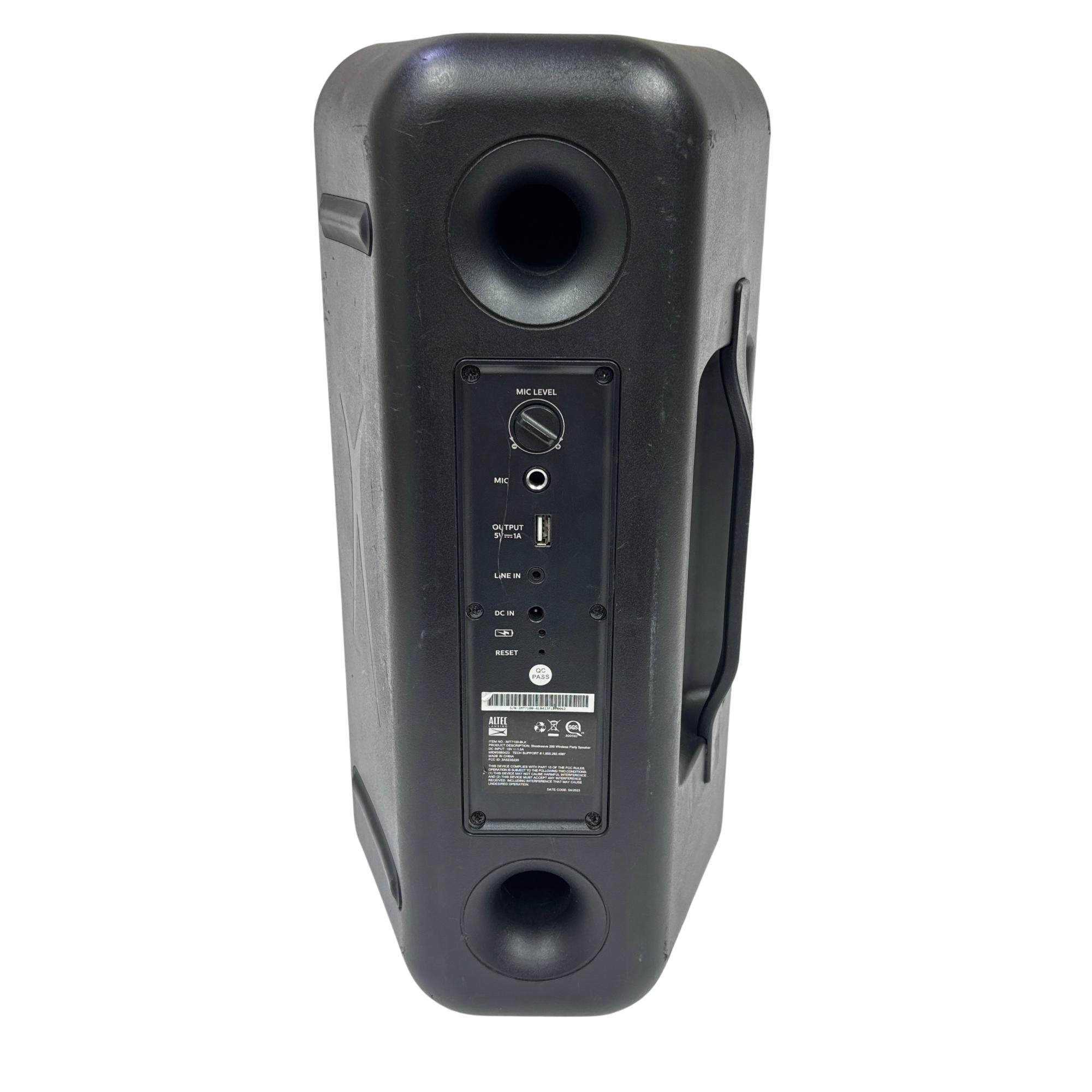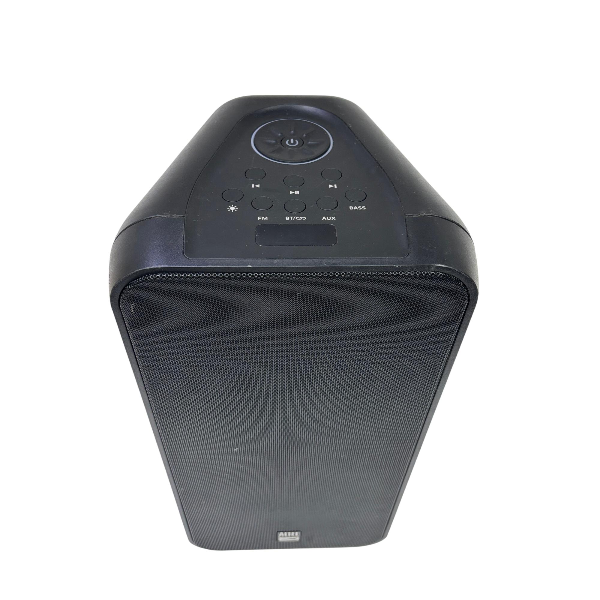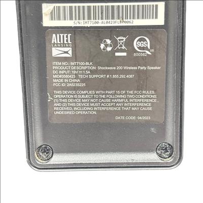 This Altec Lansing IMT7100BLK Shockwave 60W Wireless Bluetooth Party Speaker delivers powerful and immersive sound with 60 watts of output for dynamic audio performance. This black rectangular speaker features a sturdy handle for portability and includes multiple input options such as microphone, line-in, and DC power connections. Designed for versatile use, it provides clear audio for parties and events with advanced interference reduction technology.