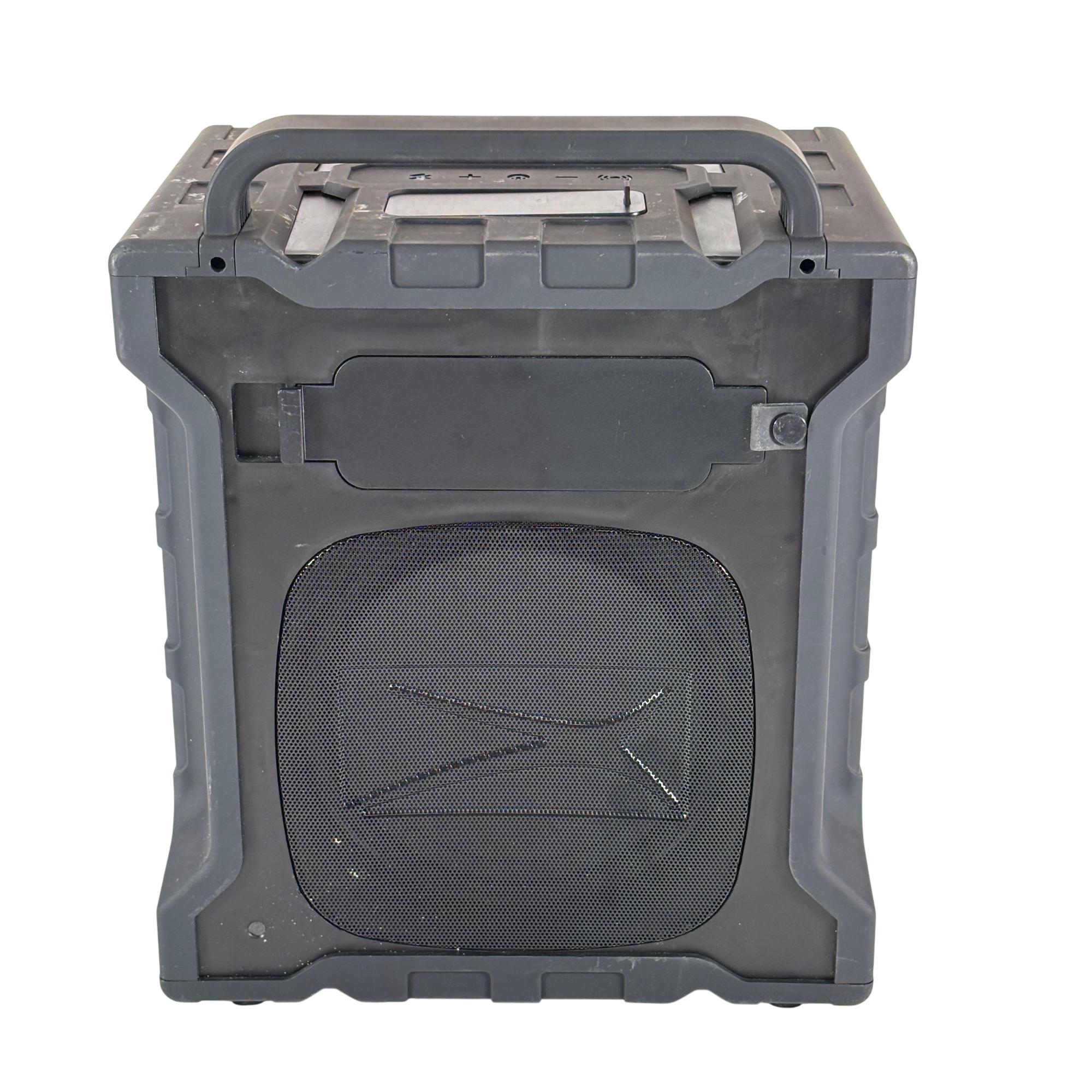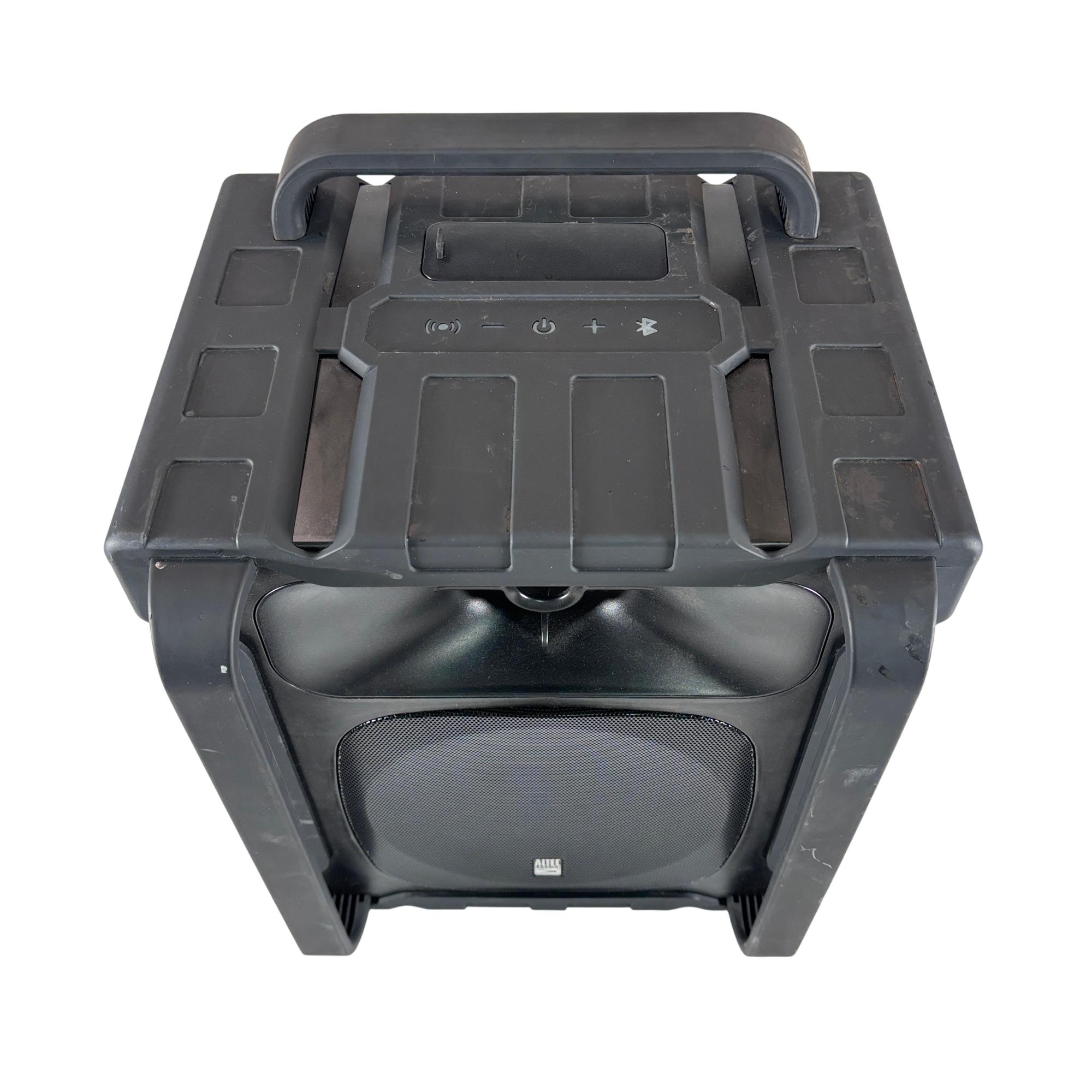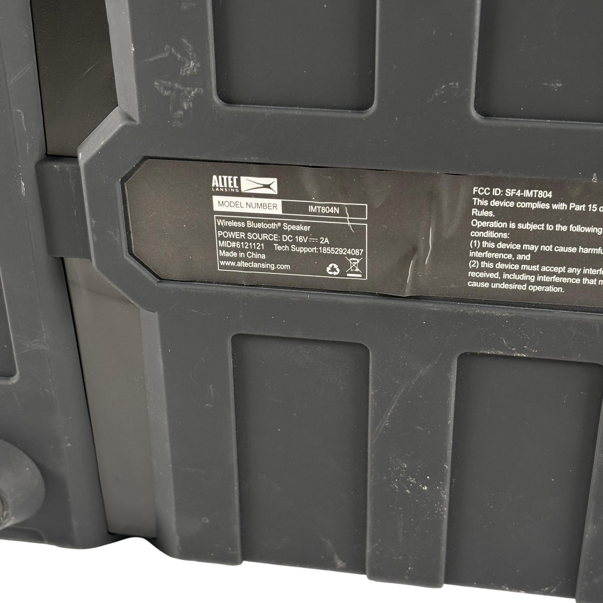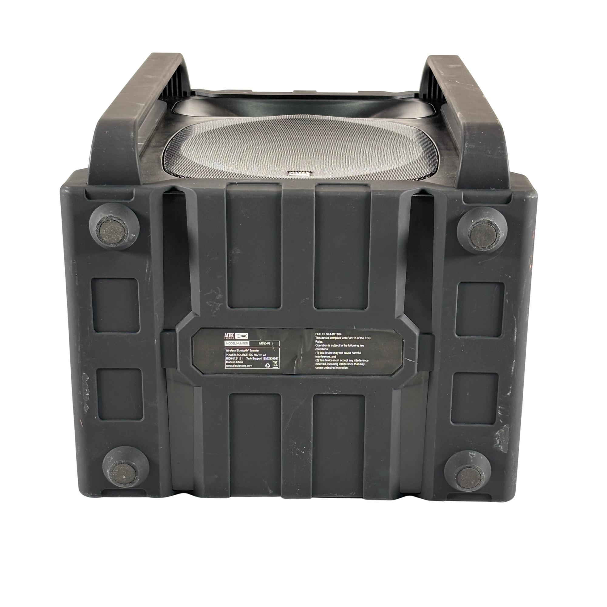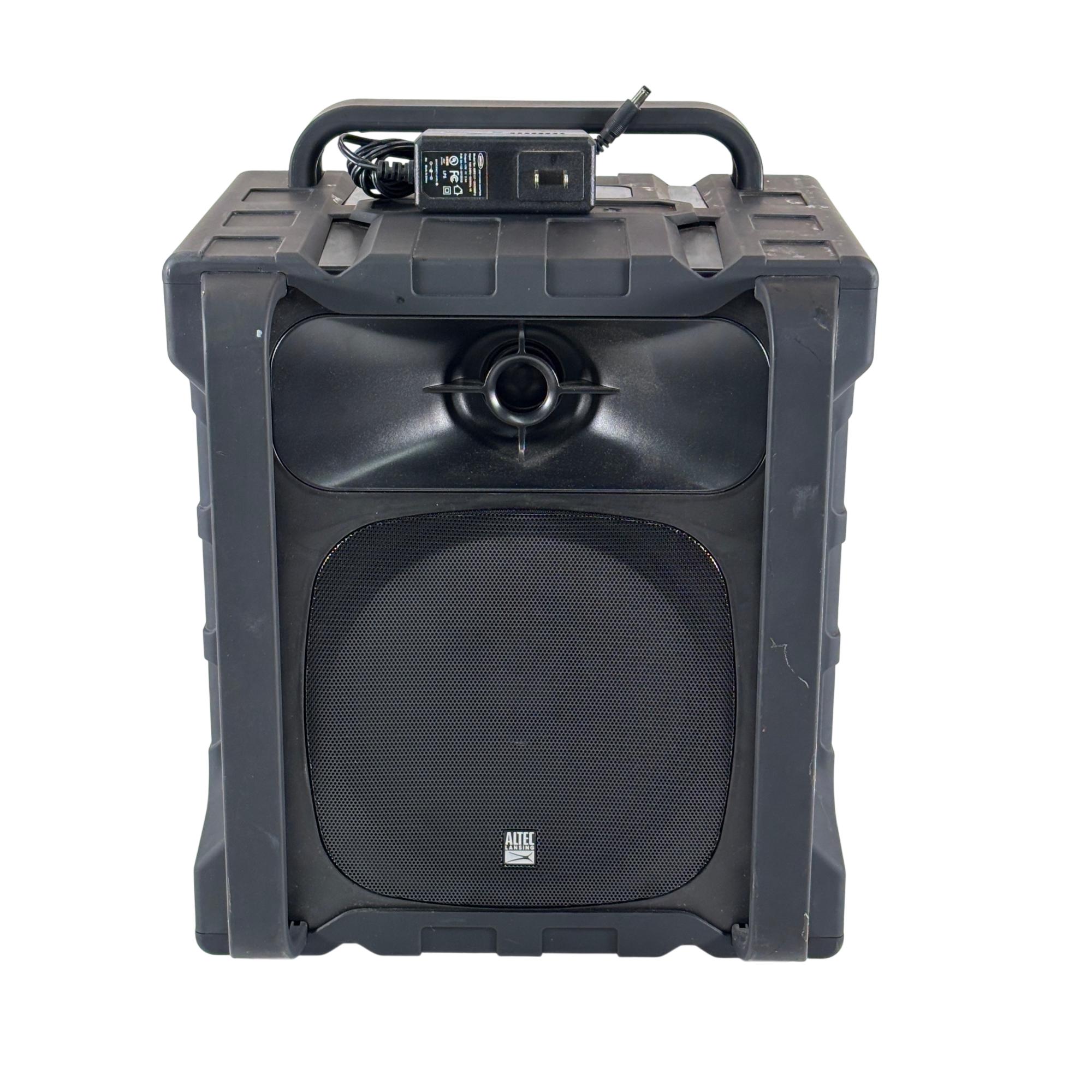The Altec Lansing Sonic Boom IMT804N Rechargeable Bluetooth Portable Speaker delivers a 50-foot wireless range with a waterproof, dustproof, and shock-resistant design that floats. It includes a carry handle, three smartphone charging ports, and a waterproof compartment for phone storage.