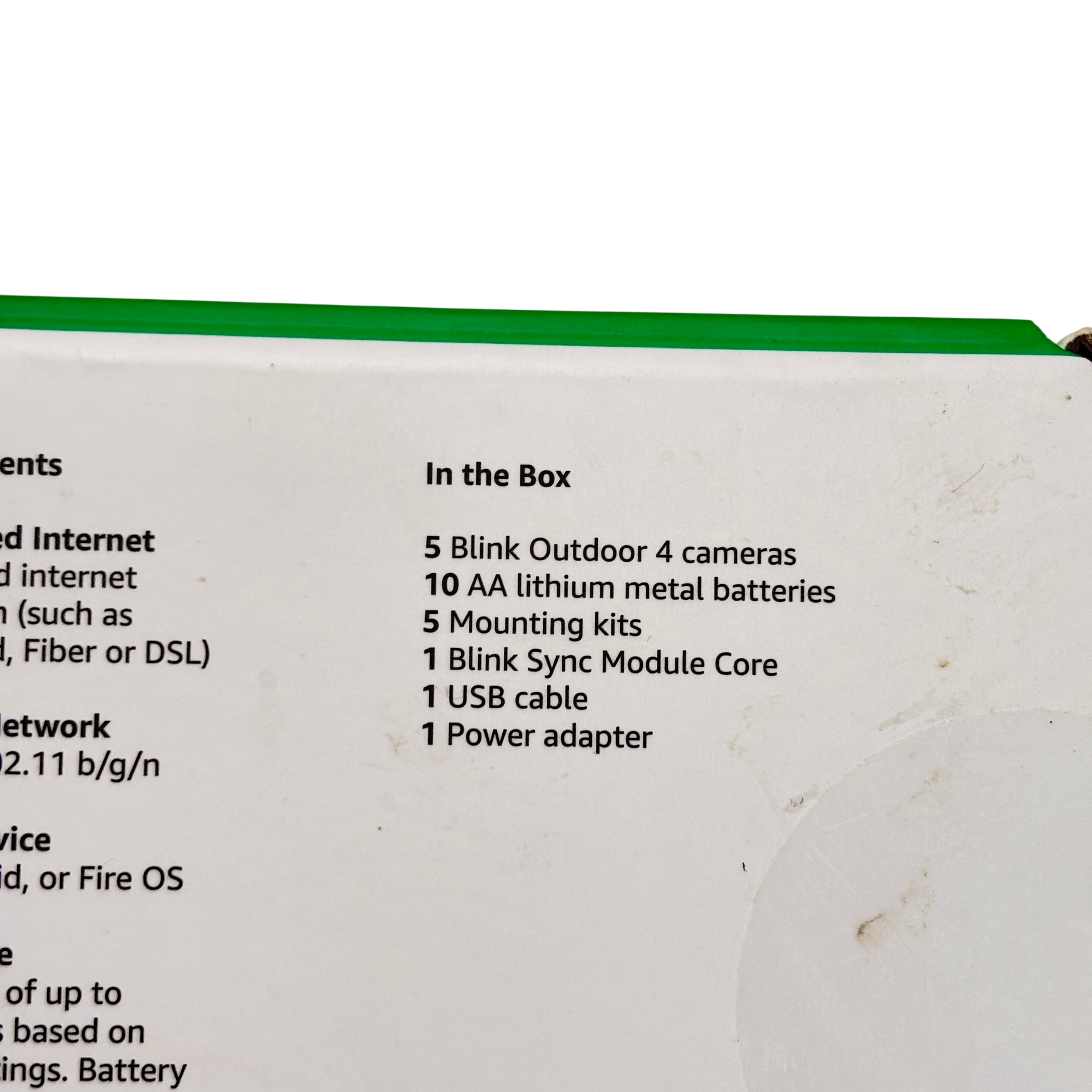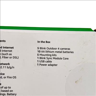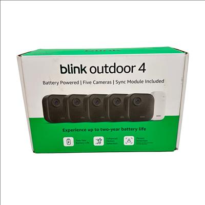 Amazon Blink Outdoor 4 Security Camera System offers a comprehensive battery-powered solution for outdoor surveillance. This system includes five weather-resistant cameras, each powered by AA lithium metal batteries, providing up to two years of battery life. The package also features a Blink Sync Module Core for seamless connectivity, along with mounting kits, a USB cable, and a power adapter. Designed for enhanced motion and person detection, this system ensures reliable security monitoring in various weather conditions.