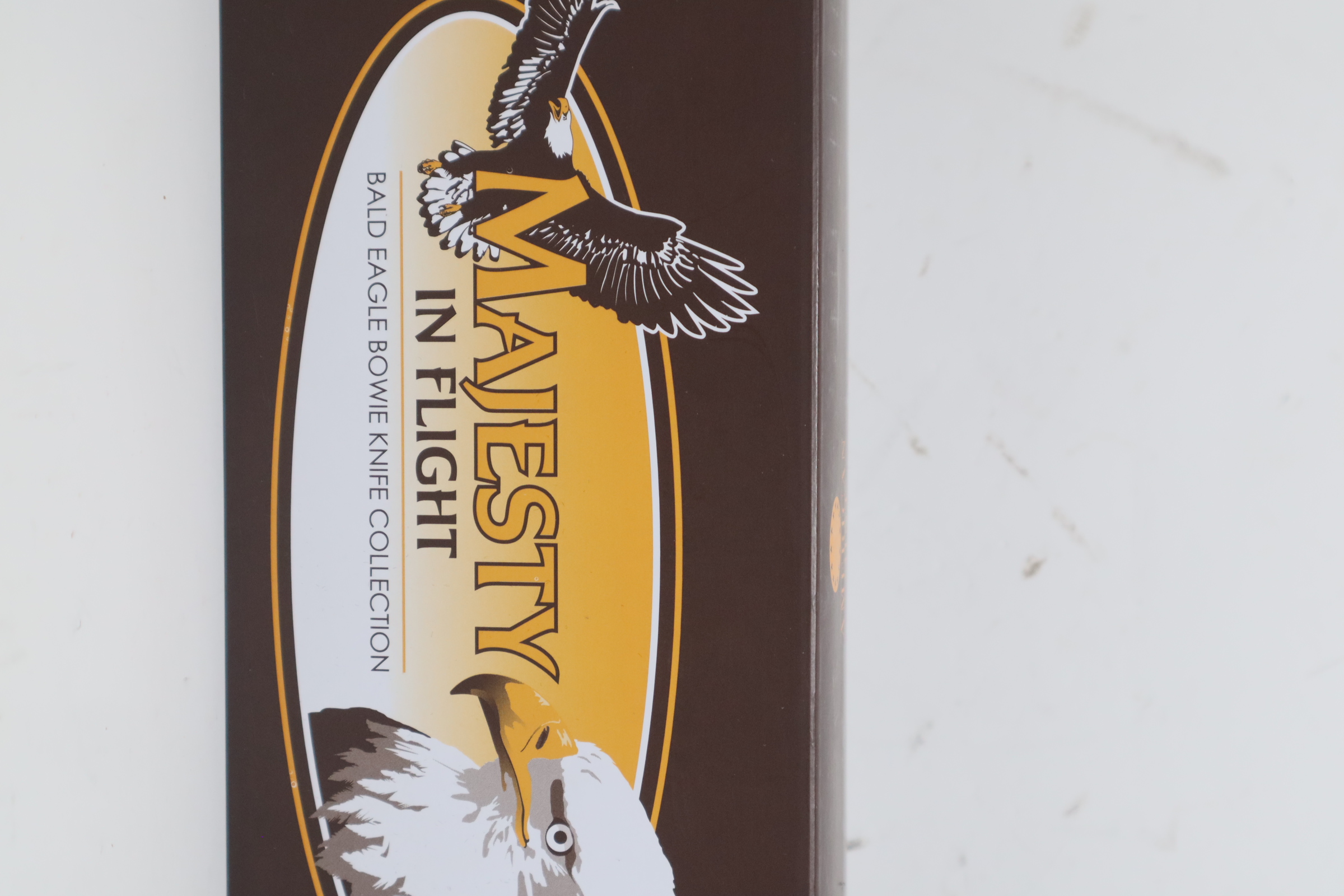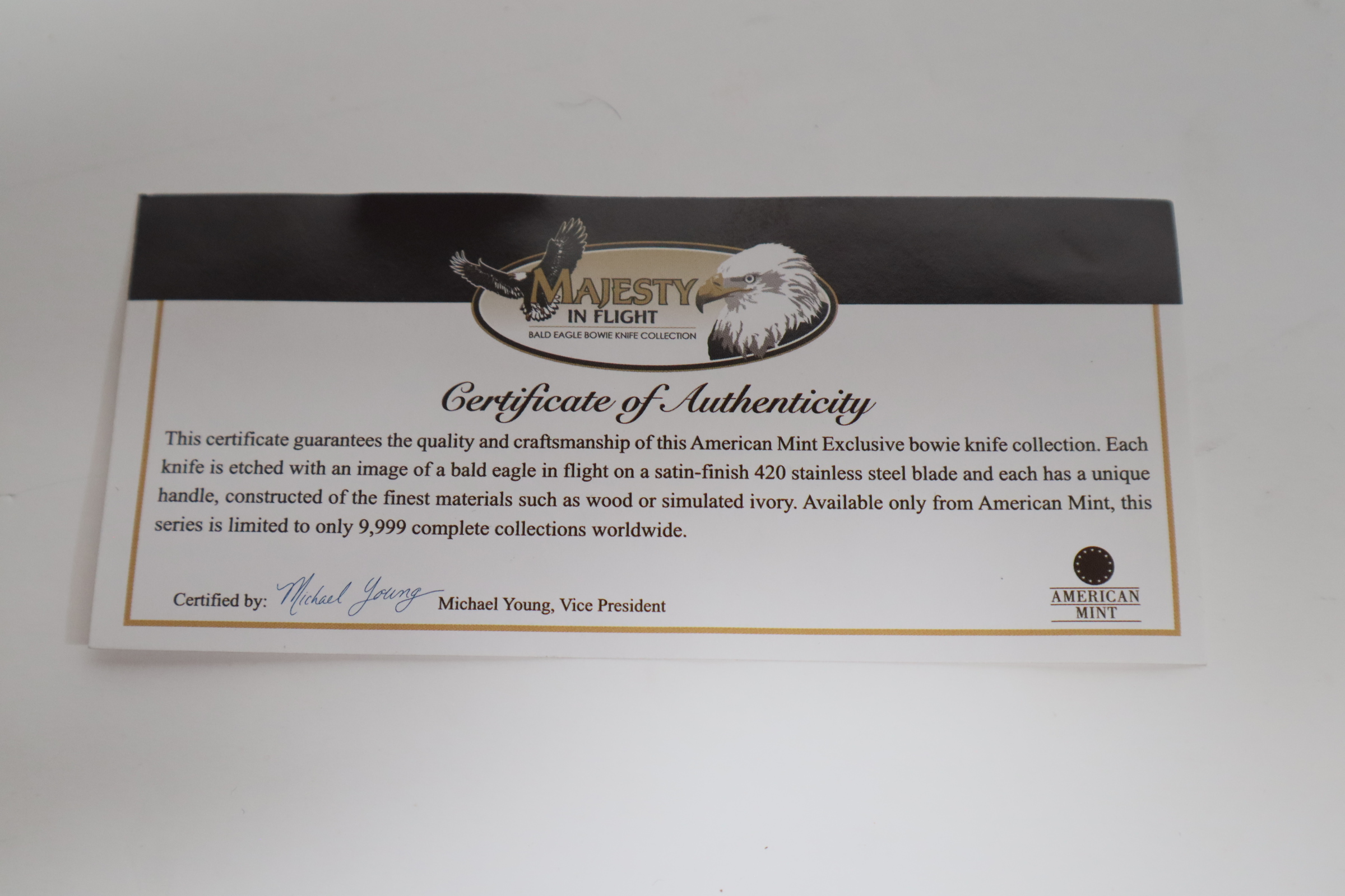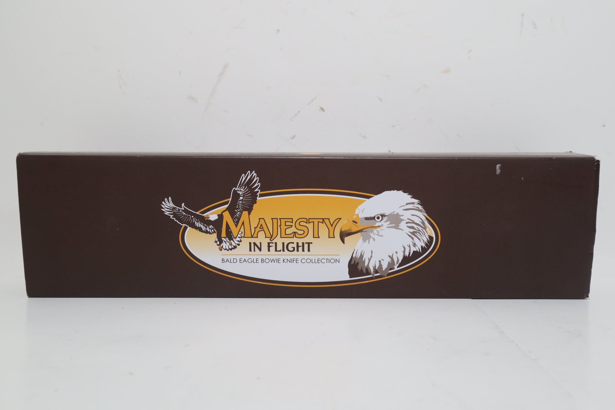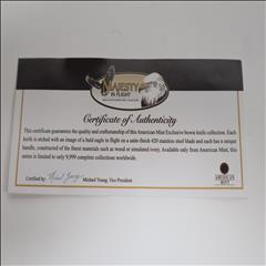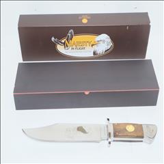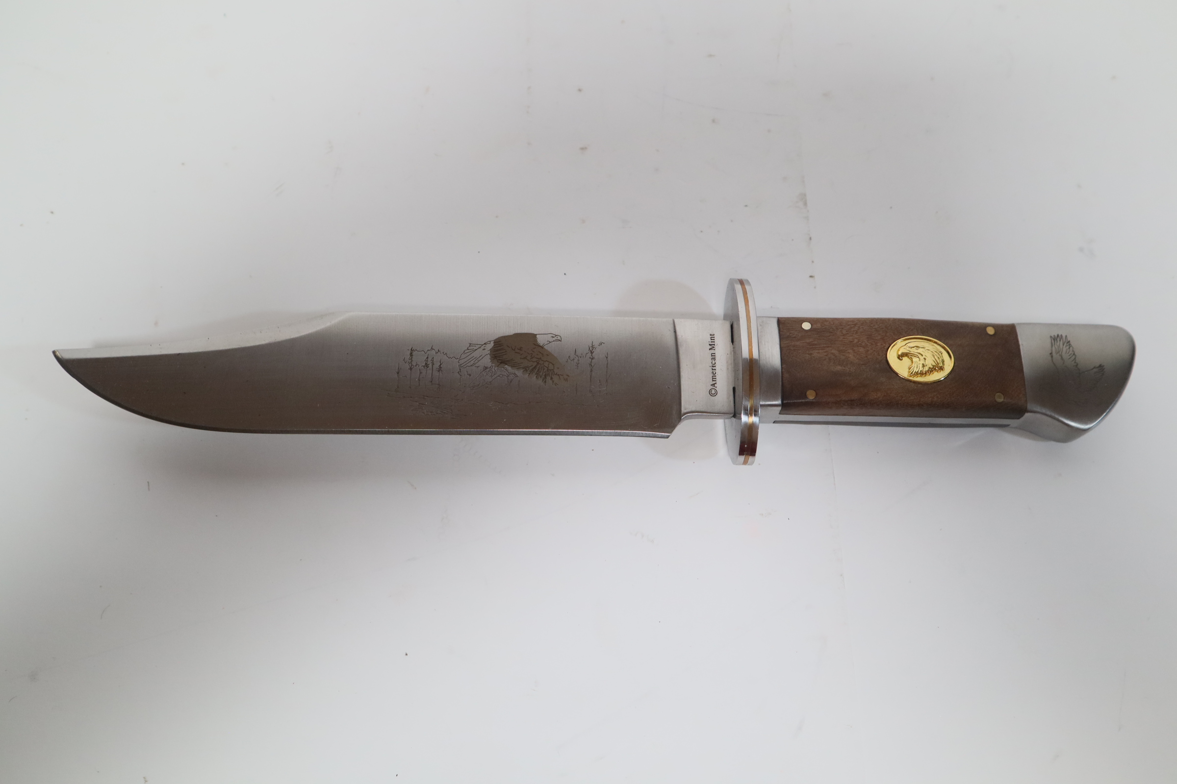Available exclusively from American Mint, this magnificent bowie knife celebrates the American spirit that is embodied by our national bird - the Bald Eagle. Crafted in 420 stainless steel, the Bald Eagle - On the Hunt bowie knife measures 12.75" in length with a 7.34" flat-ground blade. The polished blade features a stirring image of a majestic eagle in its natural habitat. A second eagle is laser-etched on the pommel of the silver steel handle which has brilliant golden-finished accents. A golden-finished Bald Eagle medallion is expertly hand-set in the burl wood grip.