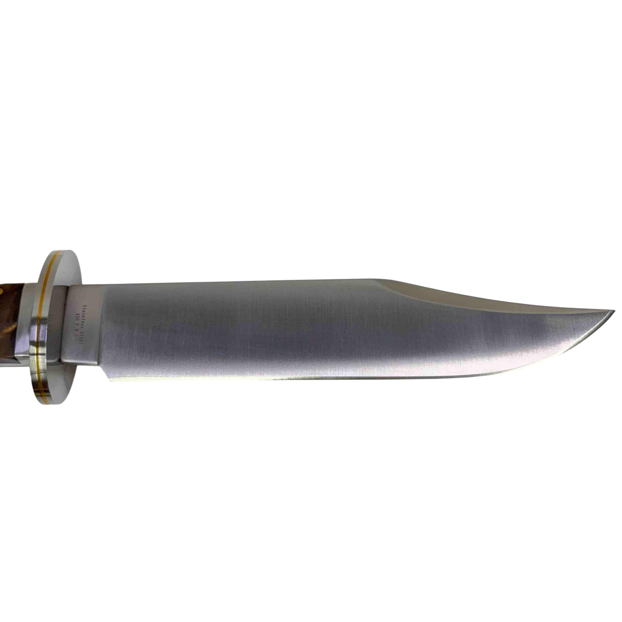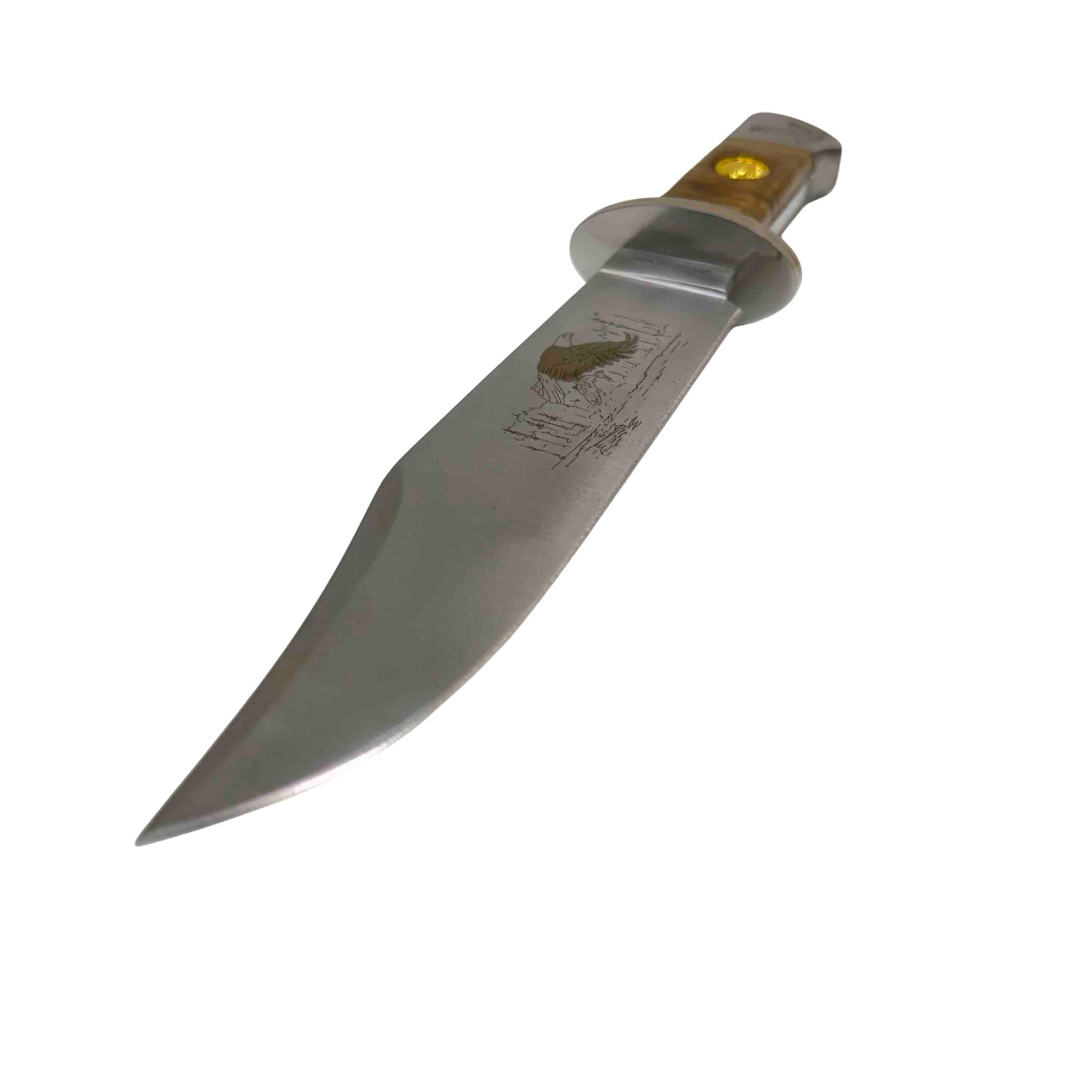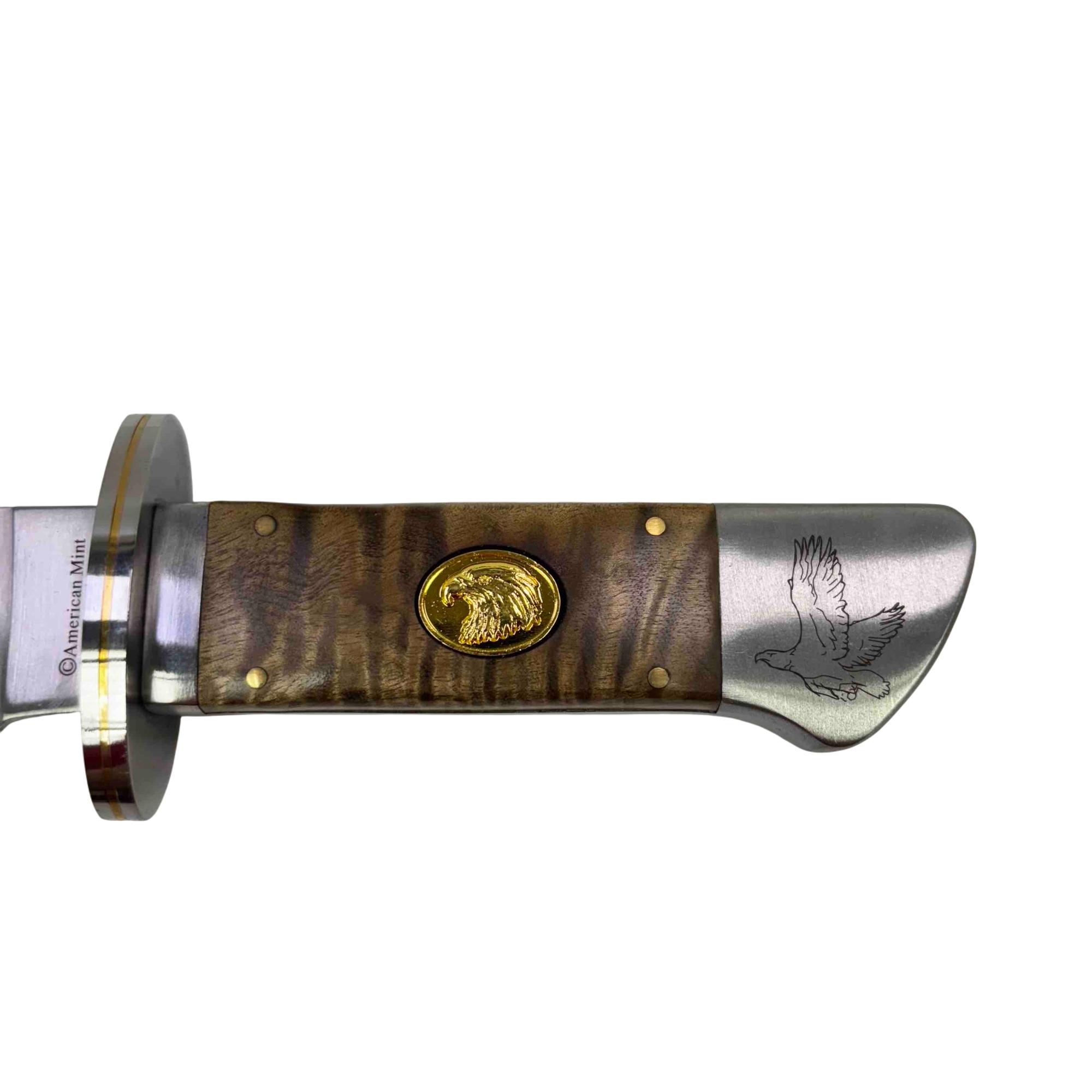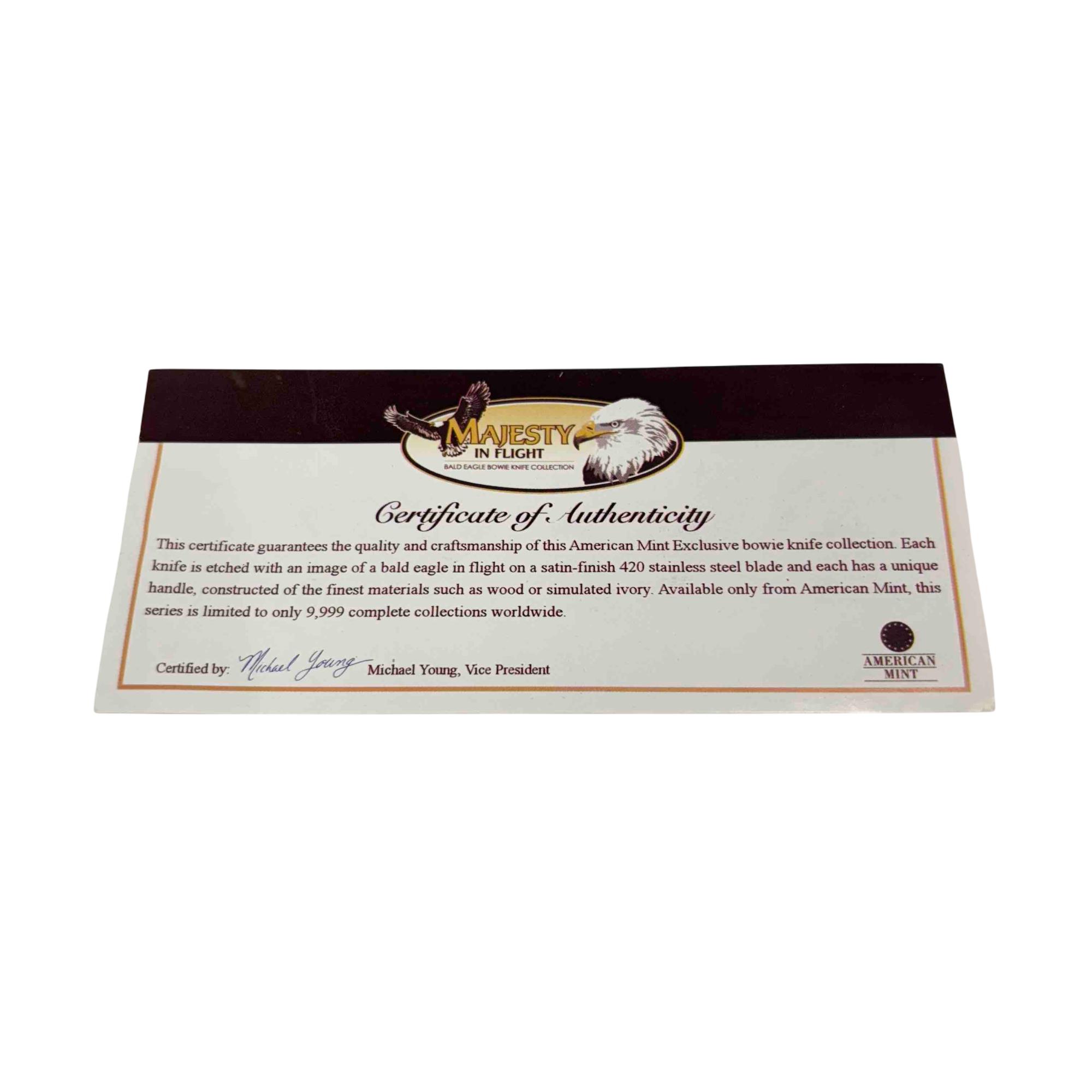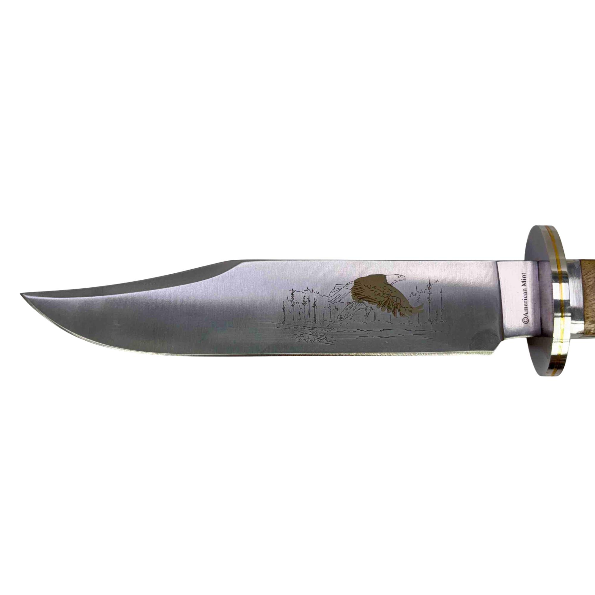 Discover the American Mint Majesty in Flight Bald Eagle Bowie Knife, a beautifully crafted piece with an etched image of a bald eagle in flight on a satin-finish 420 stainless steel blade. This limited edition knife features a unique handle made from high-quality materials like wood or simulated ivory, offering both elegance and functionality. With its Certificate of Authenticity, this collectible is perfect for enthusiasts and collectors alike.