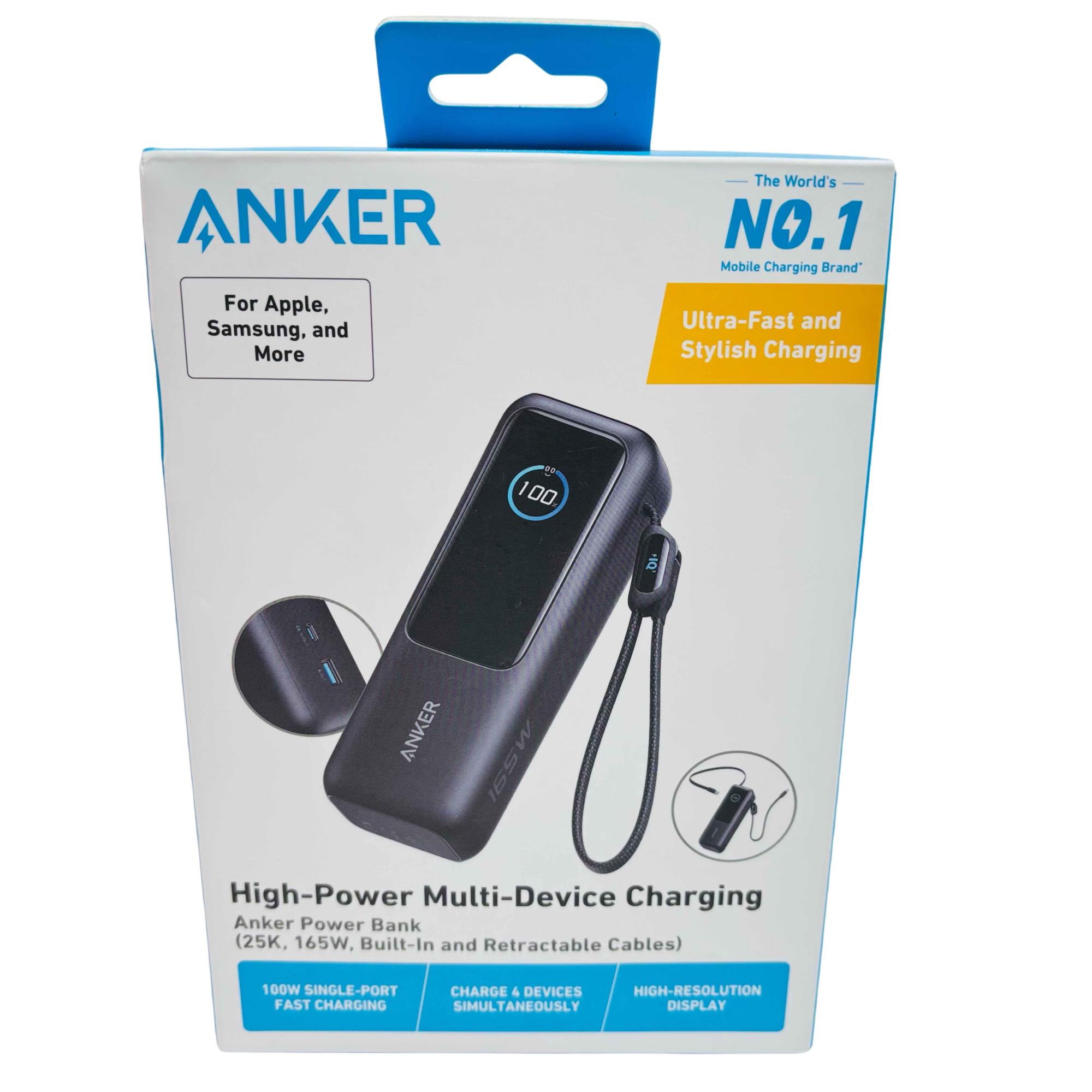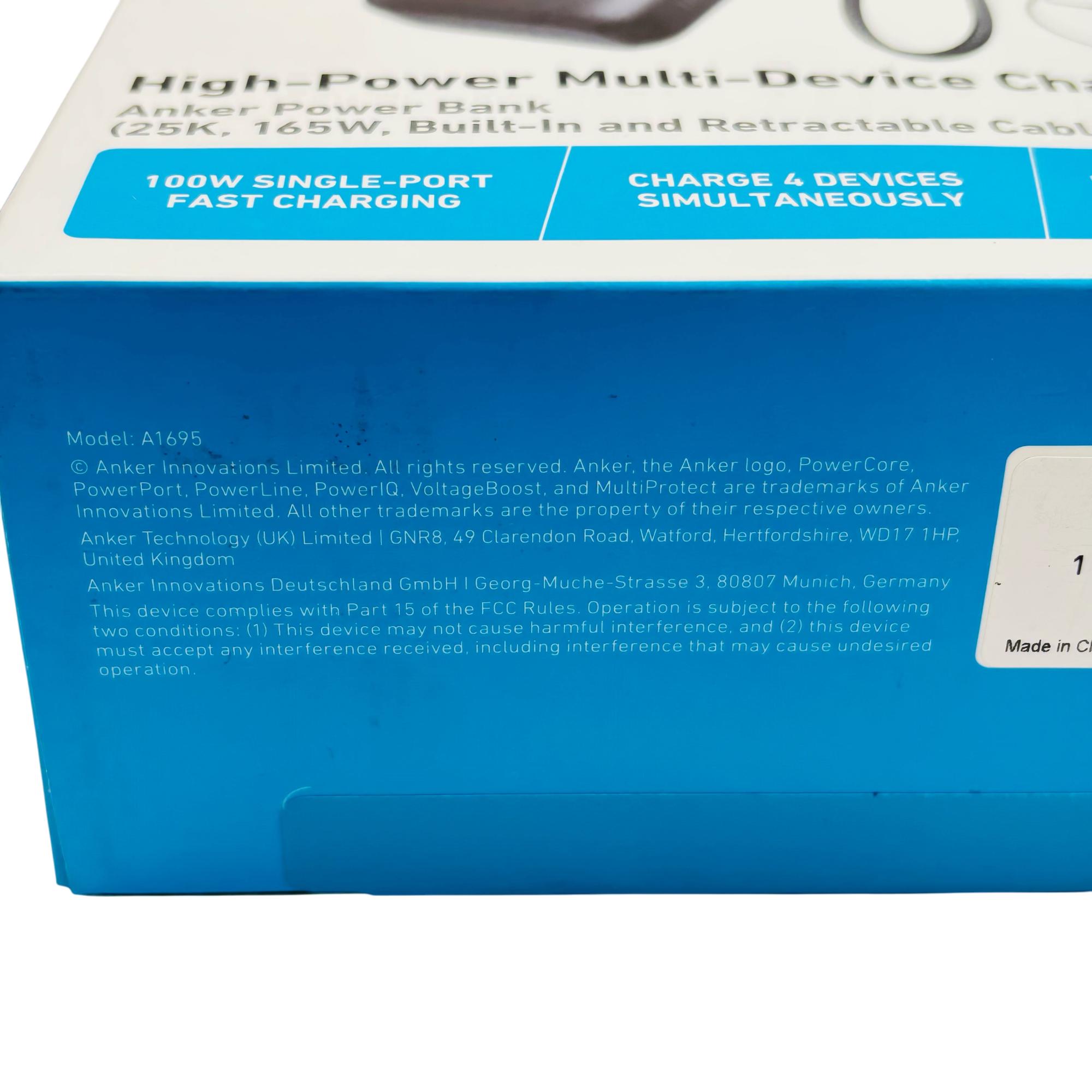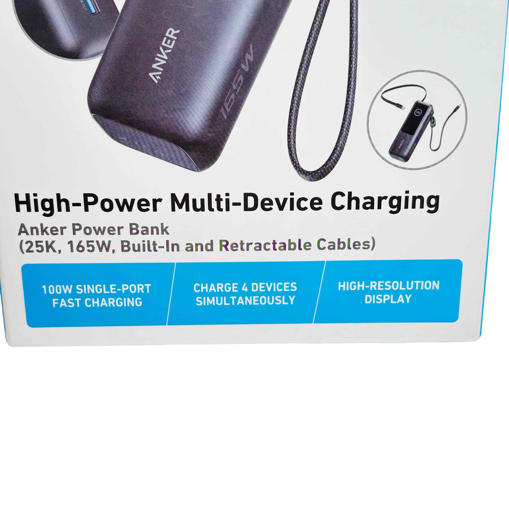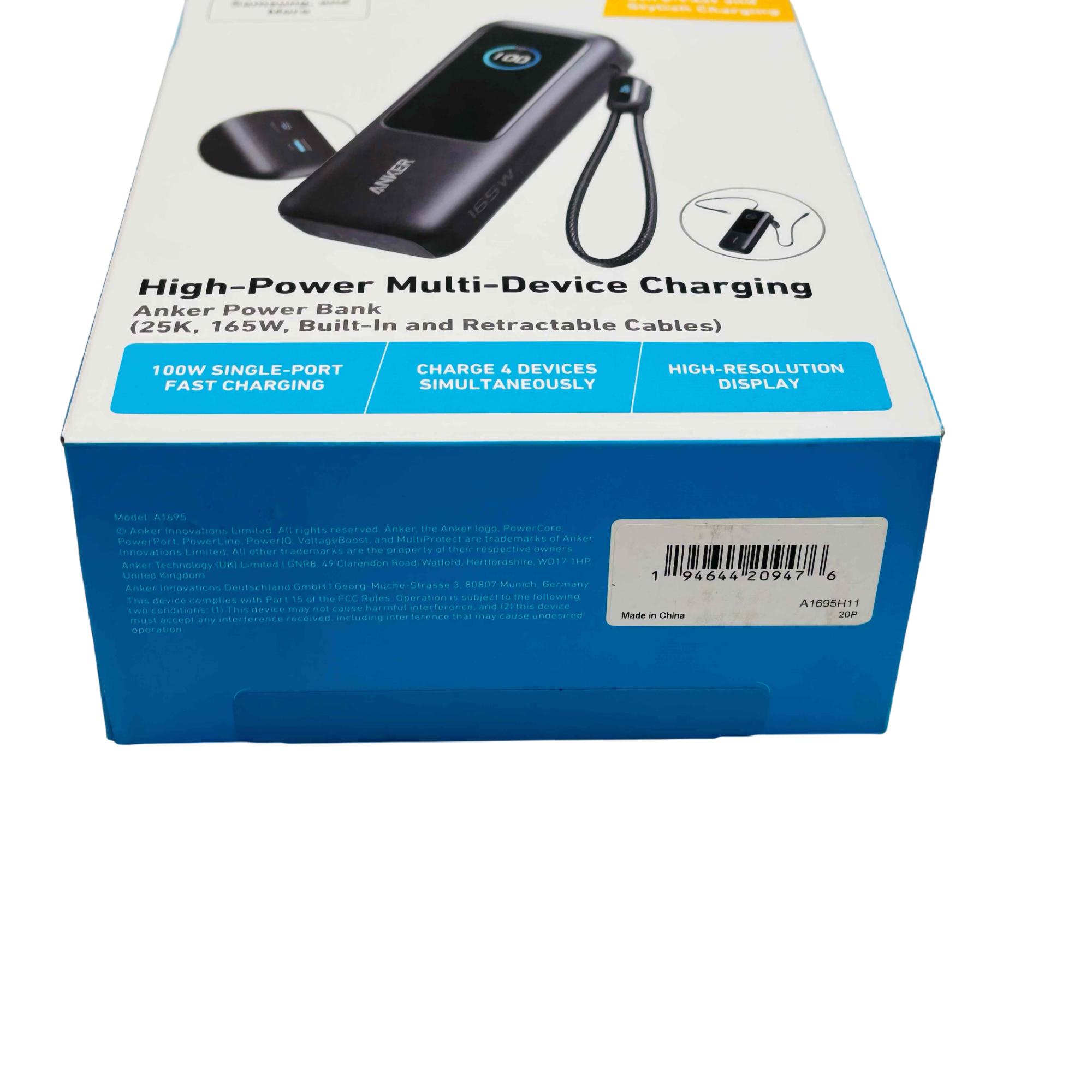 Anker Power Bank 25K (A1695H11) offers a massive 25000mAh capacity with 165W high-power output for fast and efficient charging. Designed for multi-device use, it features built-in and retractable cables, allowing simultaneous charging of up to four devices including laptops, smartphones, and other electronics. Compatible with a wide range of devices such as iPhone, Samsung, Google Pixel, MacBook, and more, it delivers both portability and powerful performance in a stylish and functional design.