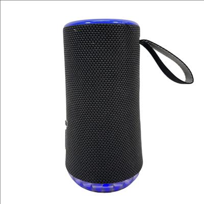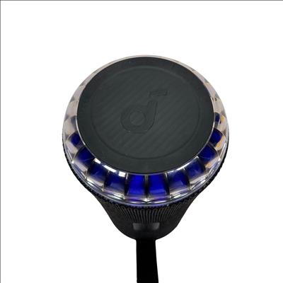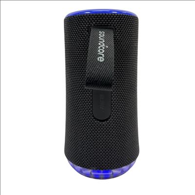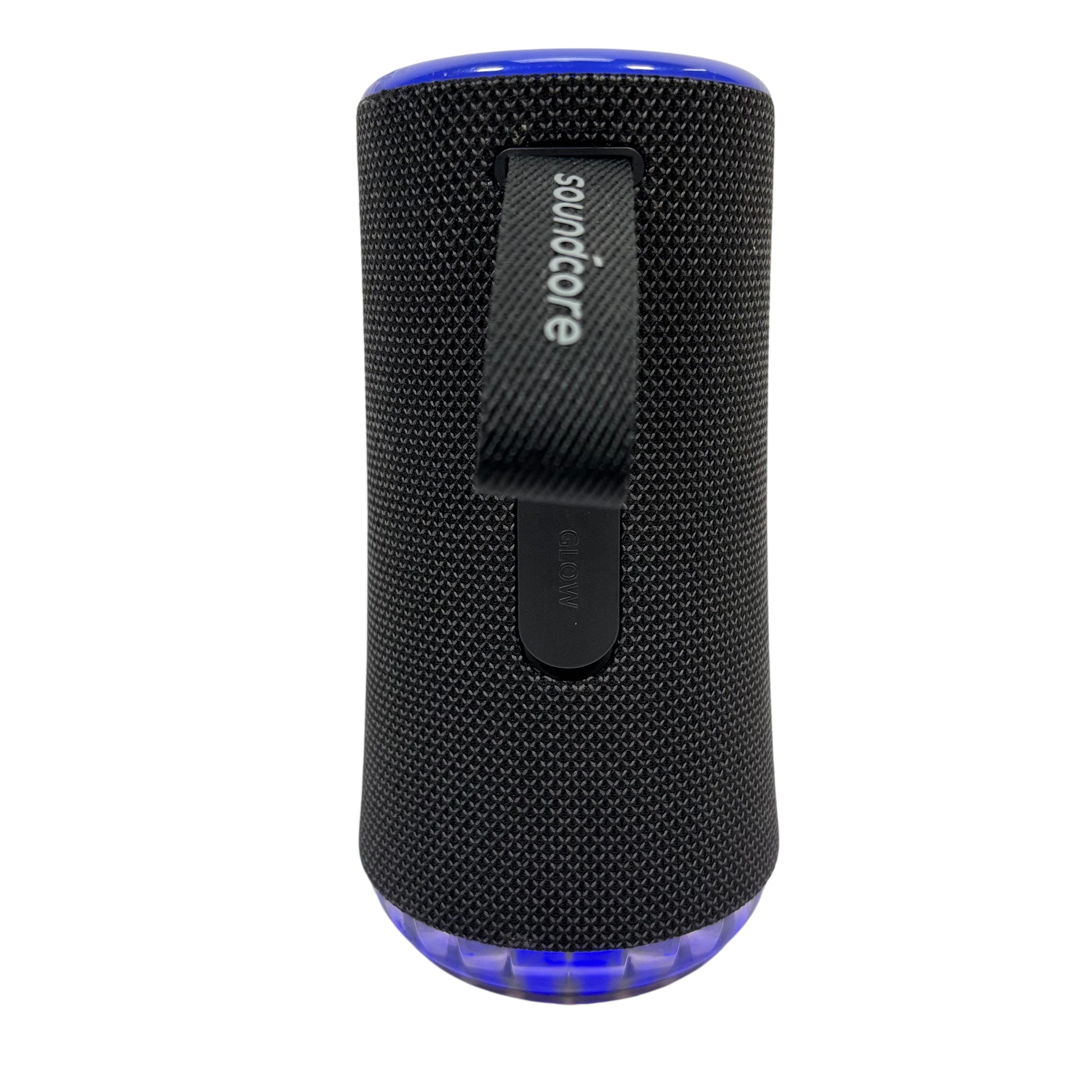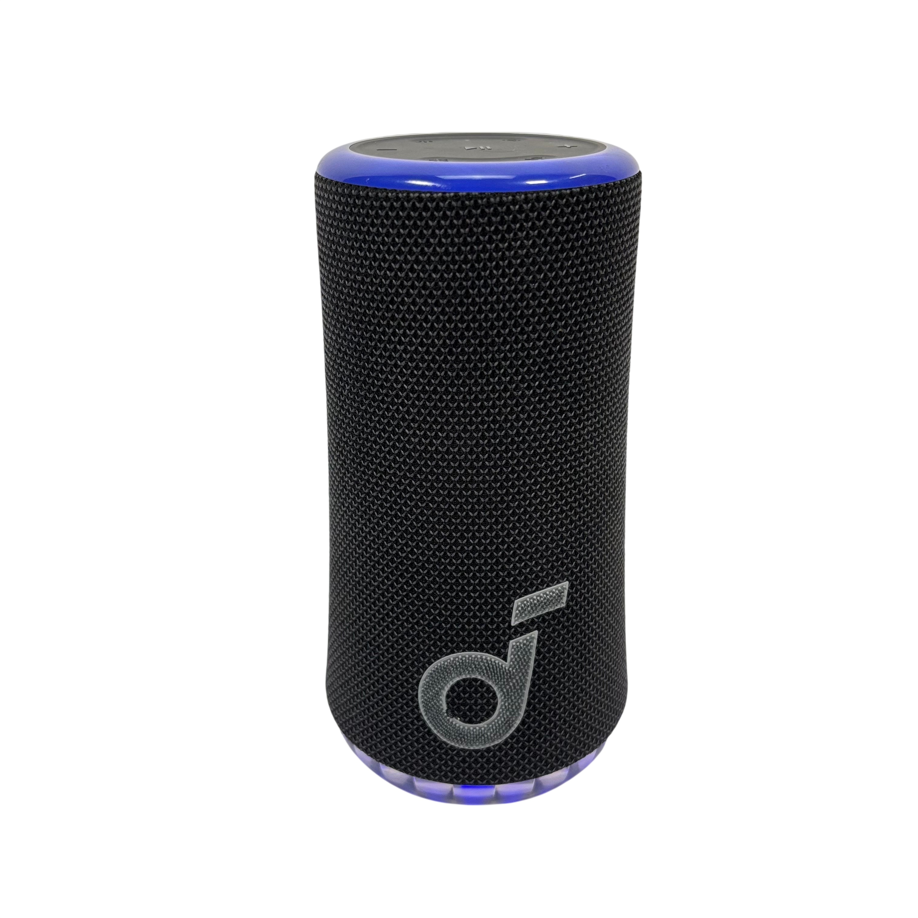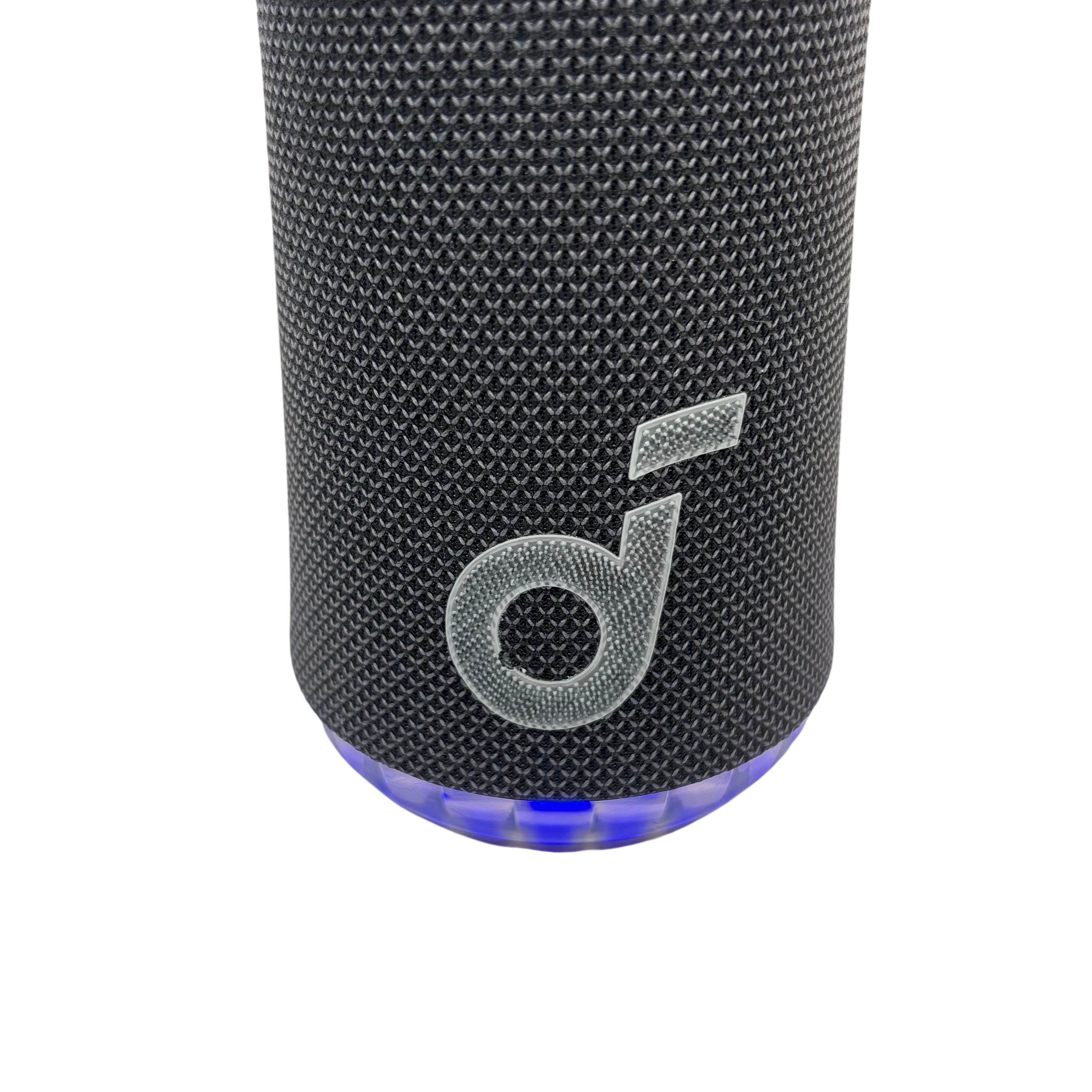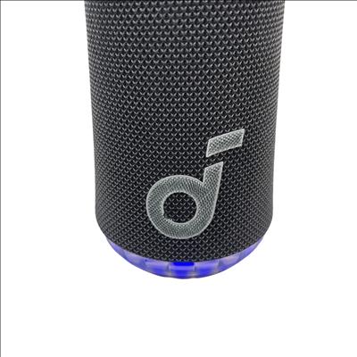 The SOUNDCORE Bluetooth Speaker offers a compact and portable audio solution with wireless Bluetooth connectivity. Featuring a stylish black fabric mesh body accented with blue LED lighting, this speaker provides clear sound and visual appeal. It includes convenient top-mounted controls for play, pause, volume adjustment, and Bluetooth pairing. Ideal for on-the-go music listening, this rechargeable speaker combines portability with vibrant lighting effects for an enhanced audio experience.
