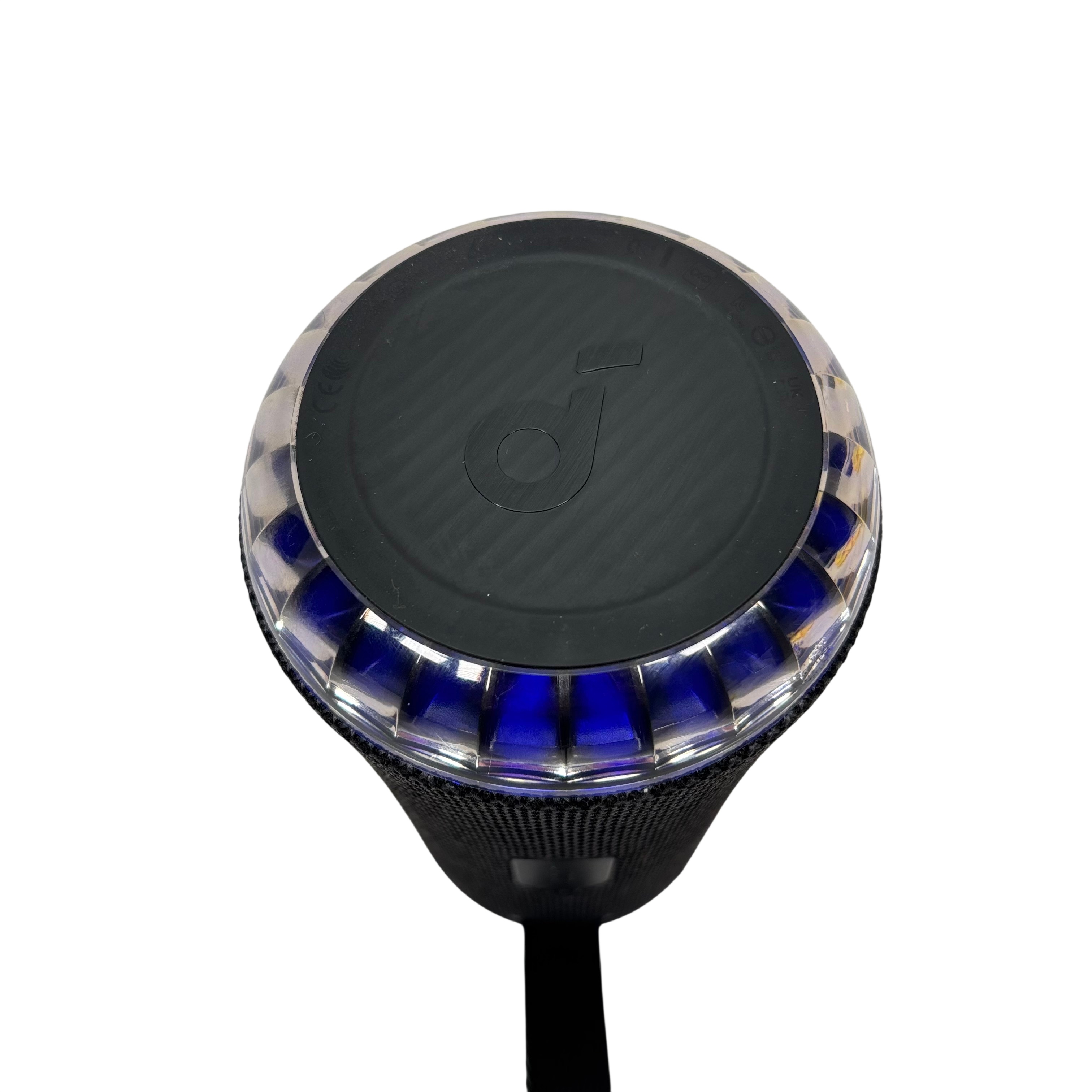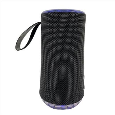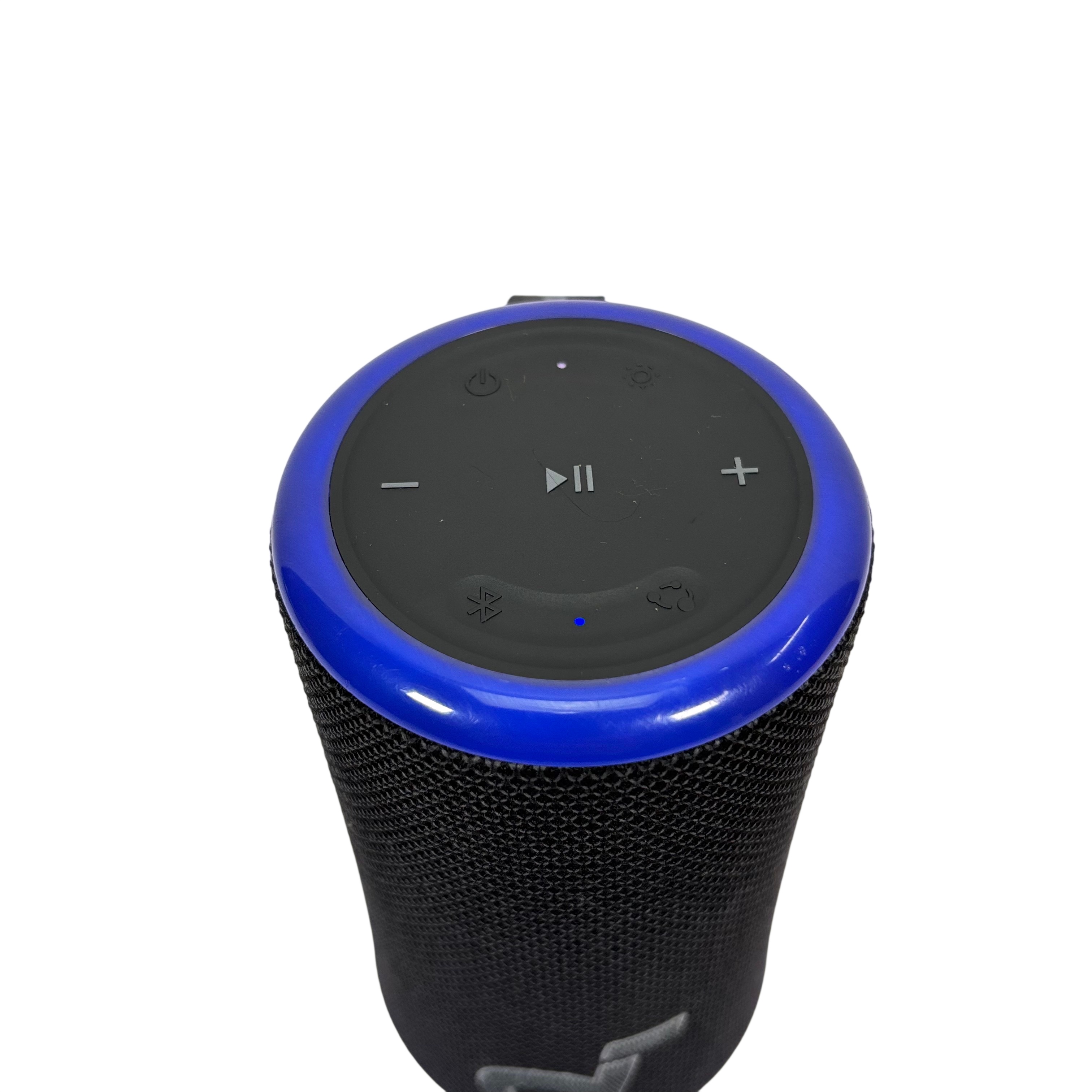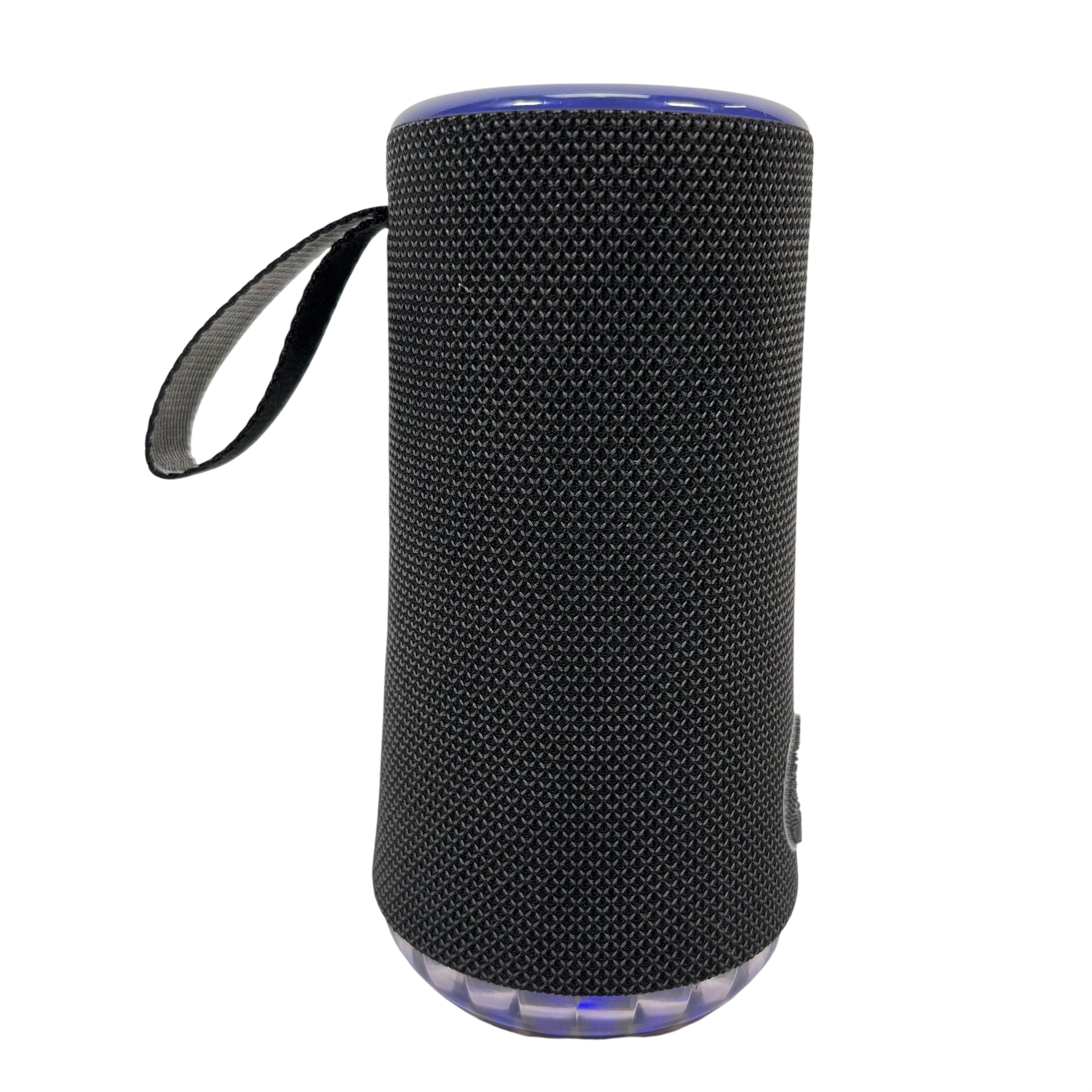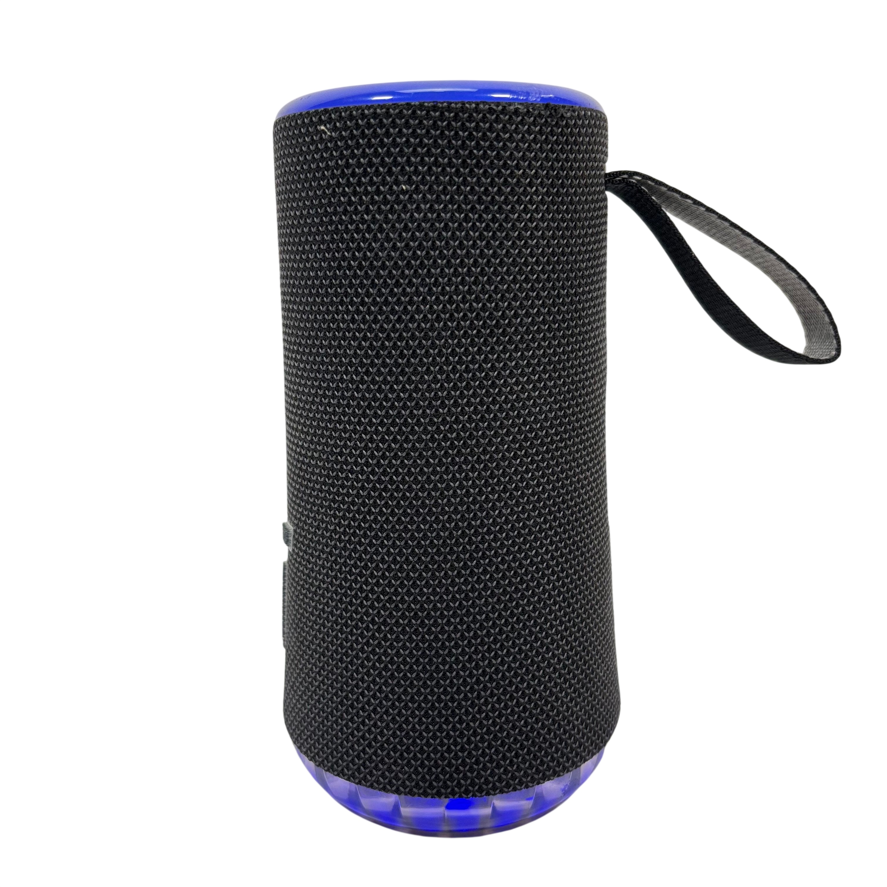 The SOUNDCORE Bluetooth Speaker offers a compact and portable audio solution with wireless Bluetooth connectivity. Featuring a stylish black fabric mesh body accented with blue LED lighting, this speaker provides clear sound and visual appeal. It includes convenient top-mounted controls for play, pause, volume adjustment, and Bluetooth pairing. Ideal for on-the-go music listening, this rechargeable speaker combines portability with vibrant lighting effects for an enhanced audio experience.