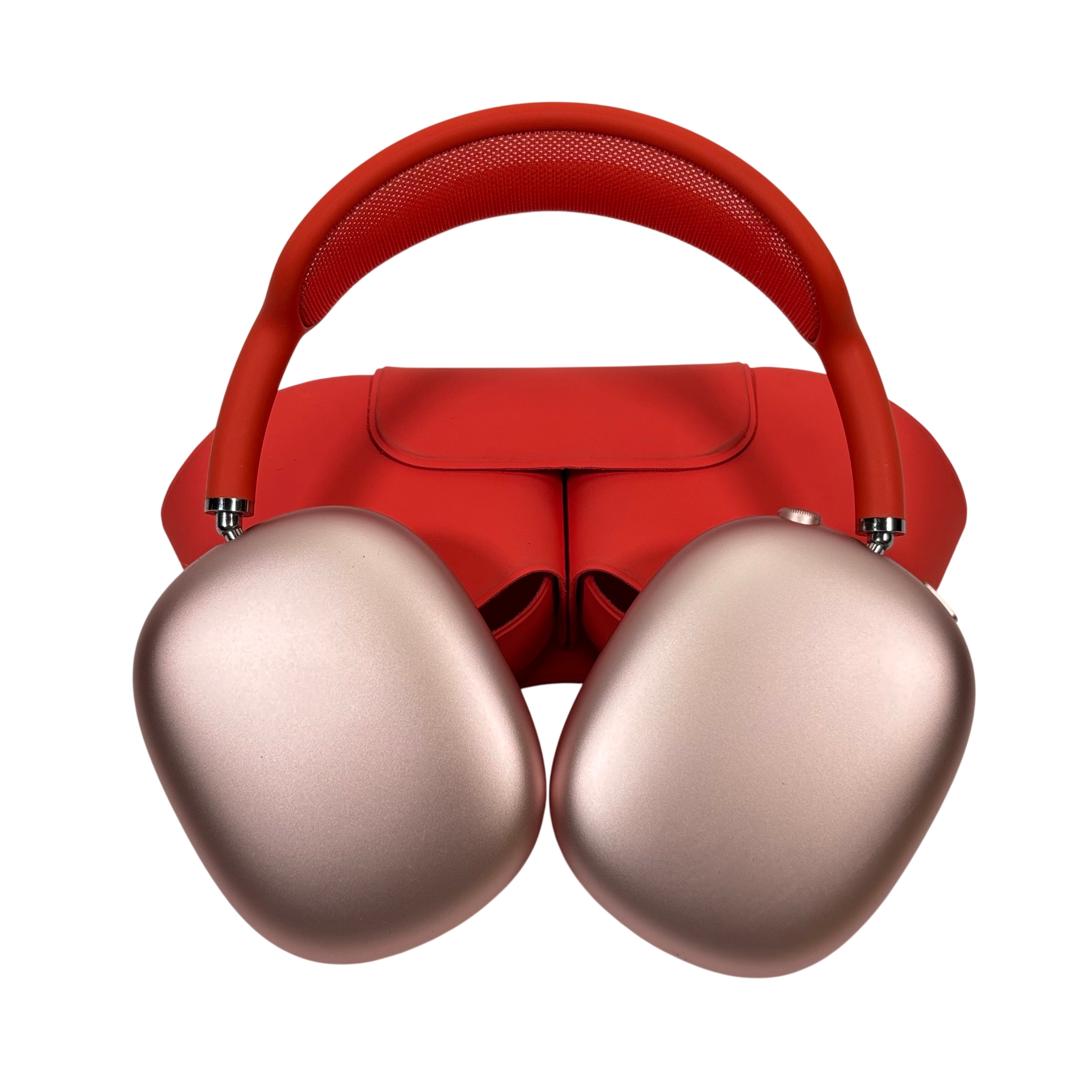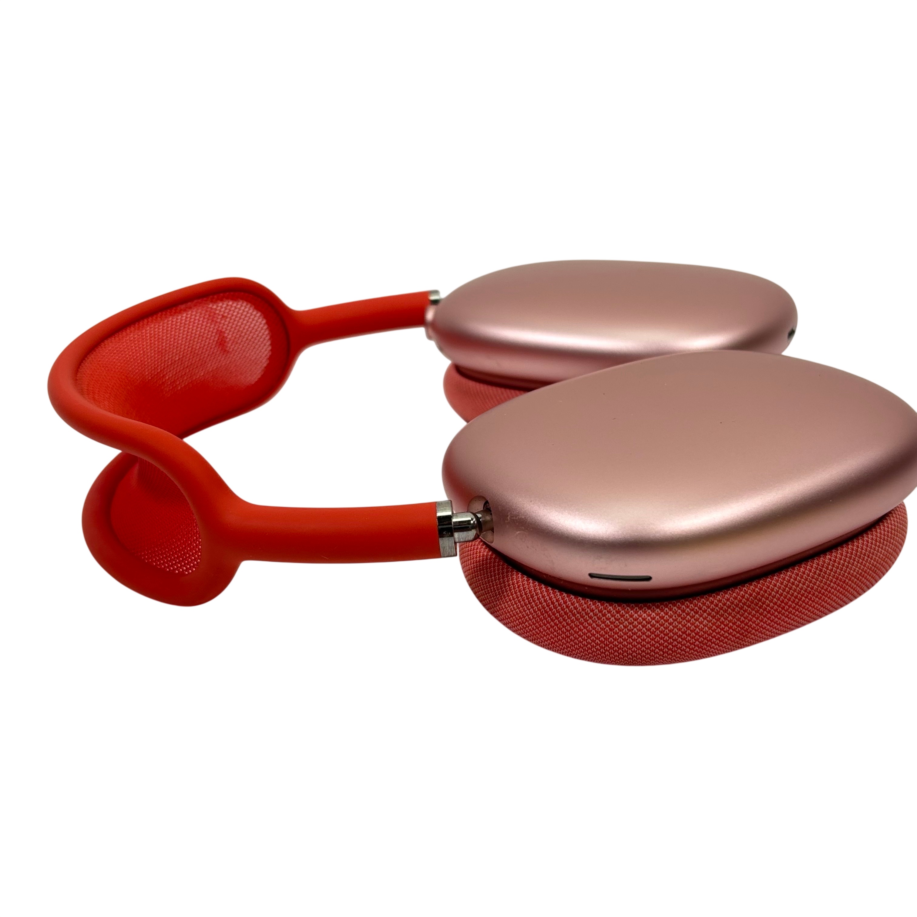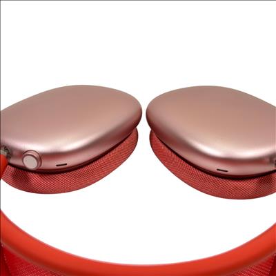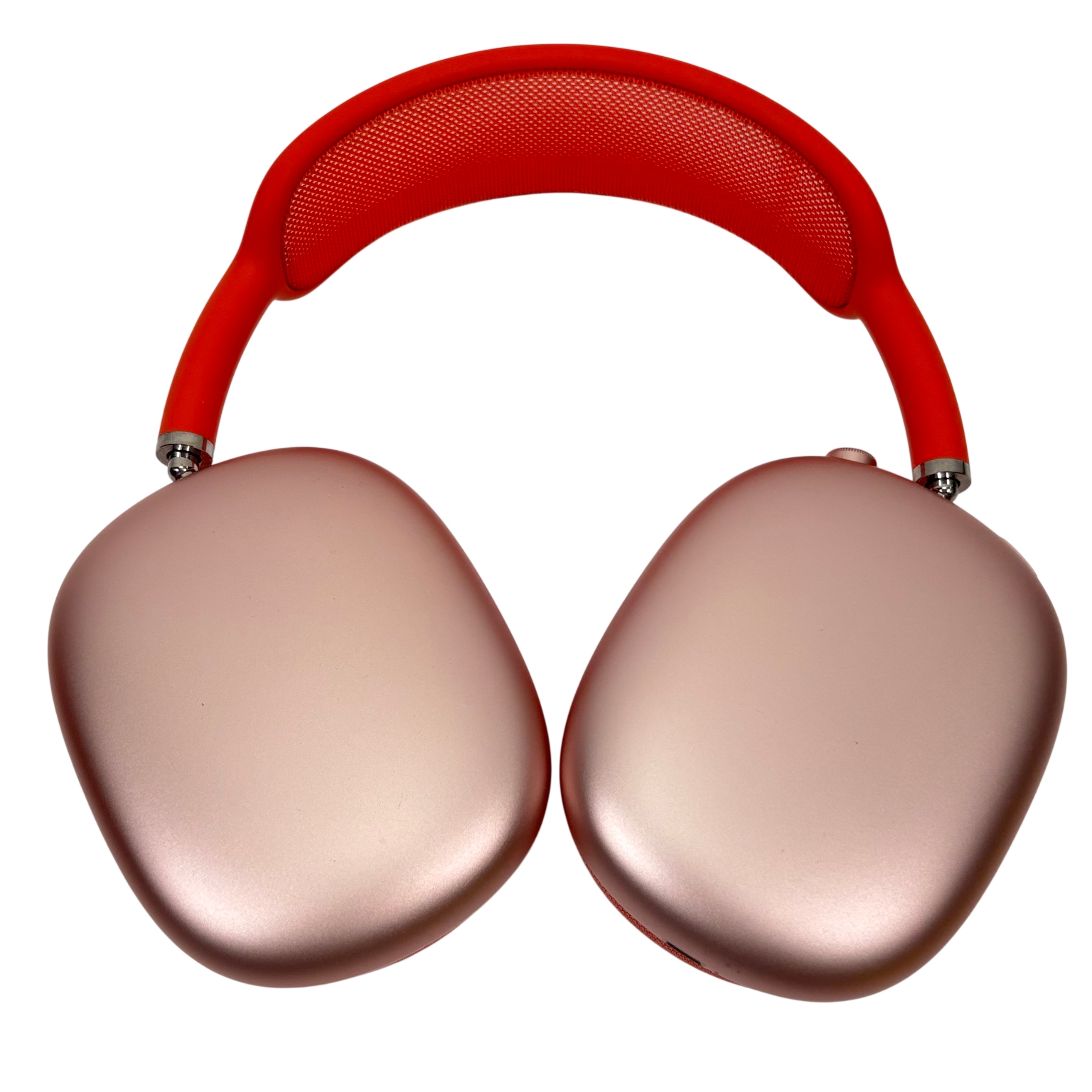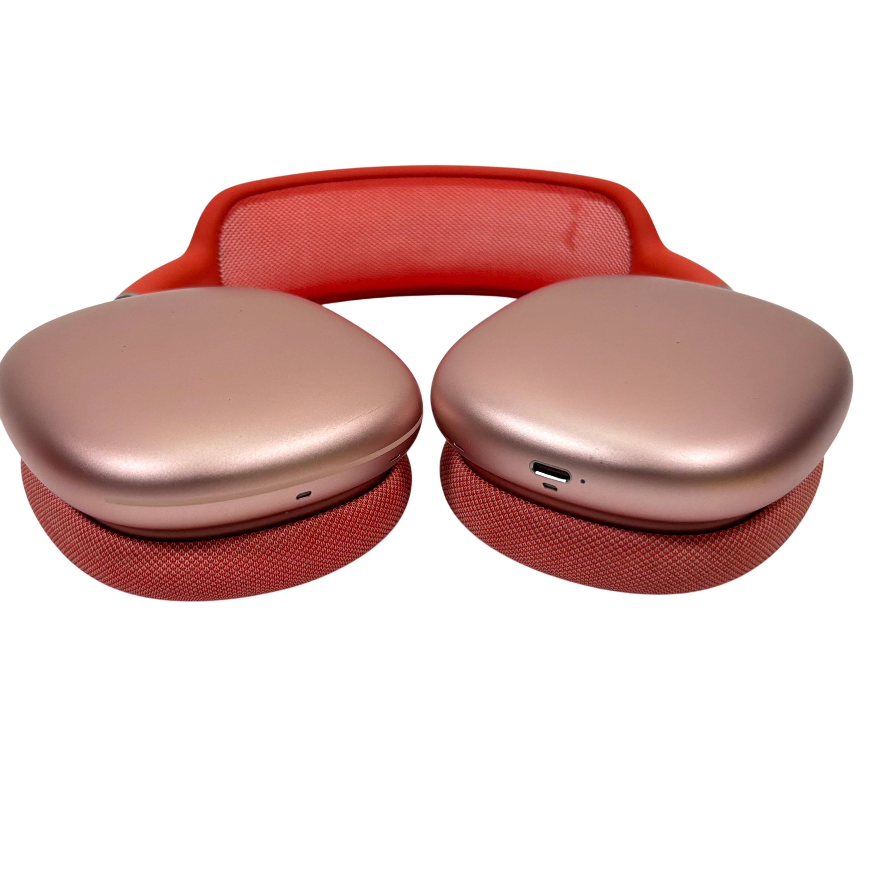 Apple AirPods Max are premium over-ear wireless headphones featuring advanced Active Noise Cancellation and Spatial Audio for an immersive listening experience. Designed with a stainless steel frame and aluminum ear cups in a stylish Pink Sand color paired with a red mesh headband, these headphones deliver high-fidelity sound and comfort. The digital crown allows precise volume and playback control, while the rechargeable battery supports convenient wireless use. Included in the set are the headphones, a smart case, and a Lightning to USB-C charging cable, making them ideal for audiophiles and Apple ecosystem users.