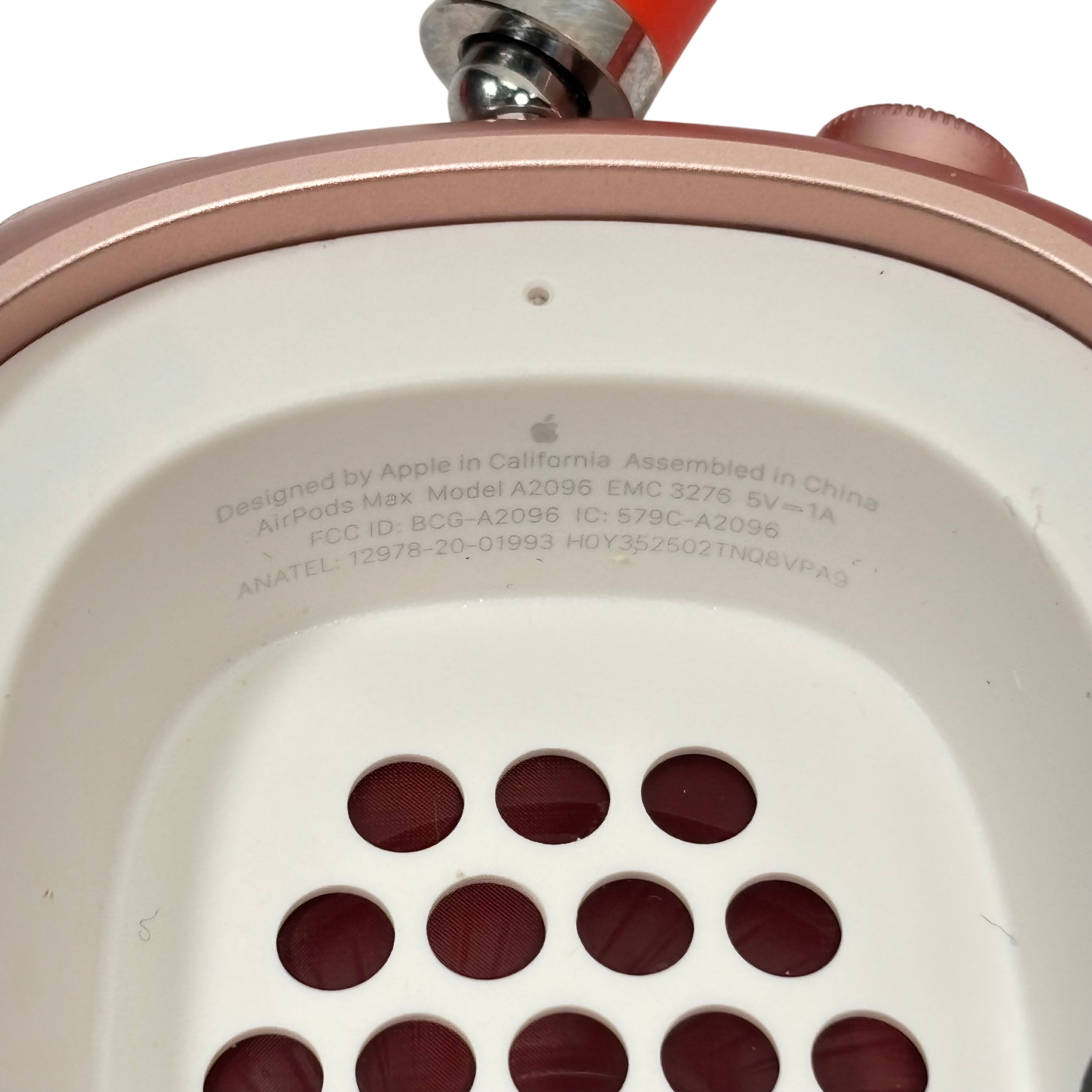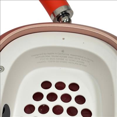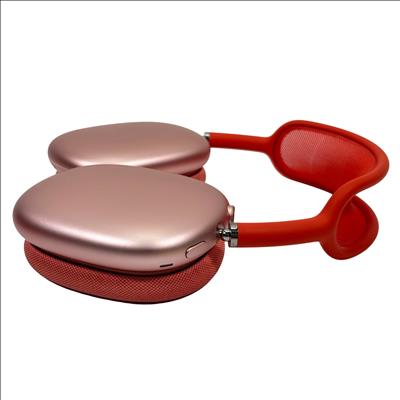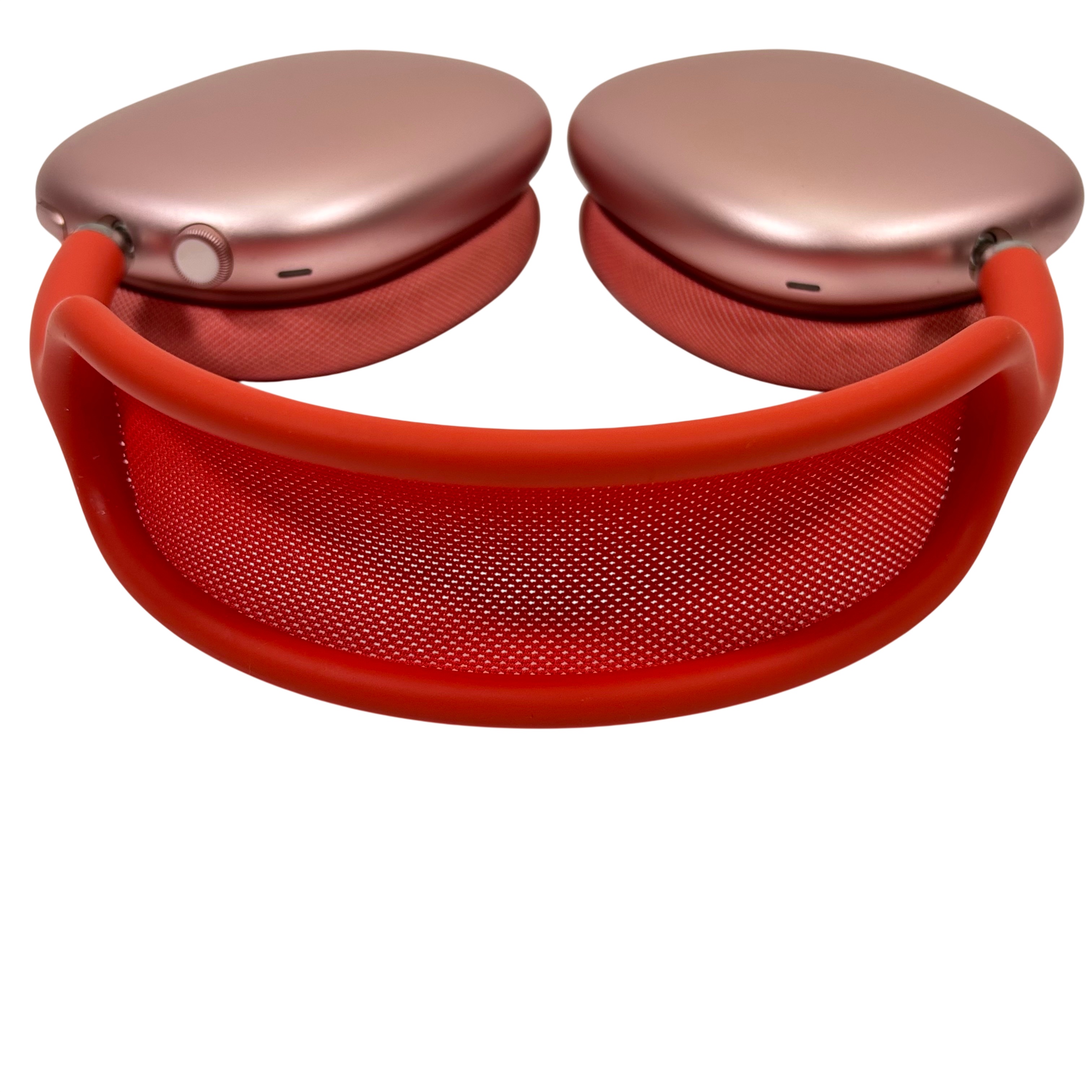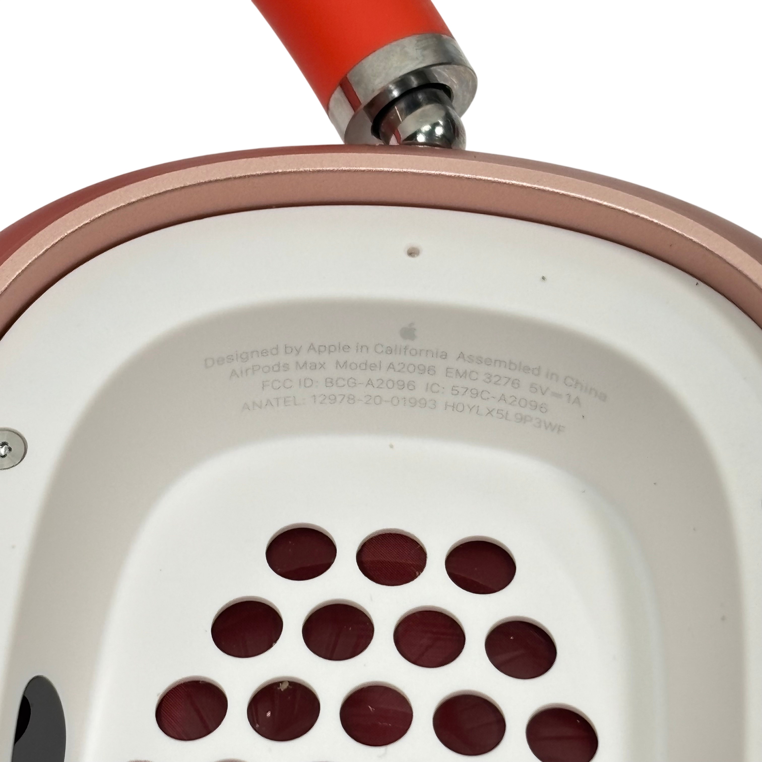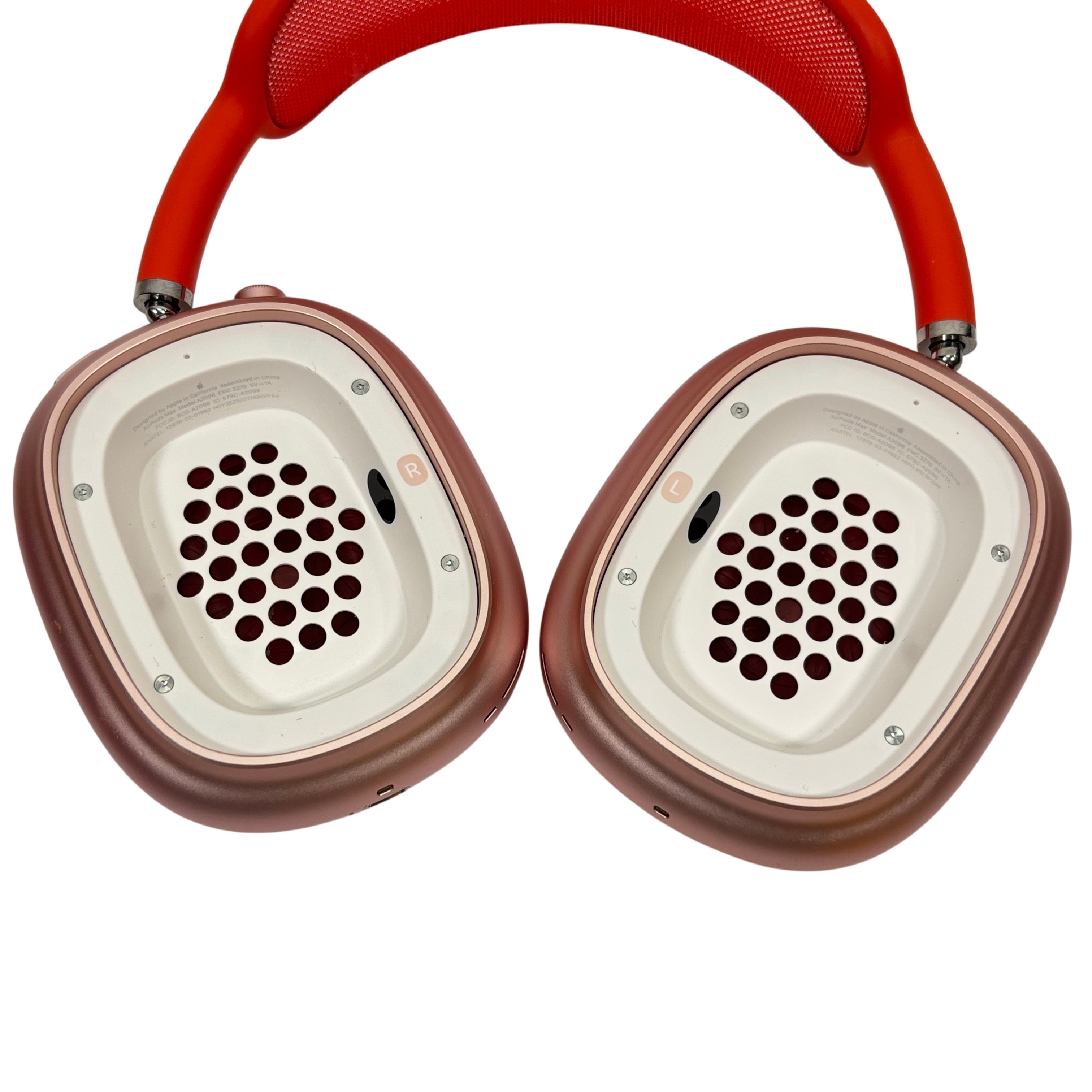 Apple AirPods Max are premium over-ear wireless headphones featuring advanced Active Noise Cancellation and Spatial Audio for an immersive listening experience. Designed with a stainless steel frame and aluminum ear cups in a stylish Pink Sand color paired with a red mesh headband, these headphones deliver high-fidelity sound and comfort. The digital crown allows precise volume and playback control, while the rechargeable battery supports convenient wireless use. Included in the set are the headphones, a smart case, and a Lightning to USB-C charging cable, making them ideal for audiophiles and Apple ecosystem users.