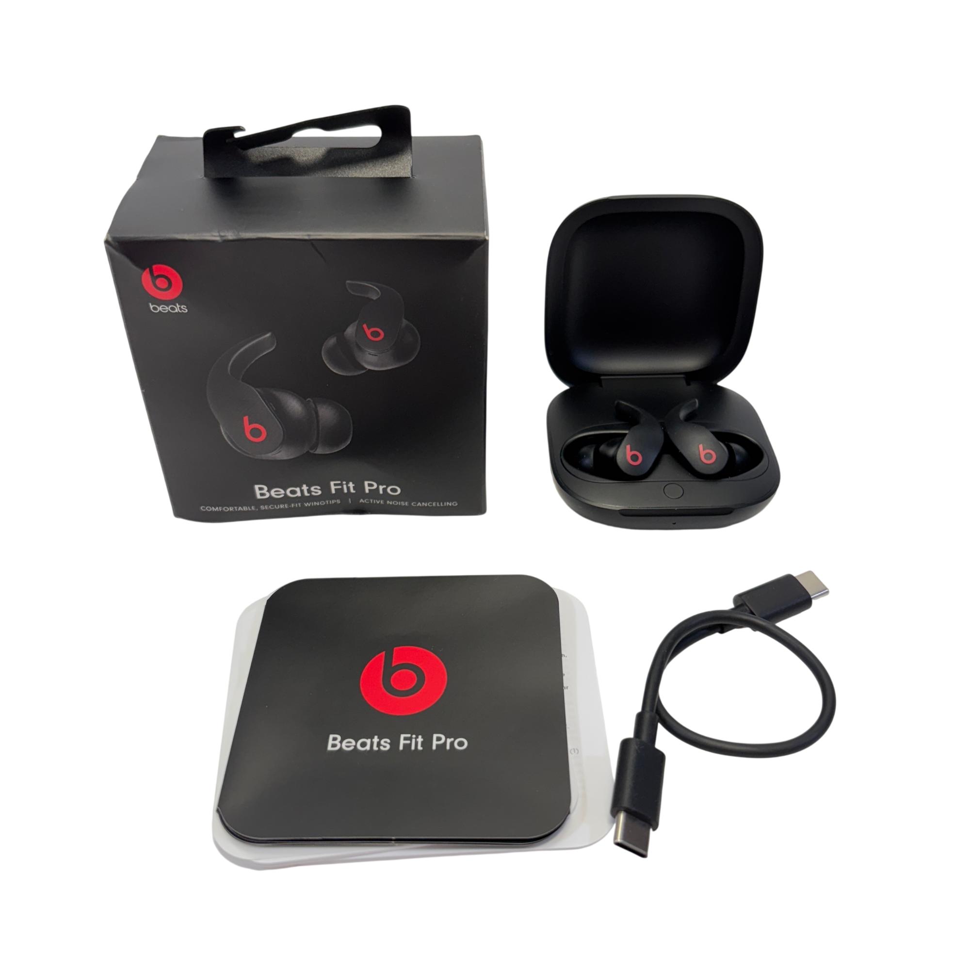 The Apple Beats Fit Pro True Wireless Noise Cancelling Earbuds deliver a secure and comfortable fit with their ergonomic wingtip design, providing enhanced stability during active use. These black earbuds feature advanced active noise cancelling technology for immersive sound quality, making them ideal for both workouts and daily listening.