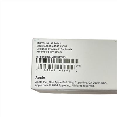Apple MXP63LL/A AirPods 4th Generation are premium true wireless earbuds designed for immersive audio experiences with Spatial Audio and Adaptive EQ. Featuring model numbers A3050, A3053, and A3058, these earbuds come with a MagSafe charging case that supports convenient wireless charging via Lightning port. The AirPods 4 offer sweat and water resistance, making them ideal for active lifestyles. Compact and lightweight, they deliver high-quality sound and seamless connectivity with Apple devices.