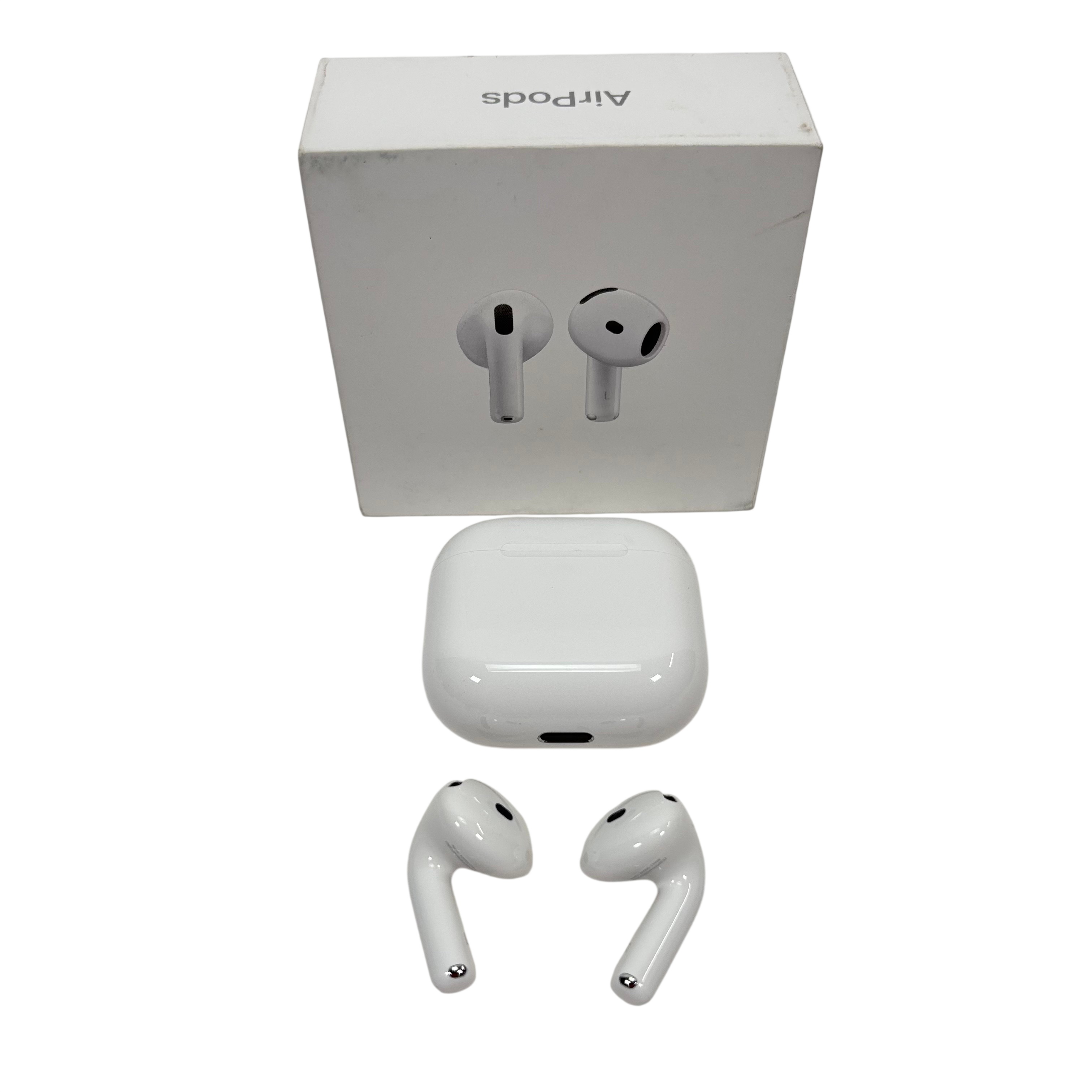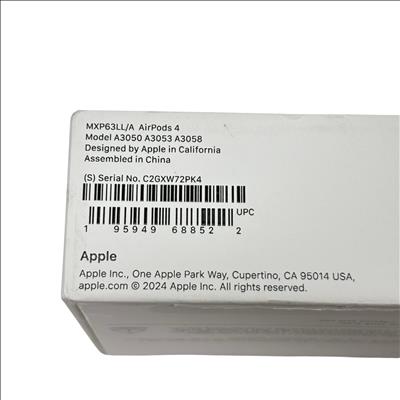 Apple MXP63LL/A AirPods 4th Generation are premium true wireless earbuds designed for immersive audio experiences with Spatial Audio and Adaptive EQ. Featuring model numbers A3050, A3053, and A3058, these earbuds come with a MagSafe charging case that supports convenient wireless charging via Lightning port. The AirPods 4 offer sweat and water resistance, making them ideal for active lifestyles. Compact and lightweight, they deliver high-quality sound and seamless connectivity with Apple devices.