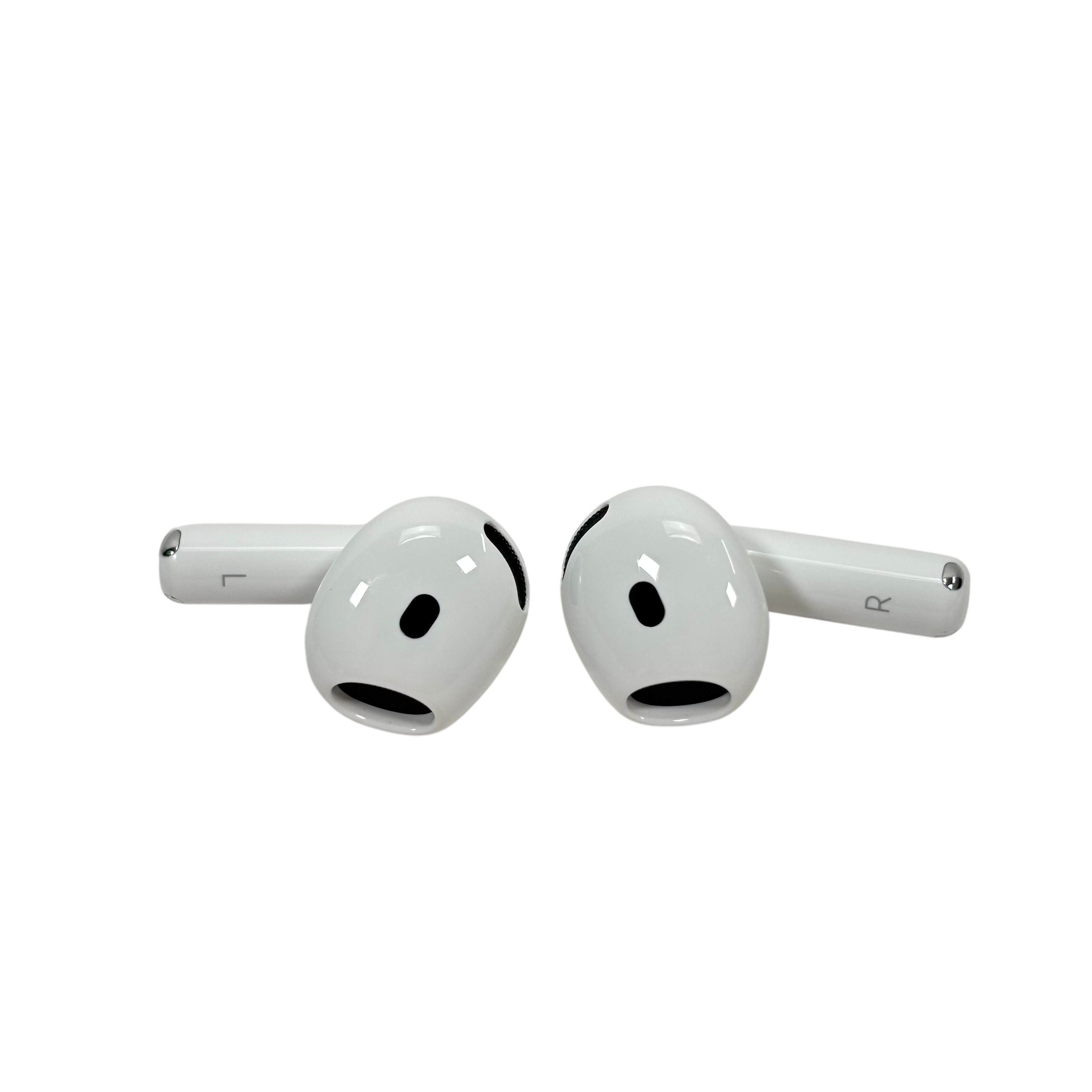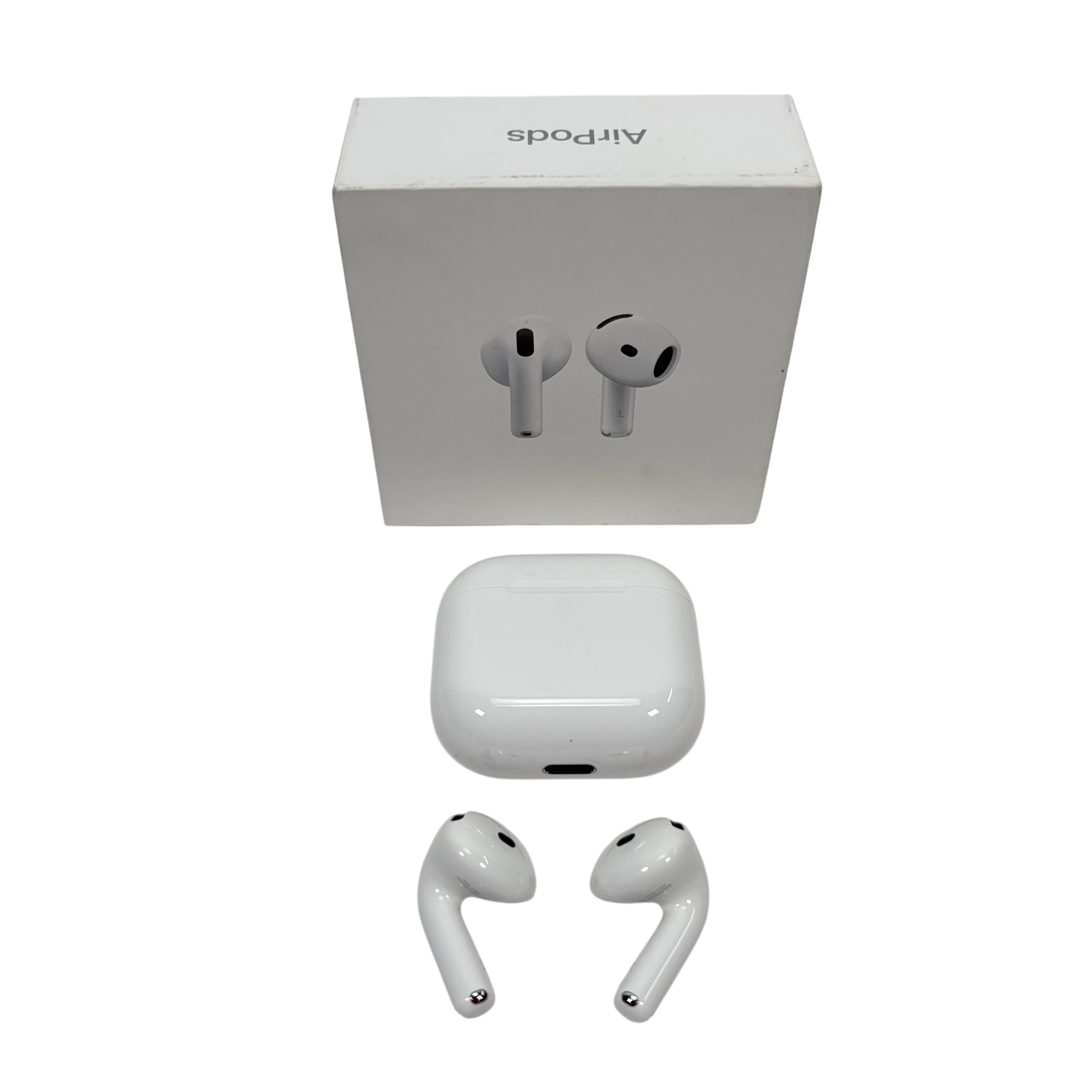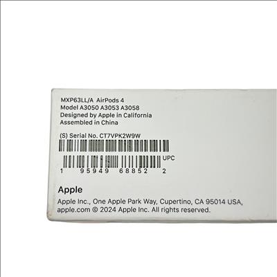 Apple MXP63LL/A AirPods 4th Generation are premium true wireless earbuds designed for immersive audio experiences with Spatial Audio and Adaptive EQ. Featuring model numbers A3050, A3053, and A3058, these earbuds come with a MagSafe charging case that supports convenient wireless charging via Lightning port. The AirPods 4 offer sweat and water resistance, making them ideal for active lifestyles. Compact and lightweight, they deliver high-quality sound and seamless connectivity with Apple devices.
