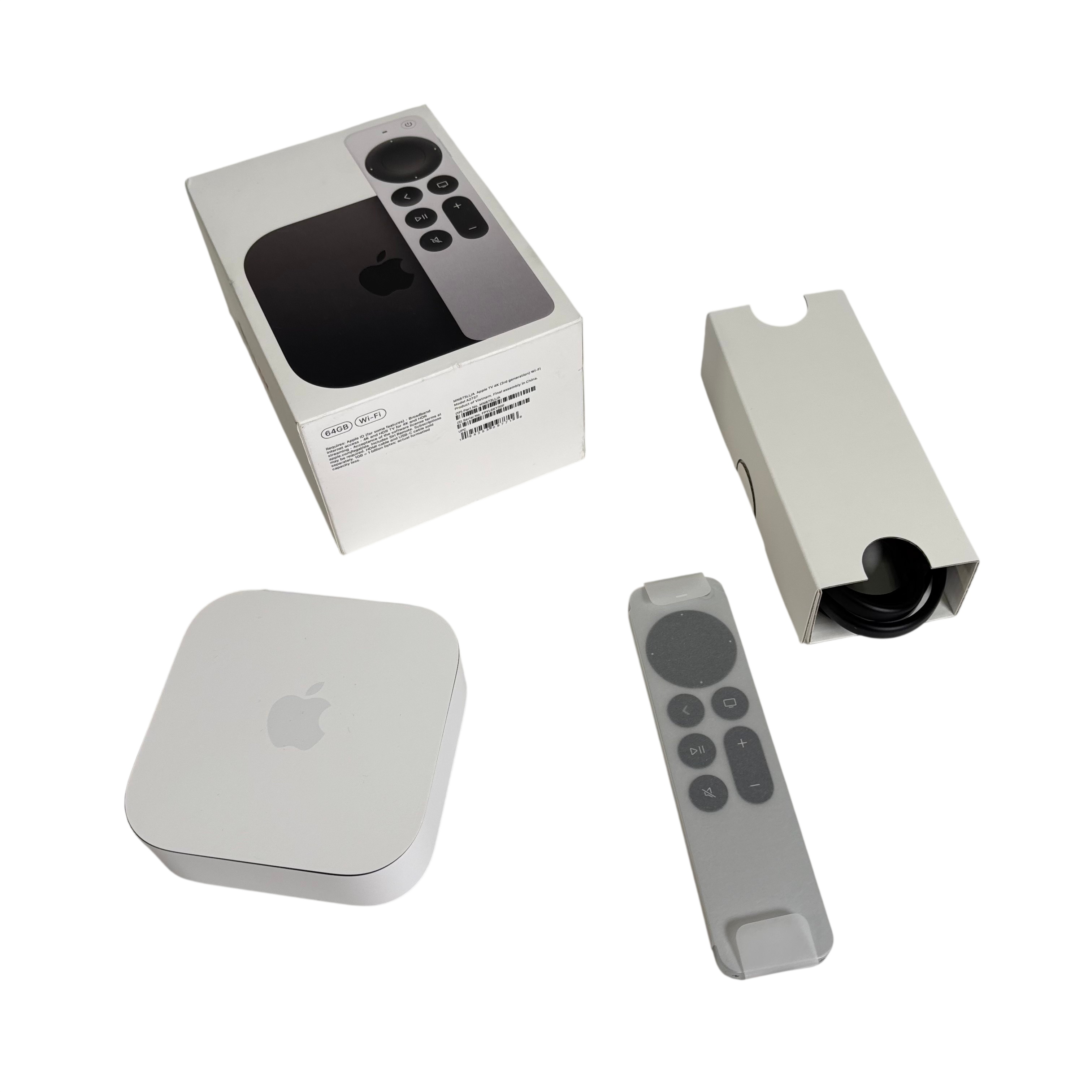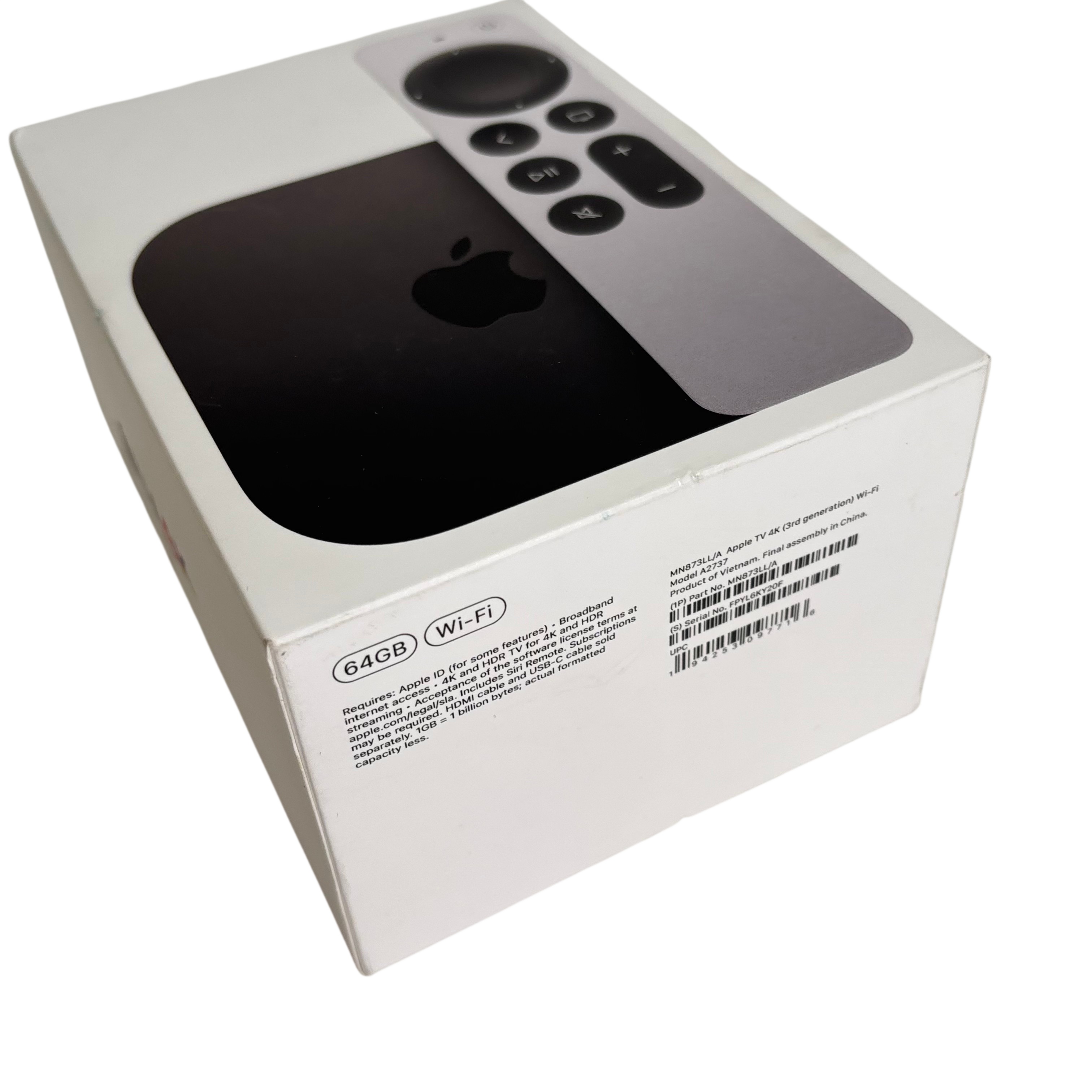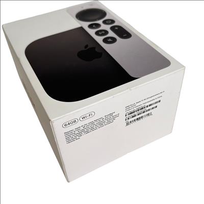 Apple TV 4K 3rd Generation (Model A2737) features 64GB of internal storage and Wi-Fi connectivity for seamless streaming of 4K HDR content. This compact digital satellite receiver includes the Apple TV unit, a Siri Remote, and power cable, all housed in original packaging. Designed for high-quality media playback and smart home integration, it delivers a premium entertainment experience in a sleek black finish.
