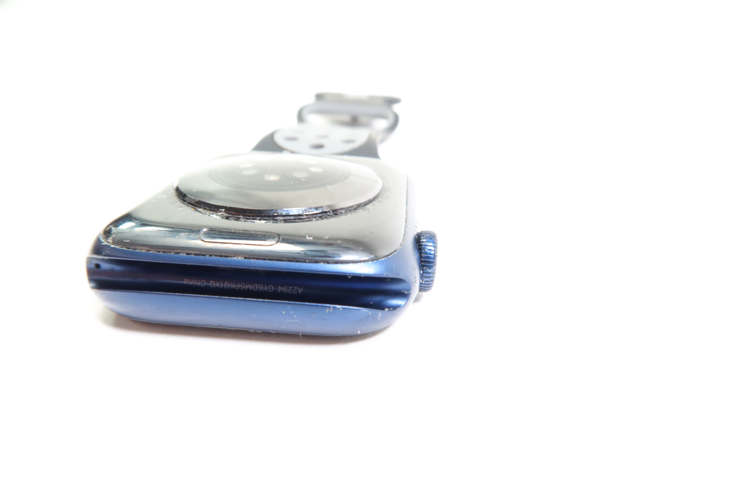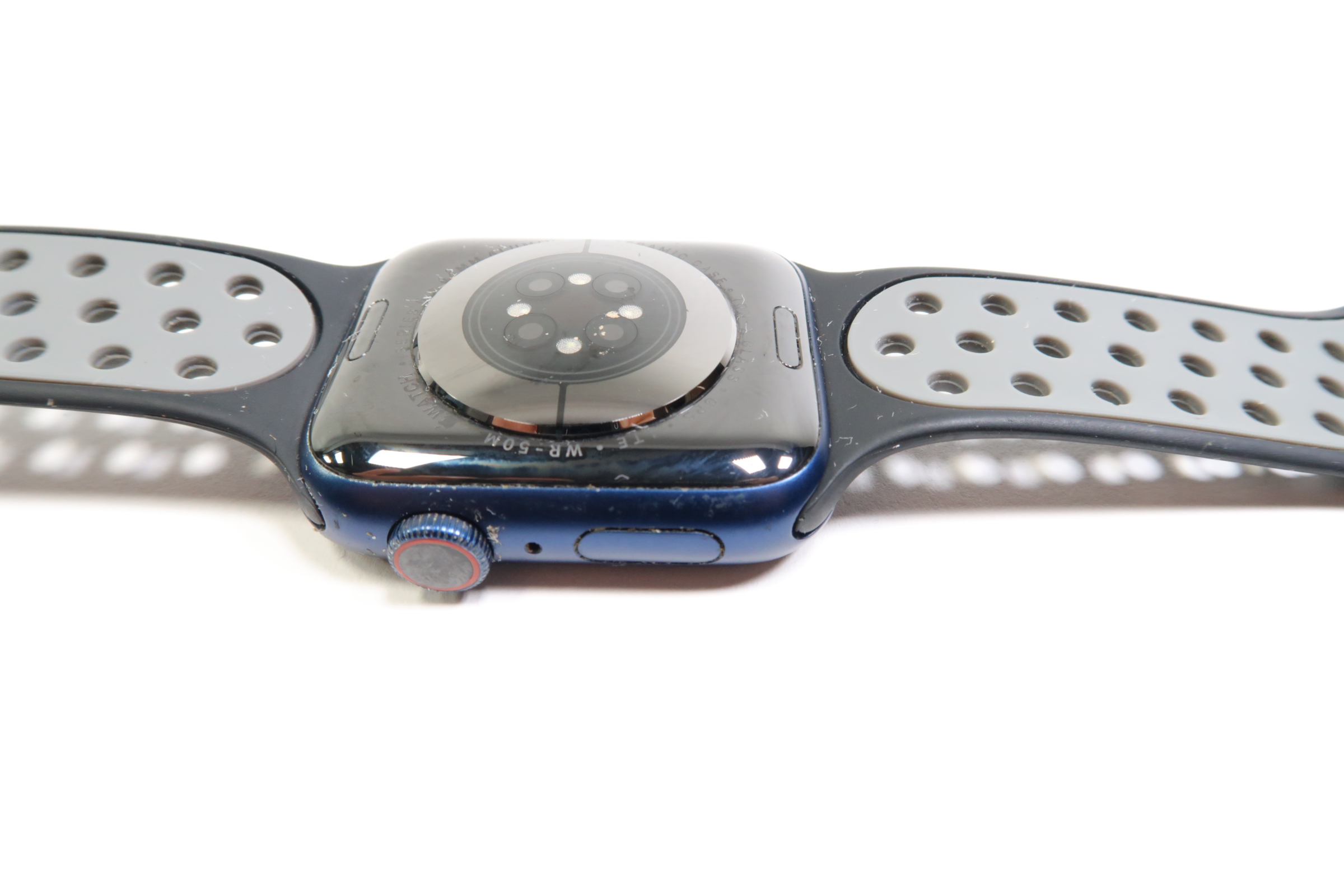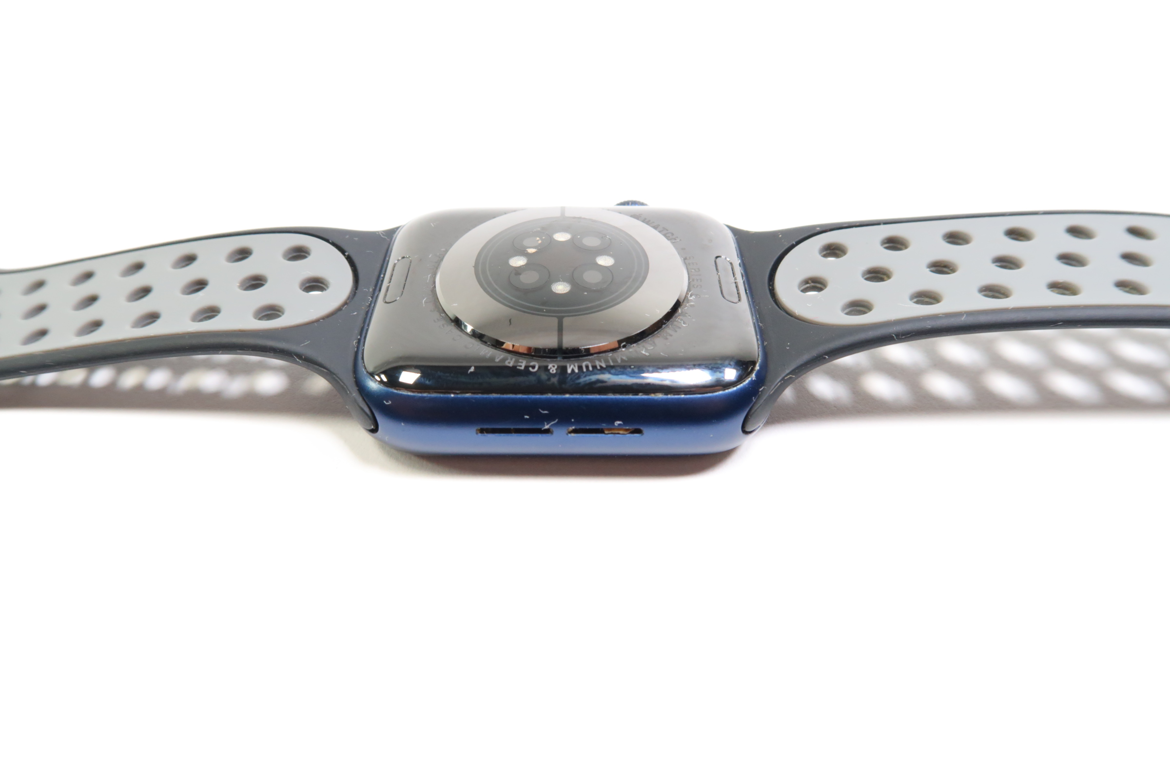 All Apple Watch Series 6 devices are controlled with a Digital Crown with haptic feedback and a touch capable display. This particular Apple Watch Series 6 model in the 44 mm size, features a 368x448 LTPO OLED screen either with Ion-X glass packed in an aluminum case or sapphire crystal glass packed in a stainless steel case as well as a ceramic and sapphire crystal back that connects to the charger.