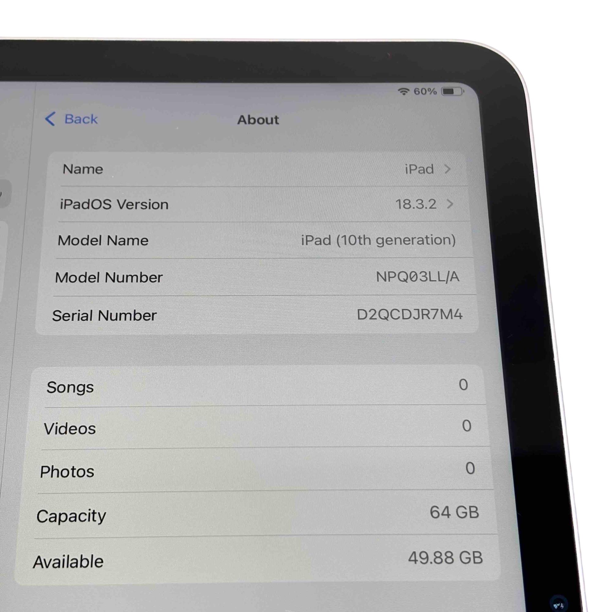 Model: iPad 10th Gen A2696 NPQ03LL/A