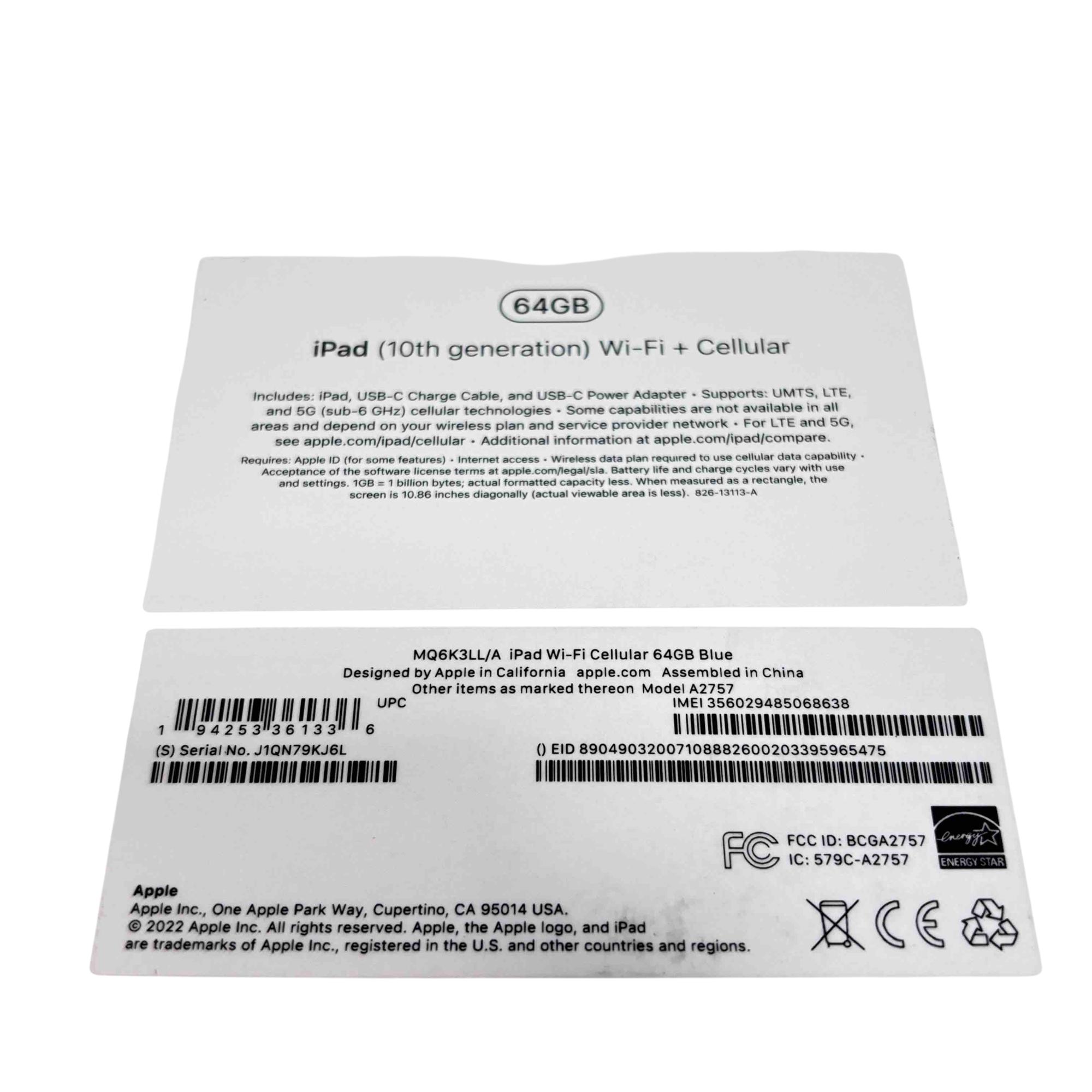 Model: iPad 10th Gen MQ6K3LL/A