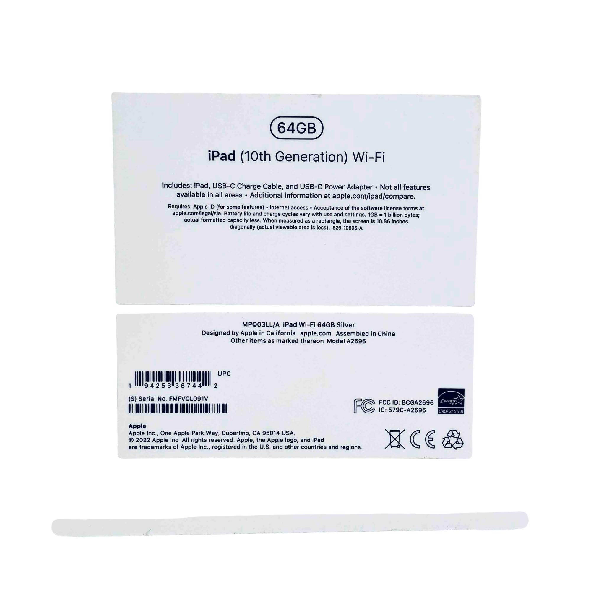 Experience the power and versatility of the Apple iPad 10th Generation featuring a vibrant 10.9-inch display, 64GB of storage, and sleek Silver finish. Included in the box are the iPad, a USB-C charging cable, and a USB-C power adapter—everything you need to get started. Perfect for productivity, creativity, and entertainment, this highly portable tablet is your all-in-one device for work or play.