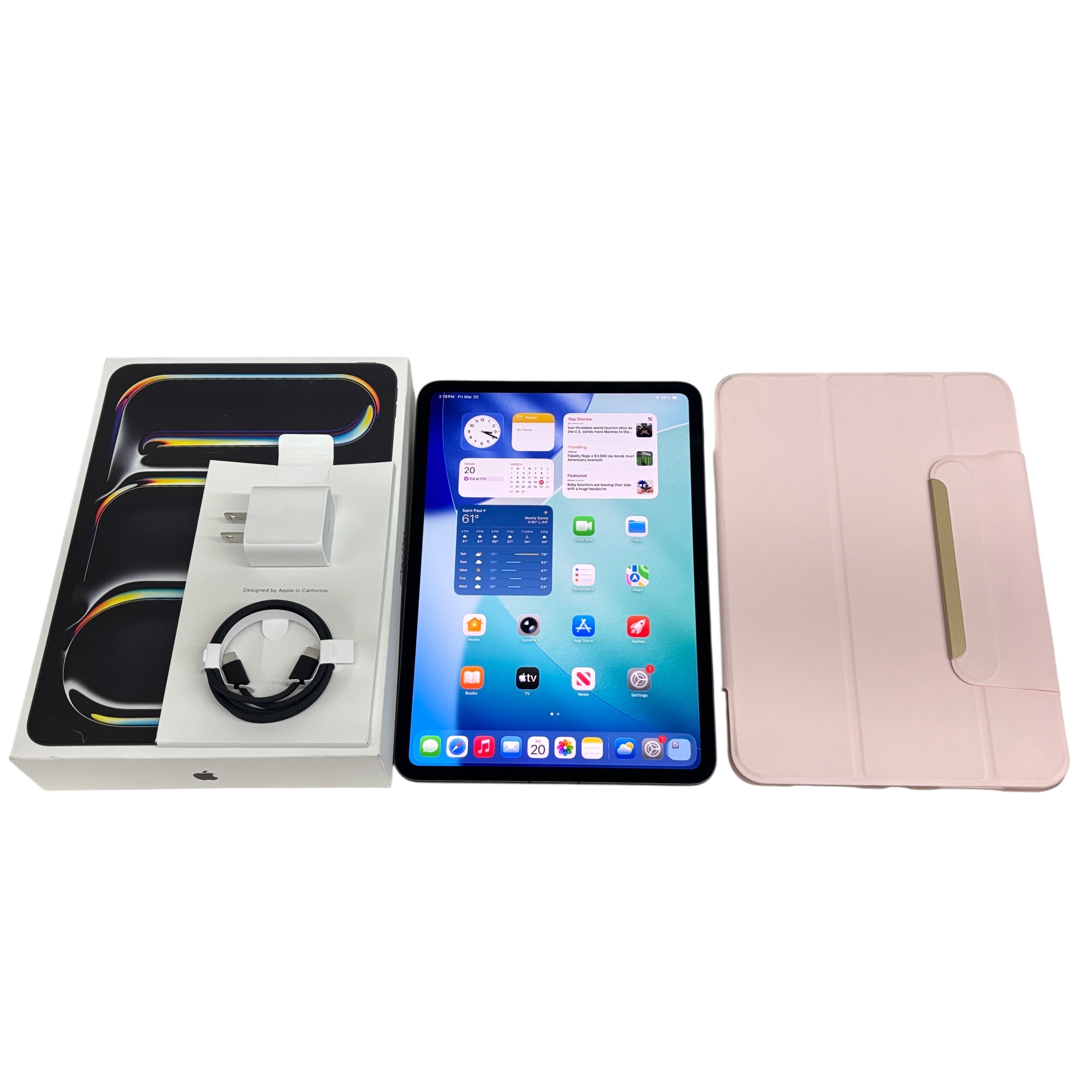 The Apple iPad Pro 11-Inch M5 ME2N4LL/A in Space Black offers a stunning Ultra Retina XDR display and powerful Apple M5 chip for seamless multitasking and creative workflows. This tablet includes a charger and a pink protective case, making it ready for both work and entertainment. With its slim profile and lightweight design, it is highly portable for on-the-go use, ideal for professionals and creatives seeking high performance in a compact form factor.