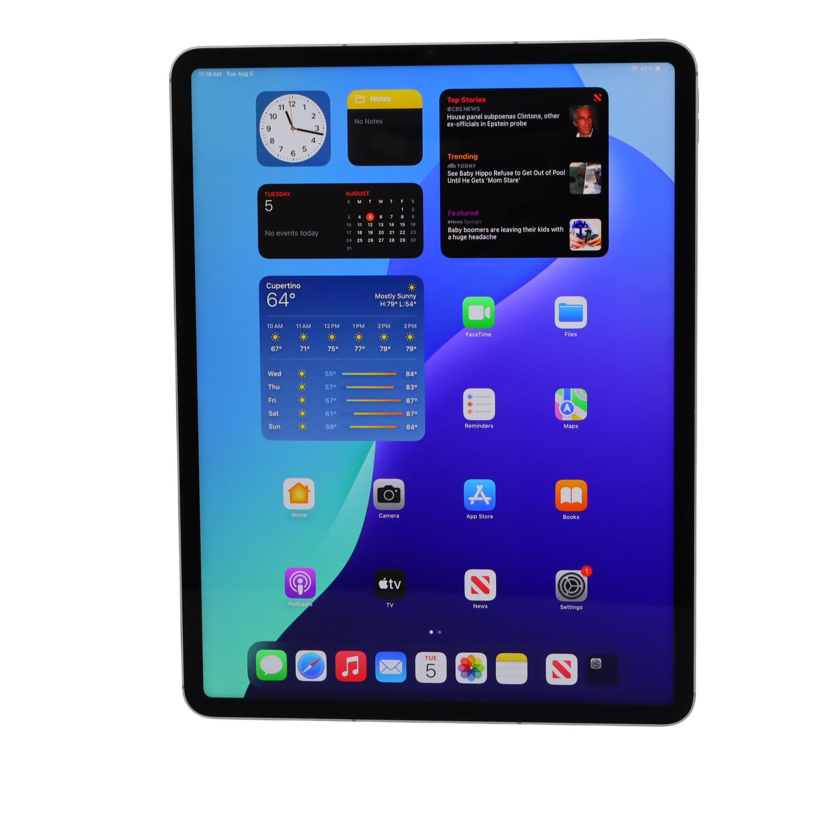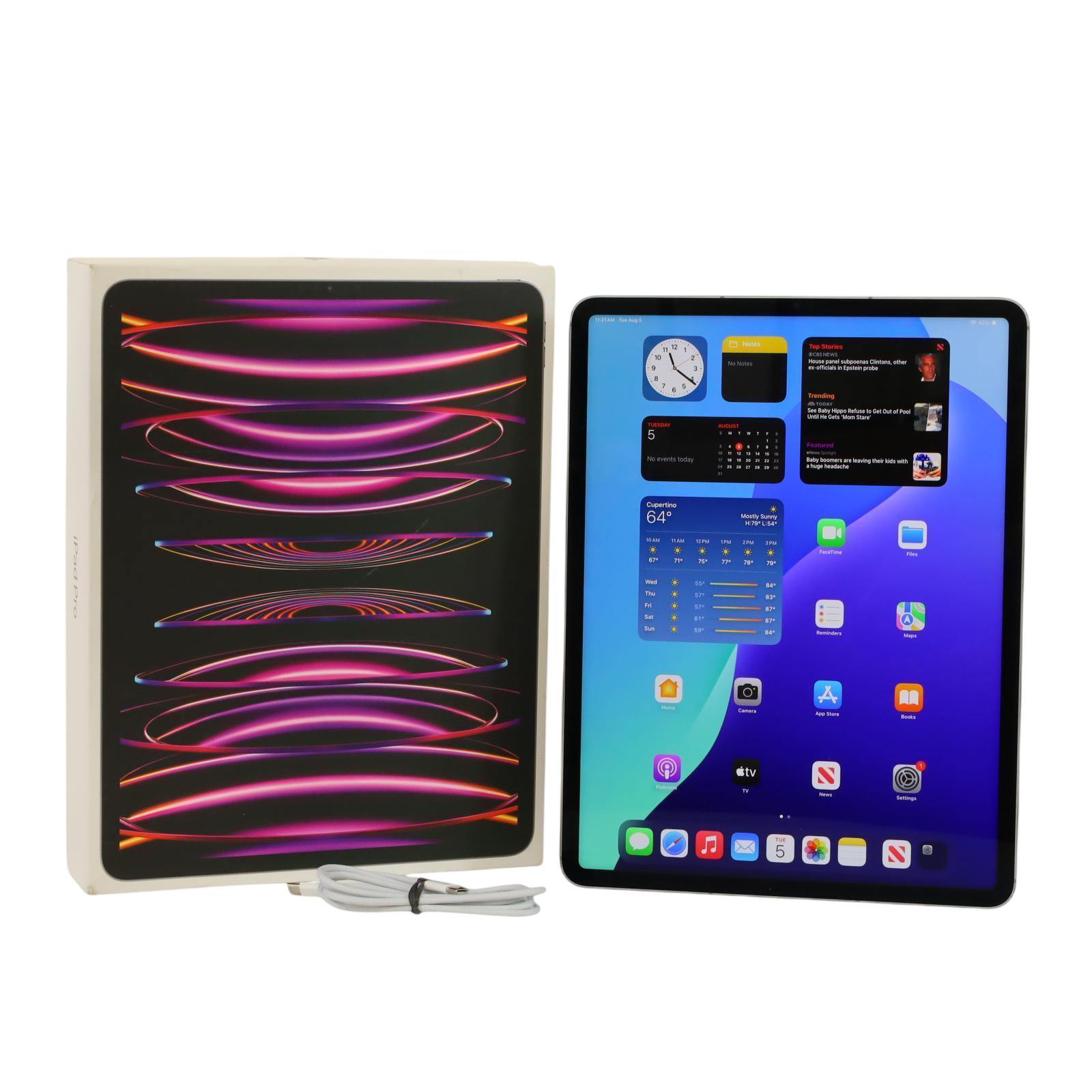 A versatile tablet featuring a 12.9-inch Liquid Retina XDR display with ProMotion, True Tone, and P3 wide color for vivid visuals. It is powered by an M2 chip, which includes an 8-core CPU and a 10-core GPU, delivering robust performance for a variety of tasks. The device is equipped with a 12MP Wide and 10MP Ultra Wide back camera, along with a LiDAR Scanner for augmented reality experiences, and a 12MP Ultra Wide front camera with Center Stage technology. It offers superfast Wi-Fi 6E and 5G cellular connectivity, a USB-C connector that supports Thunderbolt / USB 4, and Face ID for secure authentication and Apple Pay.