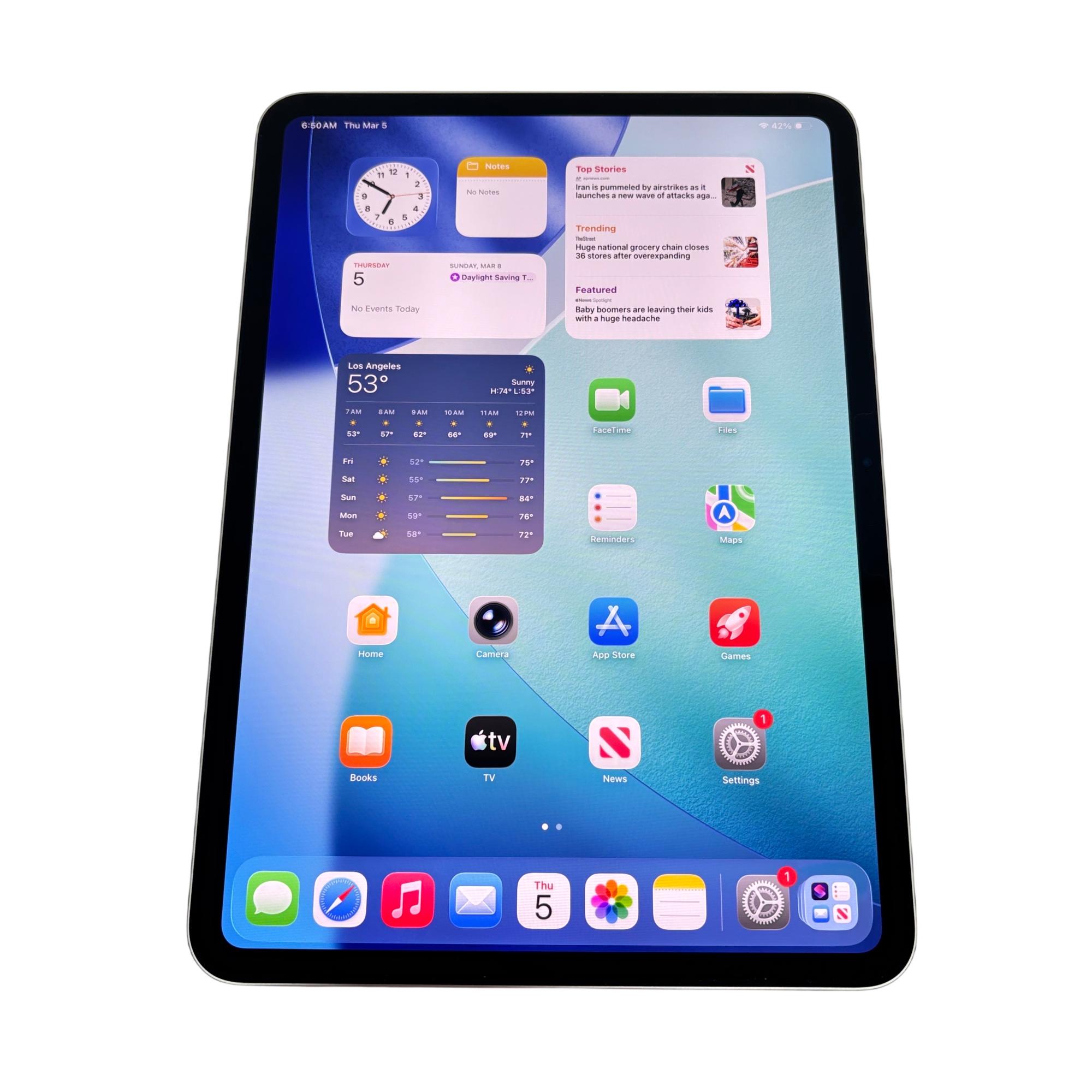 Apple iPad Pro 11" (5th Generation) Wi-Fi, Silver features a sleek silver design with a vibrant 11-inch Liquid Retina display that delivers stunning visuals and true-to-life colors. Powered by the advanced M1 chip, this tablet ensures smooth multitasking and high performance for both professional and entertainment use.