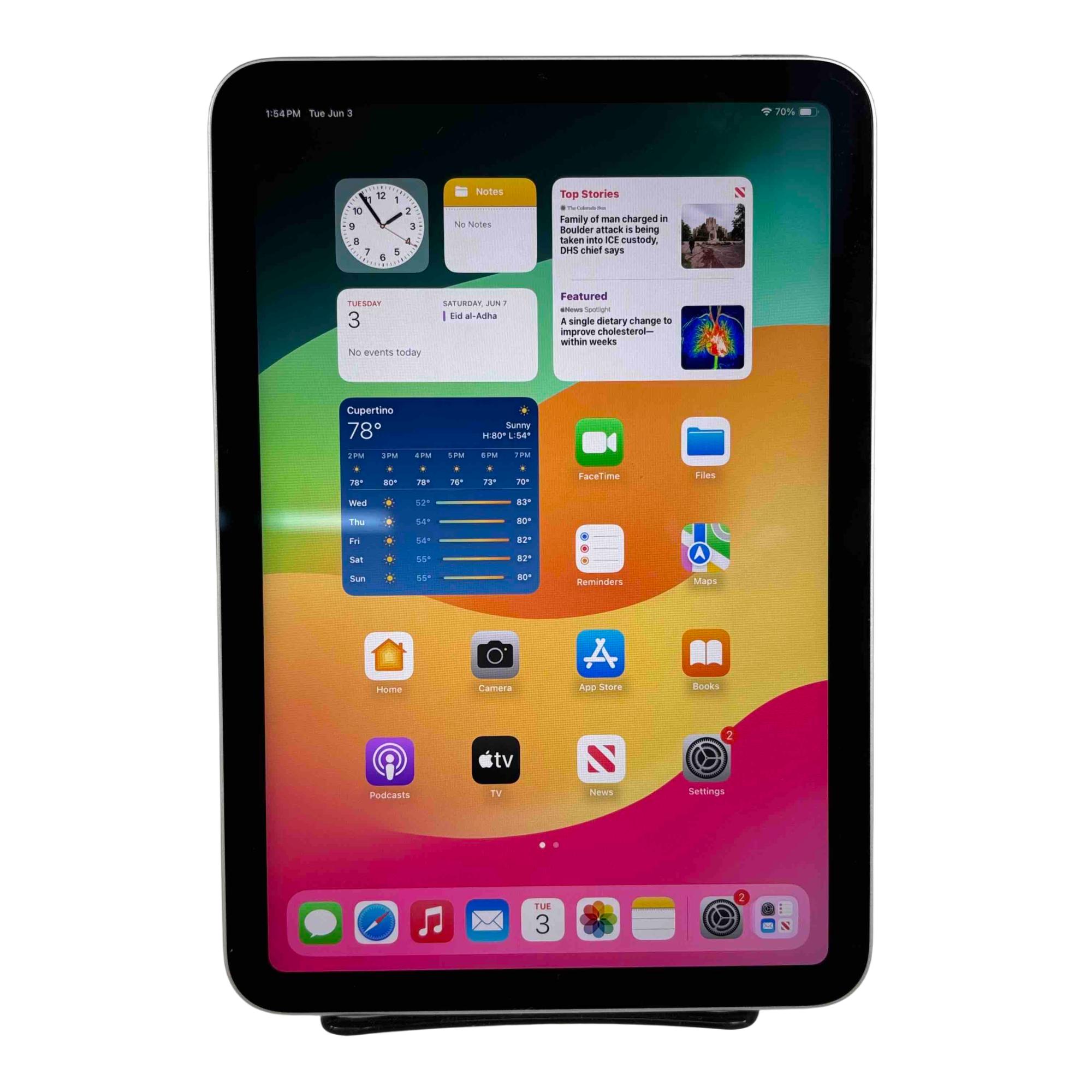 Features an 8.3" Liquid Retina display with a 2266 x 1488 resolution and True Tone technology for sharp visuals and comfortable viewing. Powered by the A15 Bionic chip, it offers a 6-core CPU and 5-core GPU for efficient multitasking, gaming, and creative applications. The iPad mini has 64GB of storage and supports Wi-Fi 6 (802.11ax) for fast connectivity. It includes a 12MP Ultra-Wide front camera with Center Stage for dynamic video calls and a 12MP rear Wide camera capable of 4K video recording. The device is equipped with a 5 Gb/s USB Type-C port for connectivity and supports the 2nd Gen Apple Pencil. Touch ID is integrated into the top button for secure access.