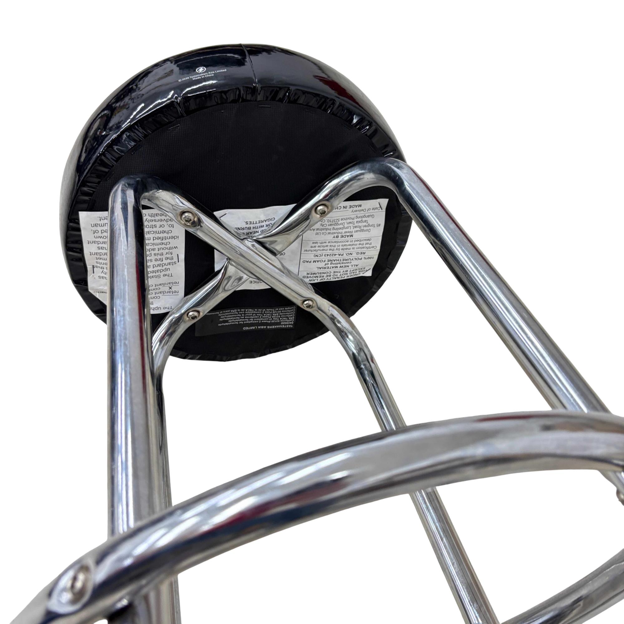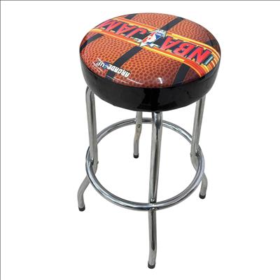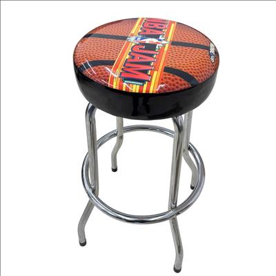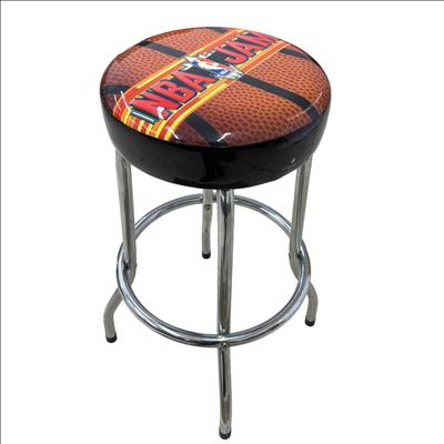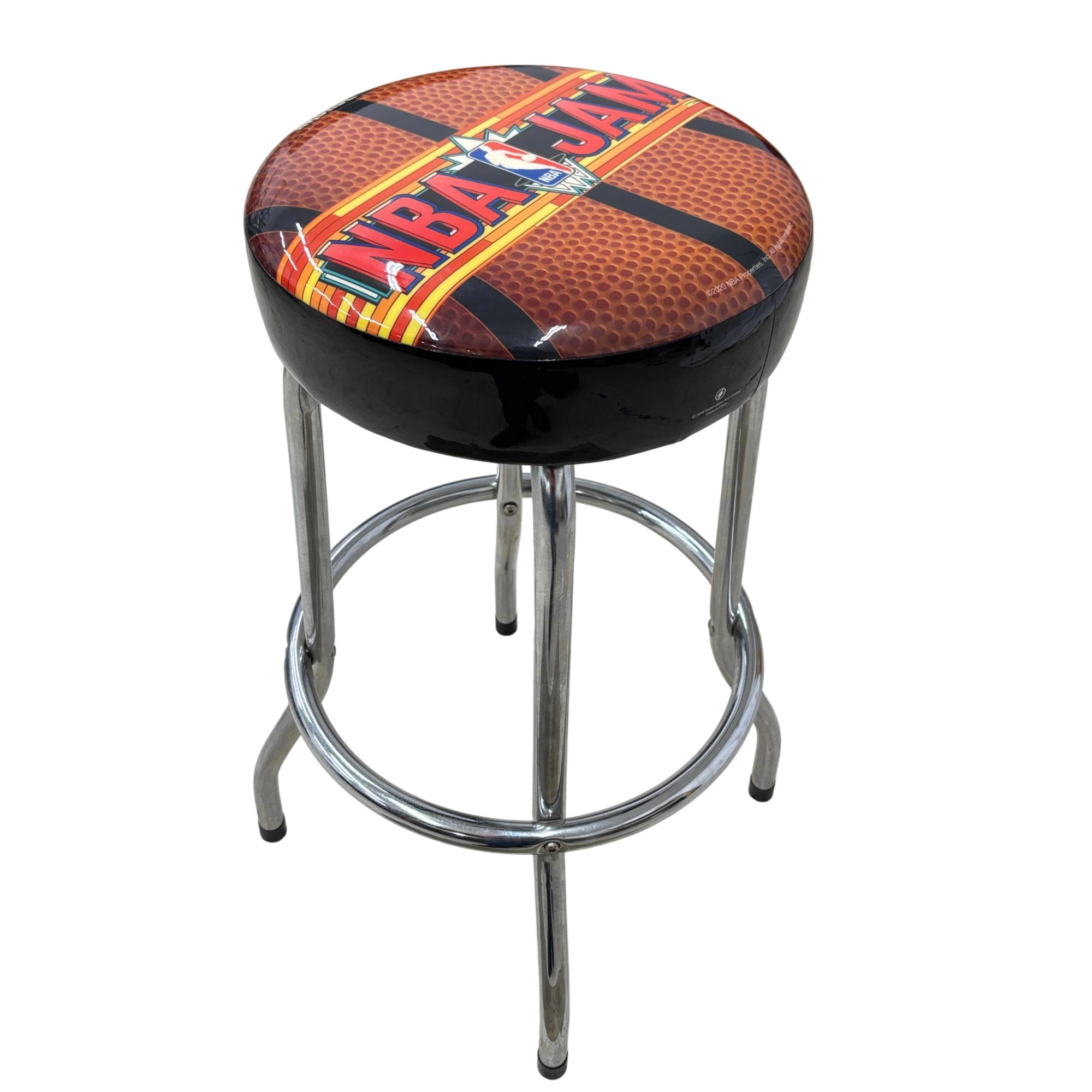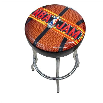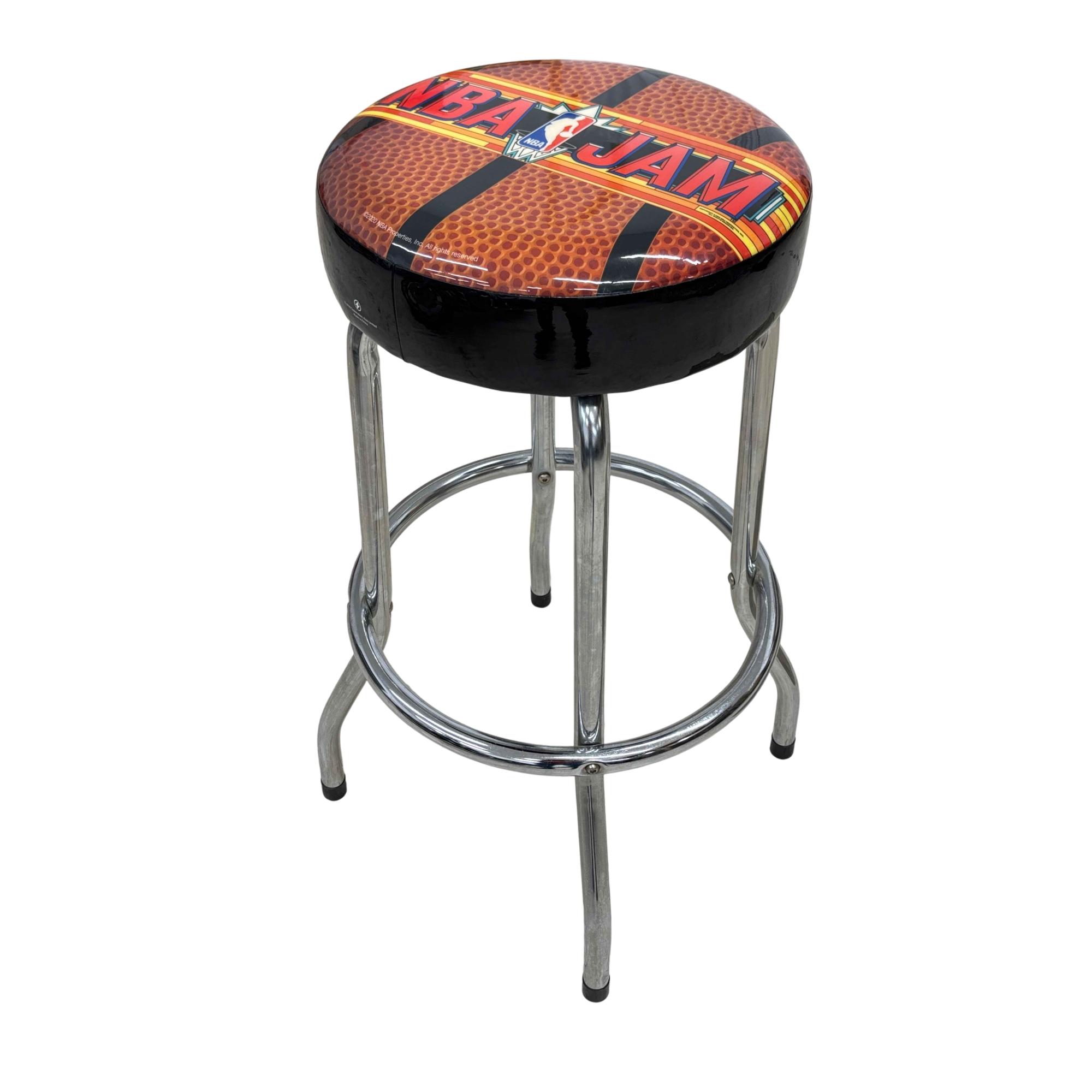 The Arcade1Up NBA Jam Adjustable Bar Stool with Chrome Legs features a basketball-themed seat design and a sturdy black cover with metal legs for durability. The height adjusts smoothly from 21.5 to 29.5 inches, making it perfect for game rooms or home bars. Designed with a sleek black and chrome finish, it combines comfort and style while capturing the spirit of classic arcade gaming.