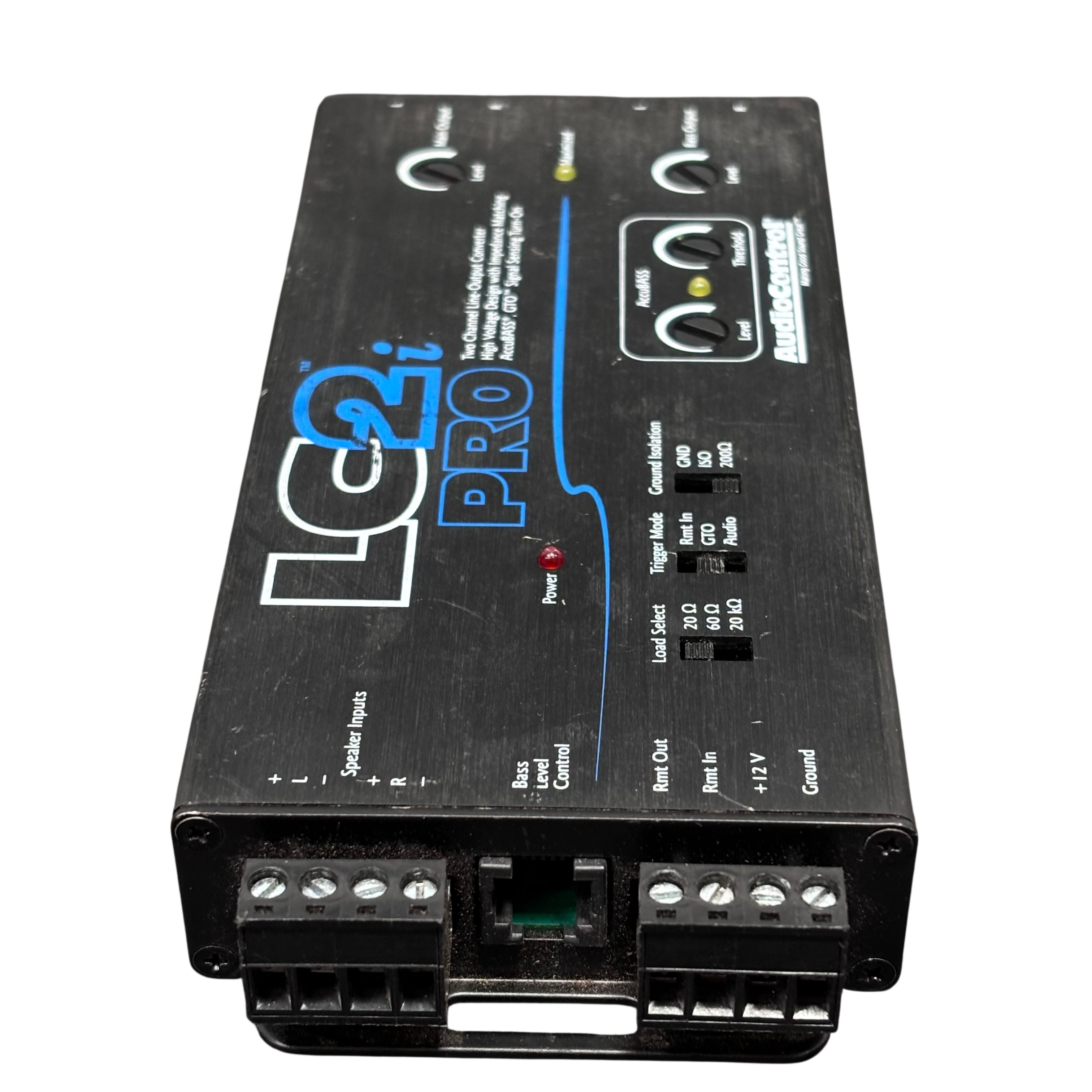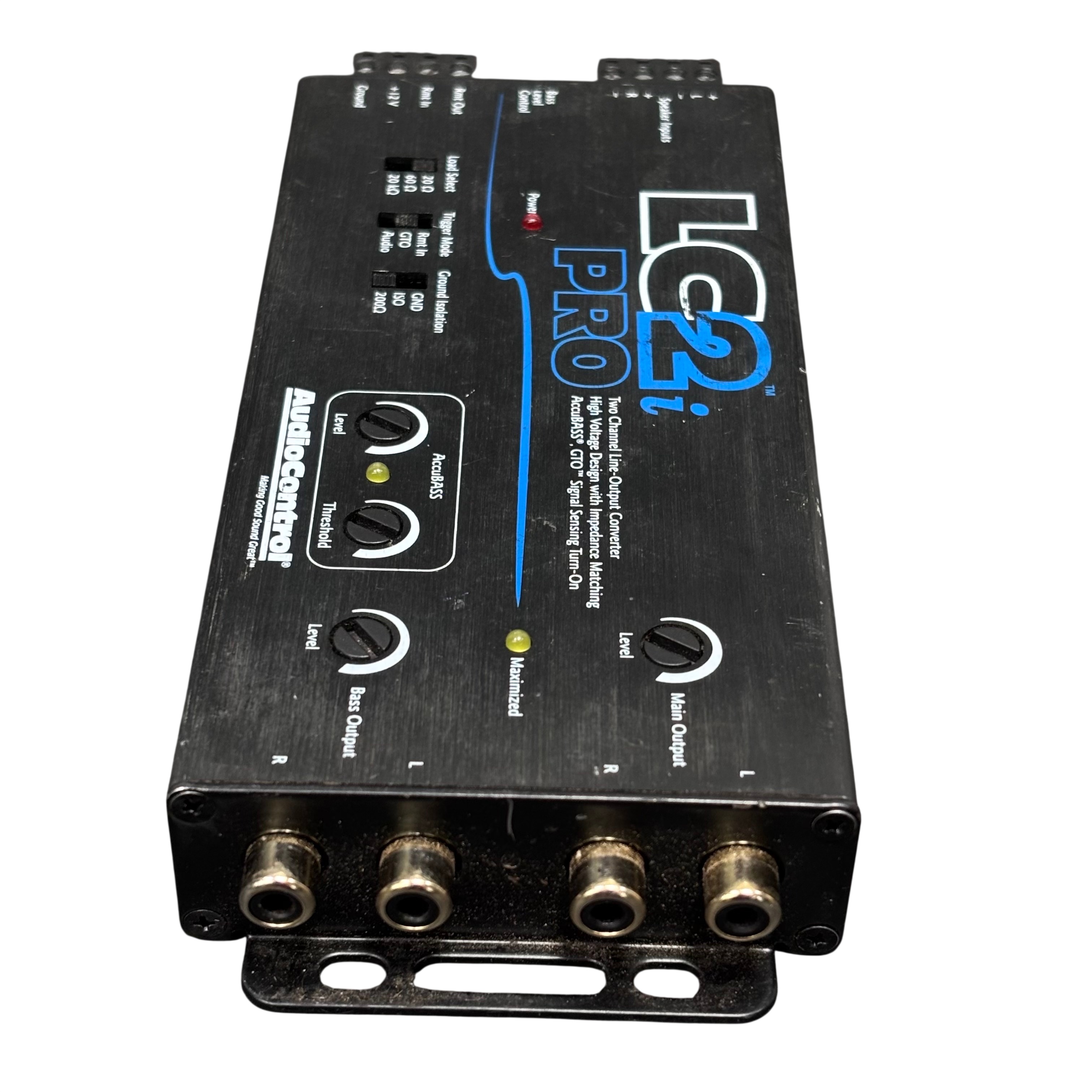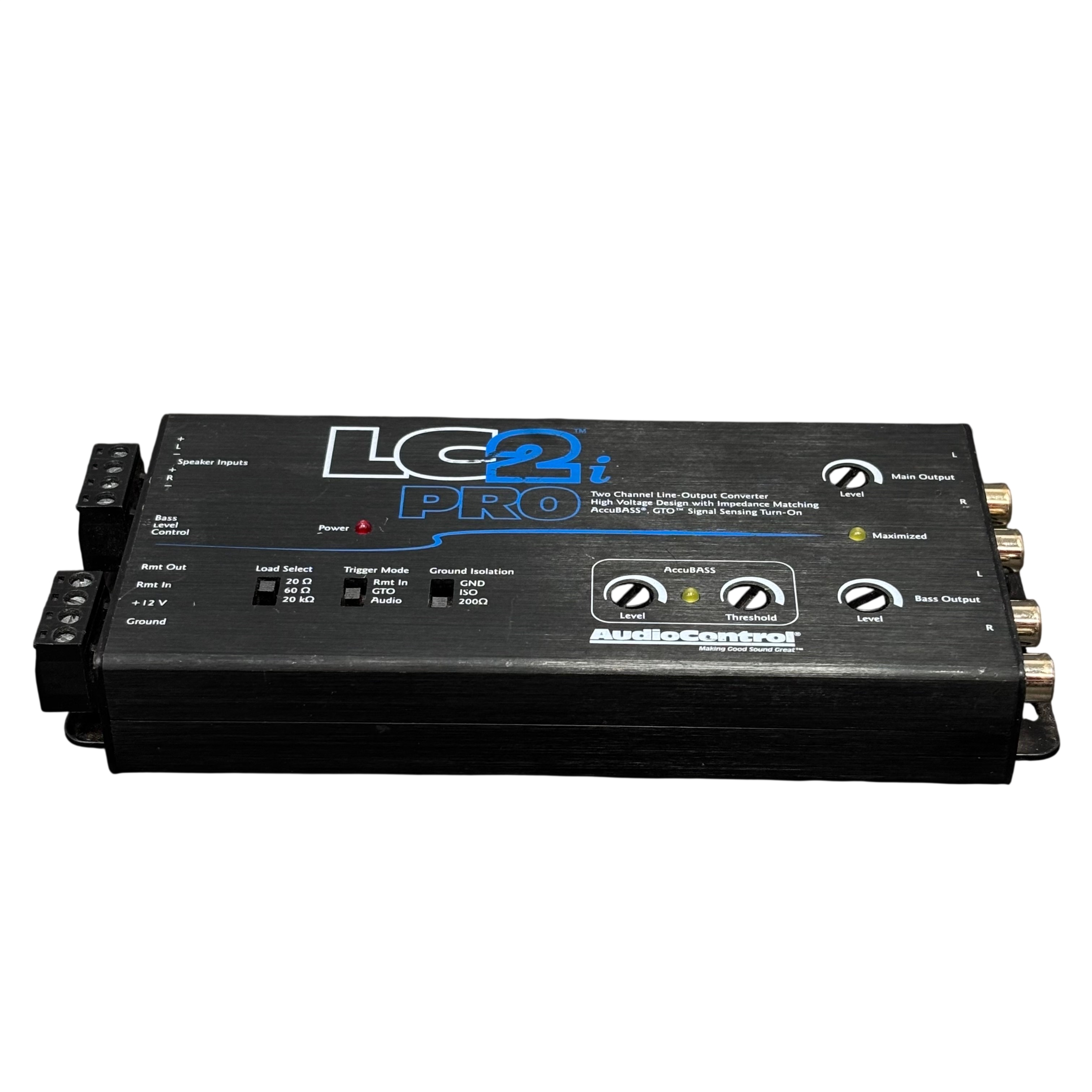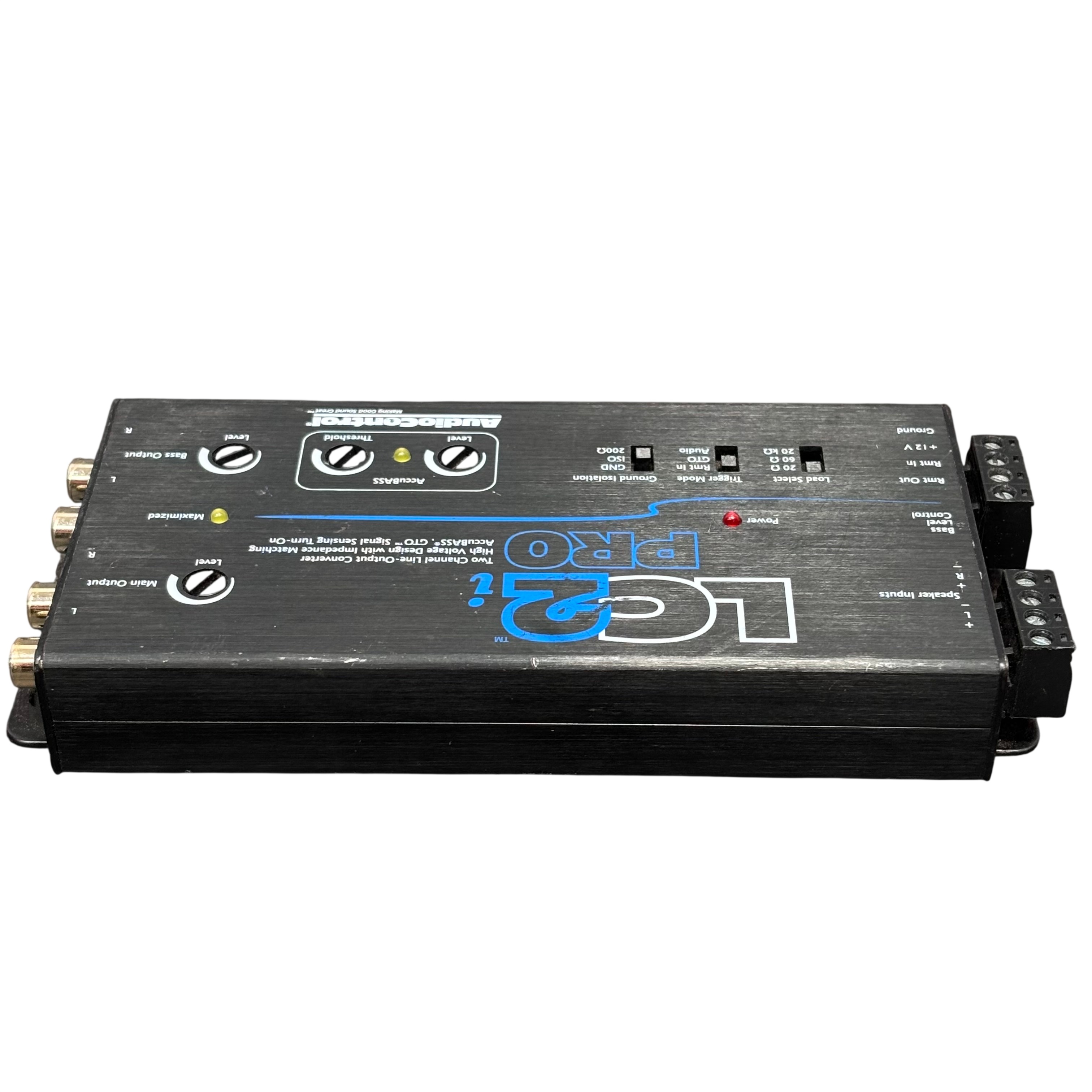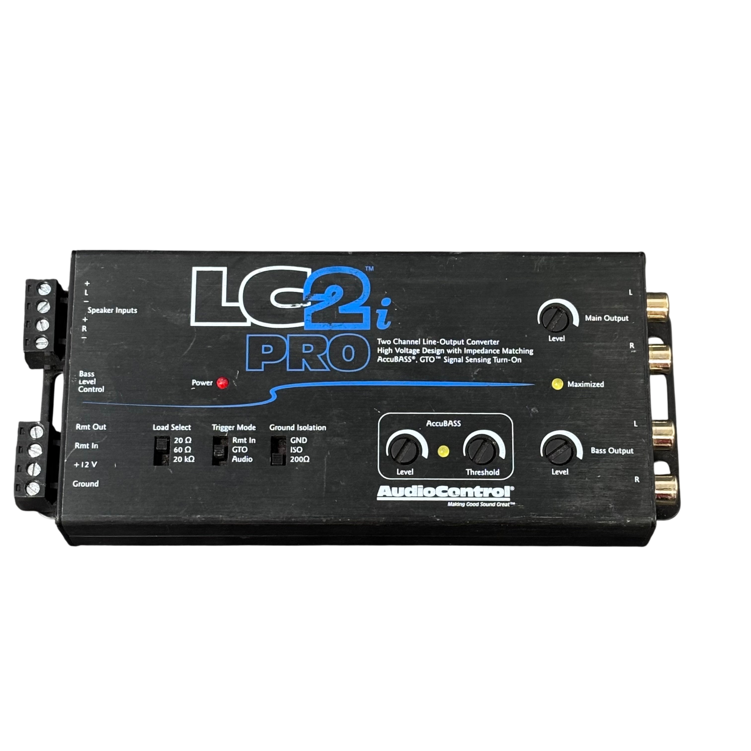 The AudioControl LC2iPro Two Channel Line-output Converter is designed to provide high-quality audio signal conversion with impedance matching for optimal sound performance. Featuring AccuBASS technology and GTO signal sensing turn-on, this converter ensures enhanced bass response and automatic signal detection. It includes adjustable load select switches, trigger modes, and ground isolation to minimize noise and interference. Ideal for upgrading factory audio systems, the LC2iPro offers precise control over bass and main output levels in a compact, durable metal enclosure.