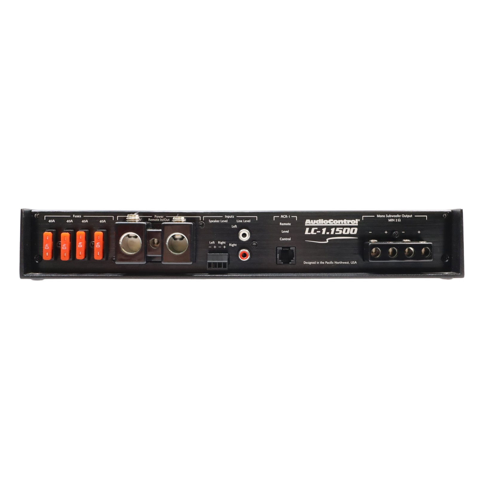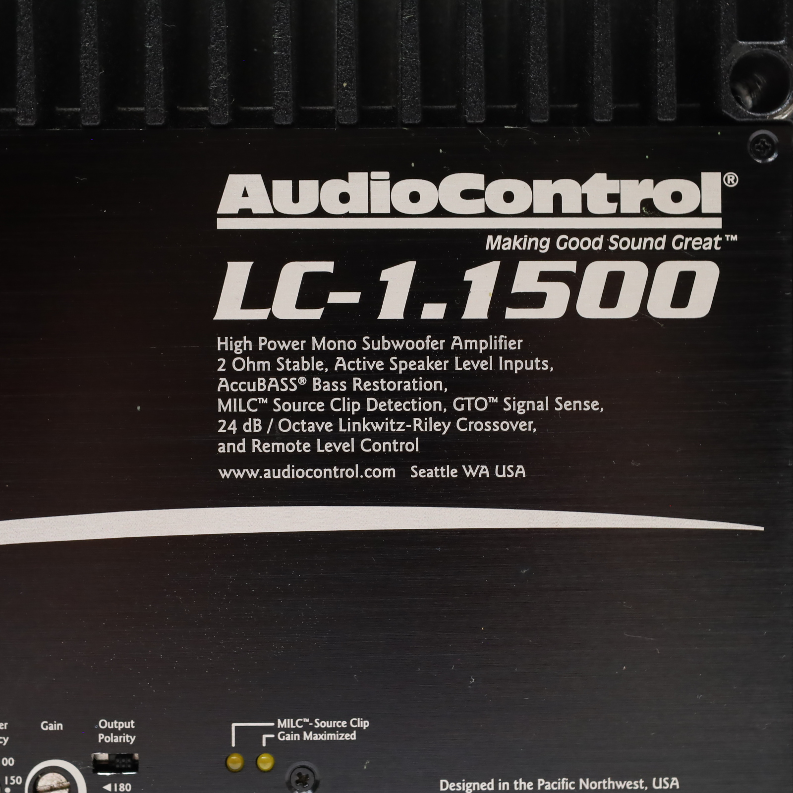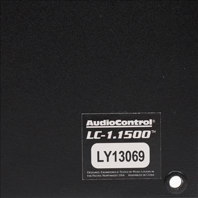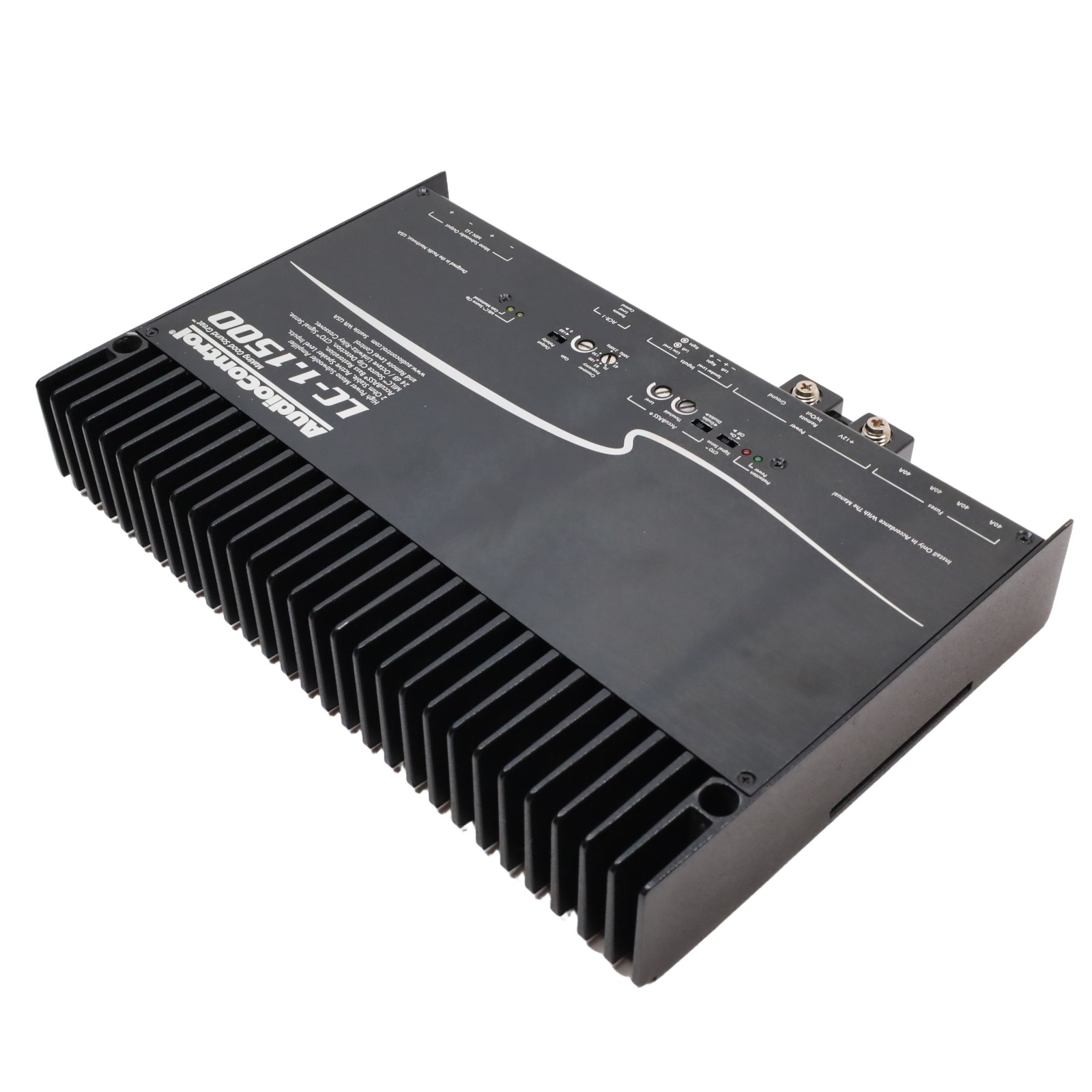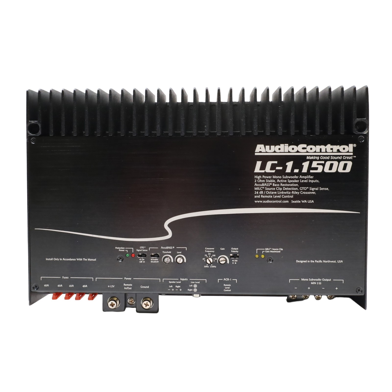 A monoblock car audio amplifier utilizing Class D technology. It delivers 850 watts RMS at 4 ohms and 1500 watts RMS at 2 ohms. Connectivity includes preamp RCA jacks and a 4-pin Euroblock connector for speaker-level inputs, which sum left and right signals internally for mono output. Power and ground terminals accommodate up to 1/0 AWG wire, while the turn-on terminal accepts up to 8-gauge wire. The unit features a variable low-pass filter ranging from 30 to 230 Hz with a 24 dB/octave slope and a fixed subsonic filter at 24 Hz. Control options include an AccuBASS circuit with threshold and level adjustments, a MILC LED system for input clipping and gain maximization status, and a GTO signal-sensing turn-on feature that activates on audio signal detection. The chassis is constructed with a black brushed aluminum cover and black powder-coated cast alloy heat sinks. Speaker output terminals support combined impedance not lower than 2 ohms, and there is a terminal for an external level control remote.