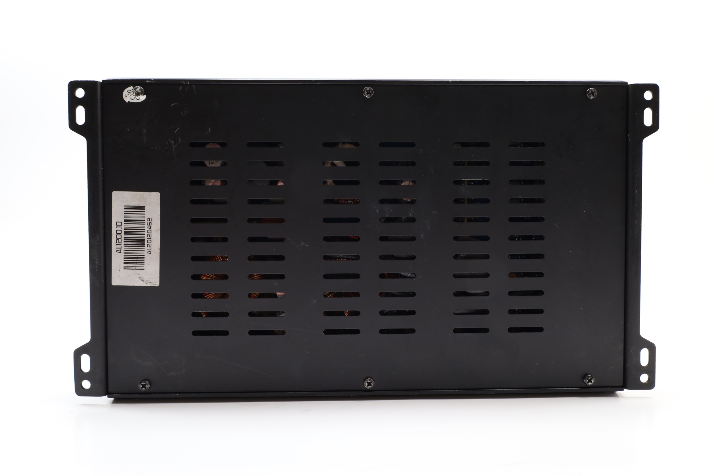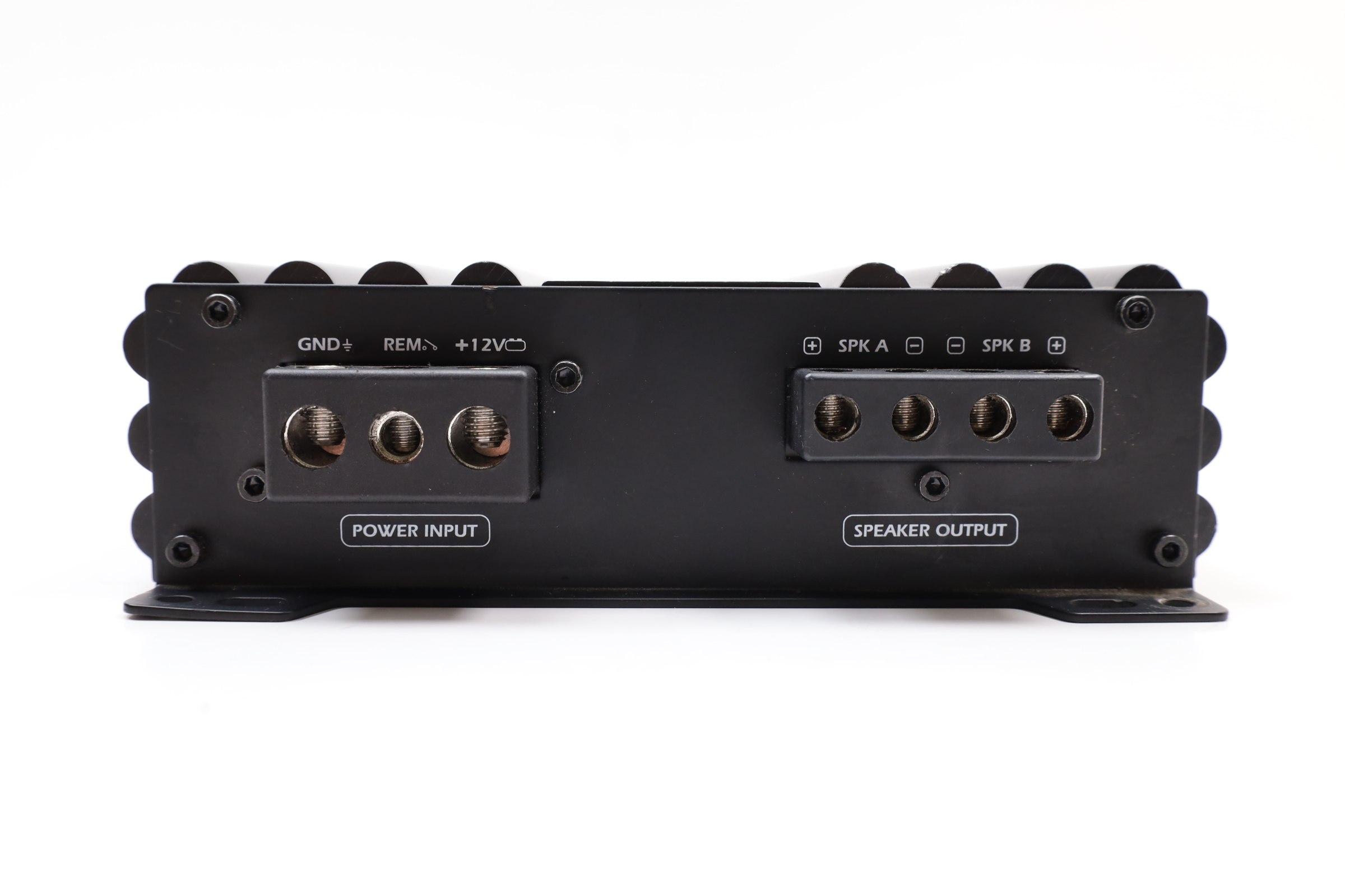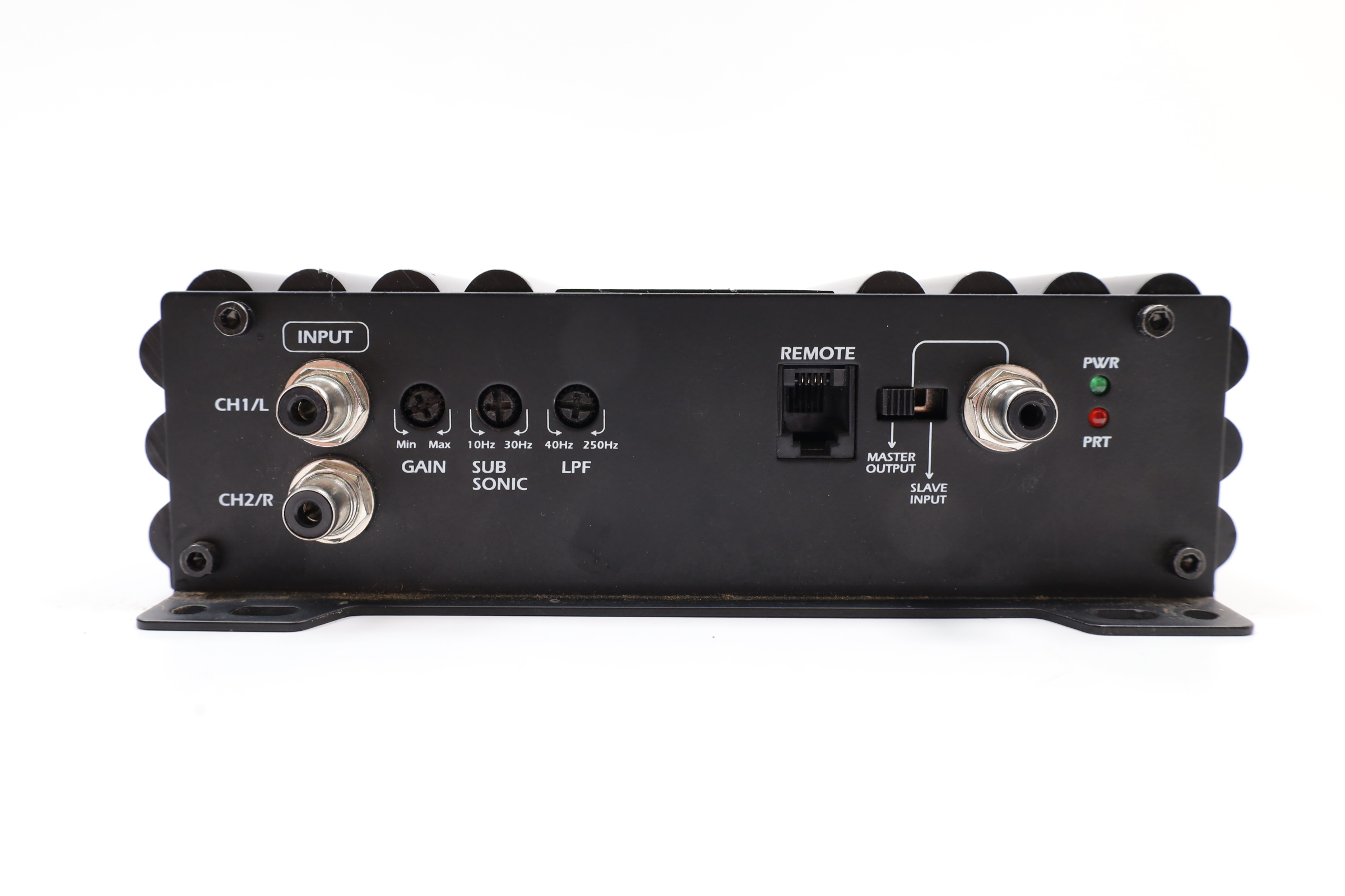 A 1200W Class D Monoblock Car Audio Amplifier, conservatively rated at 1200 watts at 1 Ohm mono, designed for reliable subwoofer performance. It features gain level control, a subsonic filter (1030Hz), and a low pass filter (40250Hz). The RCA inputs use "Tiffany" style connectors for a secure connection, and the amplifier includes on-board LED indicators for power and protection mode status. The package includes a bass knob for convenient driver seat control. The amplifier delivers RMS power of 400 watts at 4 ohms mono, 750 watts at 2 ohms mono, and 1200 watts at 1 ohm mono, with a signal to noise ratio greater than 90dB, frequency response of 10Hz to 350Hz (+/- 1dB), and efficiency of 86% at 4 ohms and 100Hz. It operates within a voltage range of DC 8.5V to 16V and has an input sensitivity of 200mV to 8V.