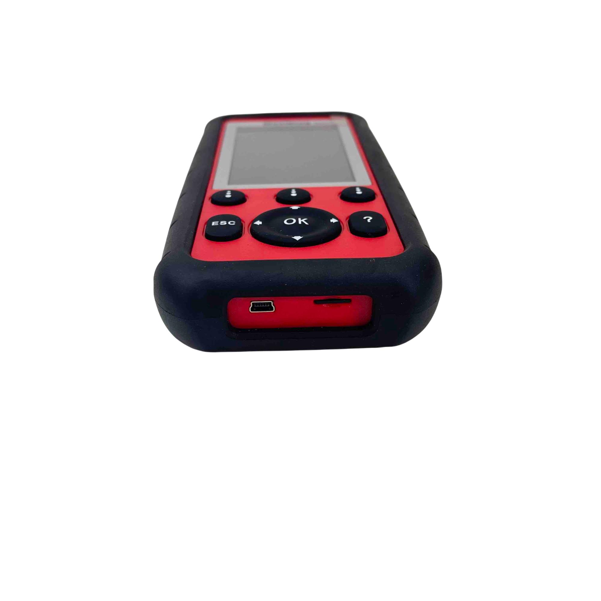 Offers comprehensive diagnostic capabilities, including reading and clearing trouble codes and accessing live data for all vehicle systems. It supports functions such as BMS/Oil Reset, SRS, EPB, and DPF systems, along with oil service reset, battery registration, and reset. The scanner also handles diesel particulate service, steering angle sensor reset, parking brake pad relearn, service mileage and interval resets, and ECU brake warning light deactivation. It can perform O2 monitor, on-board monitor, I/M readiness, and component testing, and prints diagnostic reports via a PC connection. Suitable for U.S. domestic, Asian, and European makes and models, it supports all OBD II protocols, test modes, and enhanced mode 6. The device features a 400 MHz ARM Thumb processor, 32MB of memory, a 4.0 inch LCD display with 800x480 resolution, and mini USB connectivity.