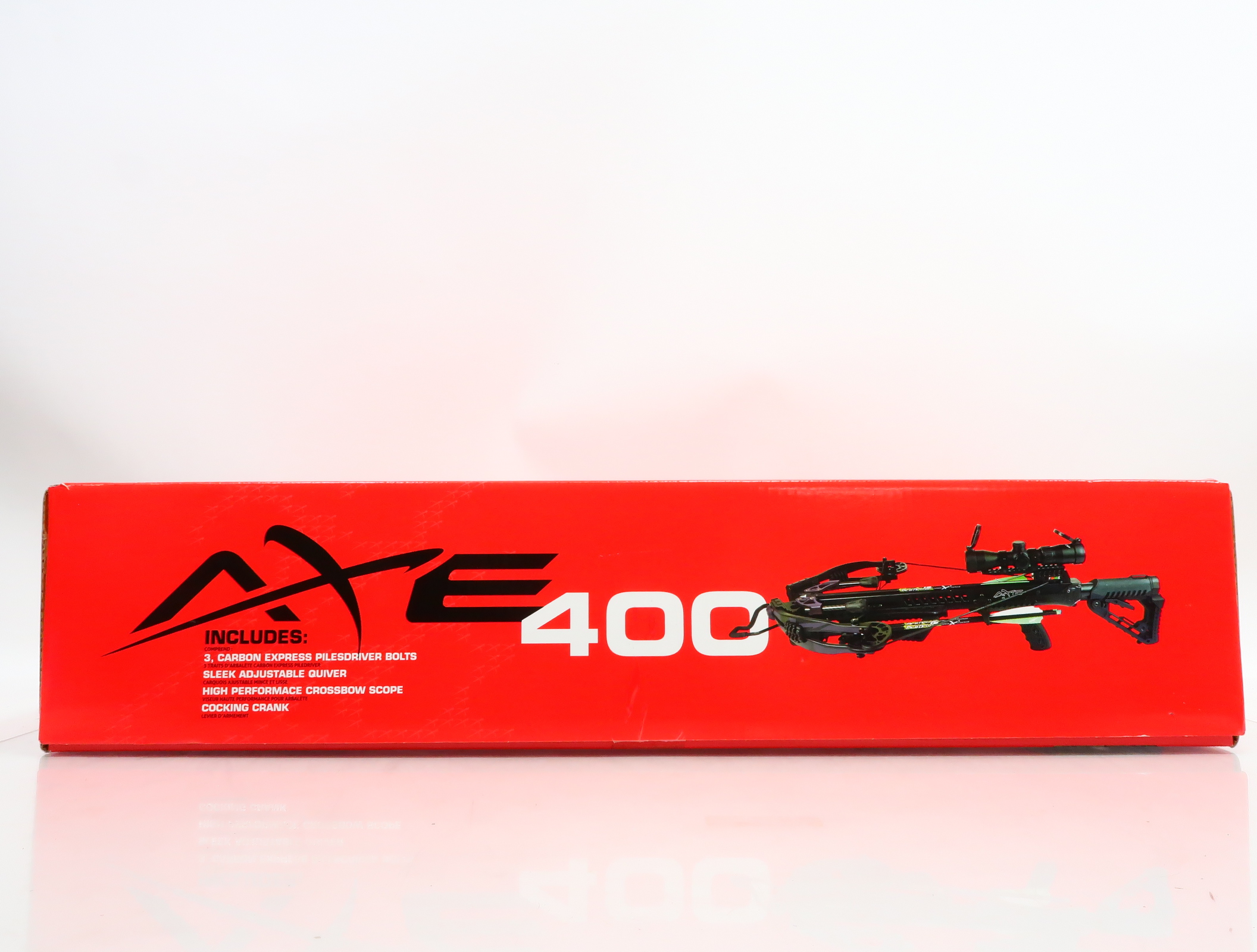 The Carbon Express AXE 400 is a feature-rich high-performance crossbow that won’t break the bank. Producing a bolt speed of up 400 fps (20-100 yd range) the AXE 400 offers plenty of power great reliability and comes with everything you need to hit the range including three Carbon Express Pile Driver bolts and an illuminated scope.