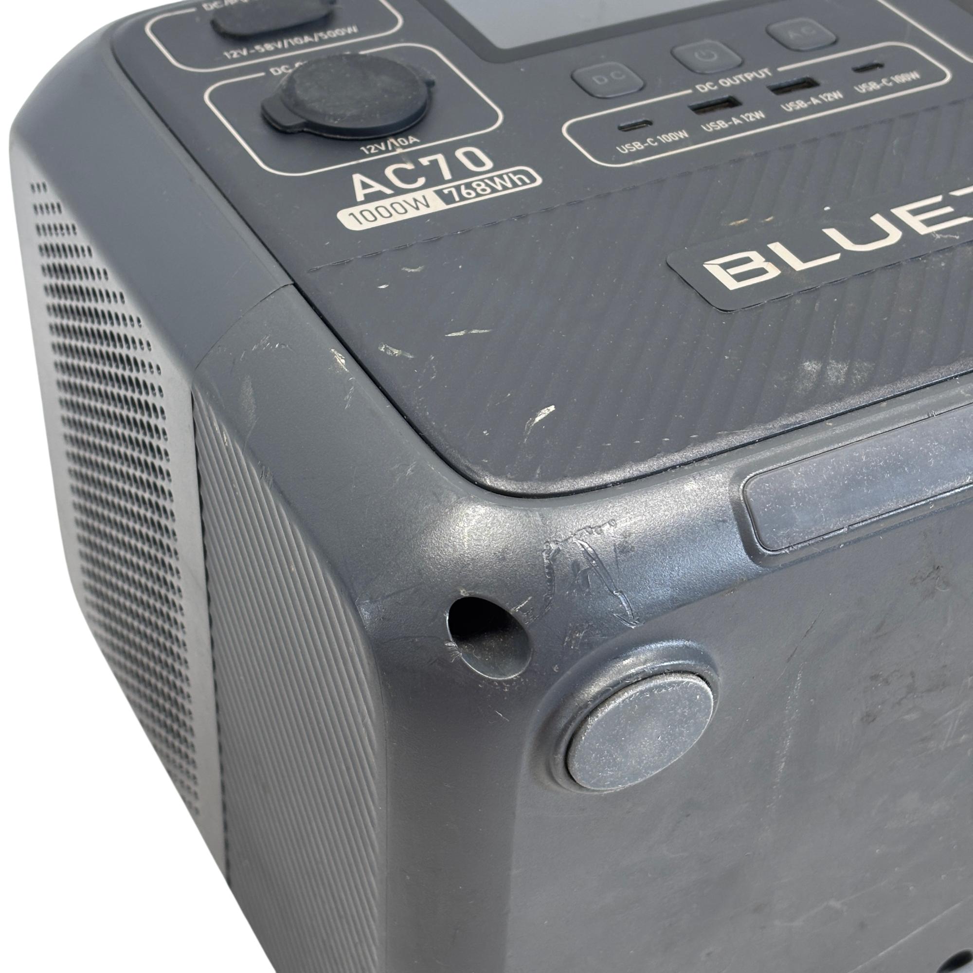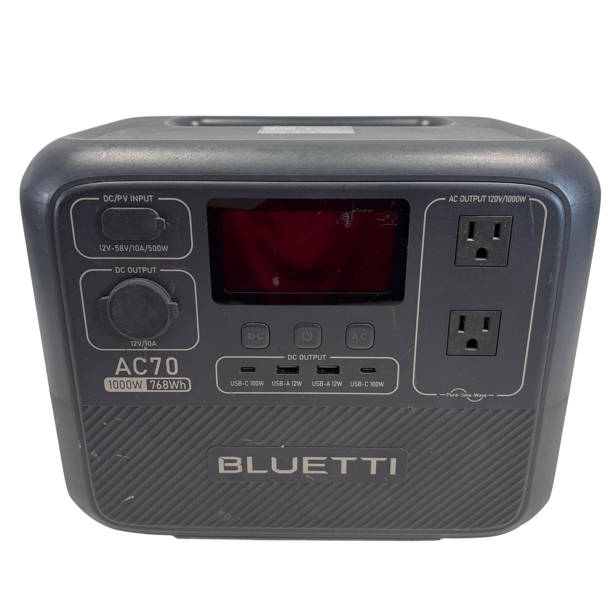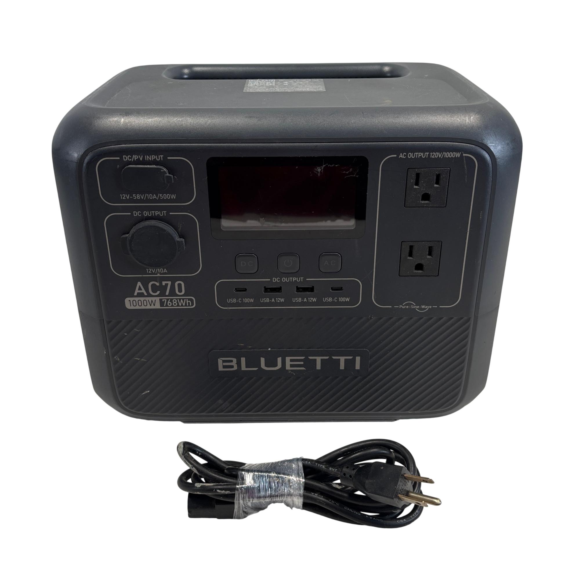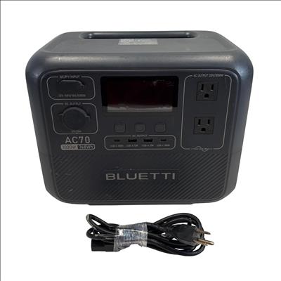 The BLUETTI AC70 Portable Power Station is a compact and powerful device featuring a lithium battery designed for versatile off-grid power needs. It includes multiple output options such as USB-C, USB-A, and AC output with a pure sine wave, making it suitable for charging a wide range of electronics and appliances. This portable generator supports a 12V-58V DC/PV input up to 10A and delivers up to 500W for DC output, optimized for outdoor, emergency, and backup power applications.