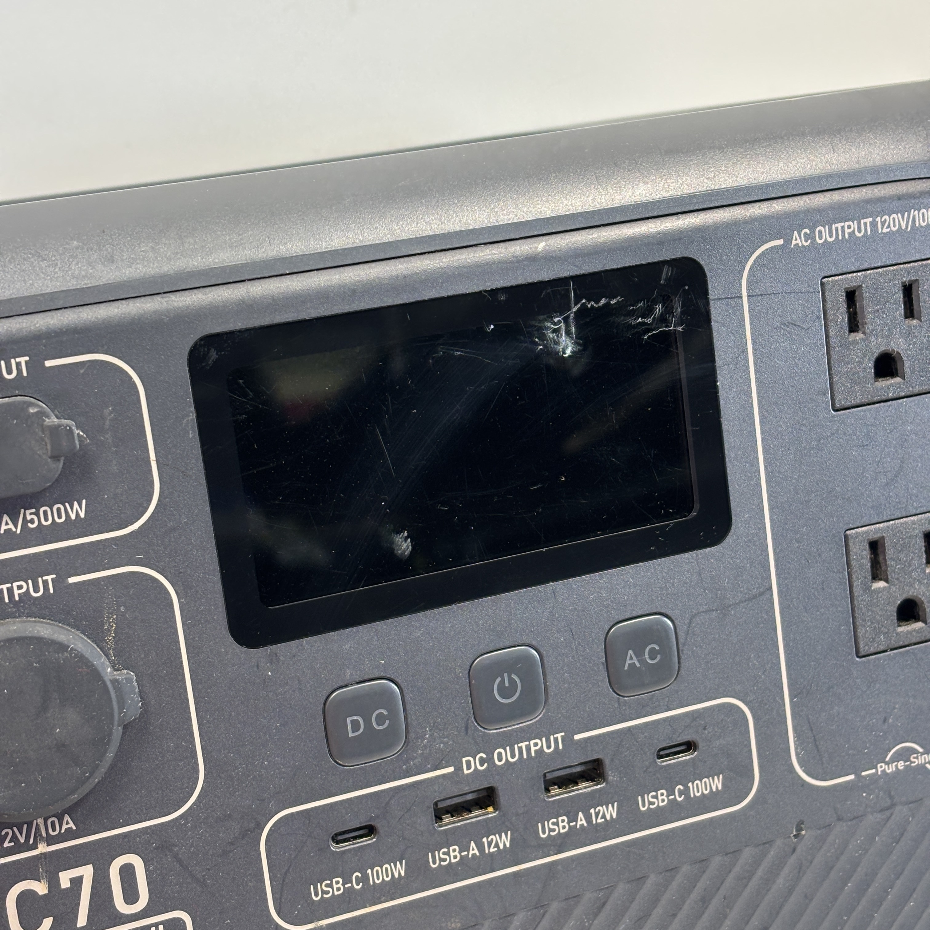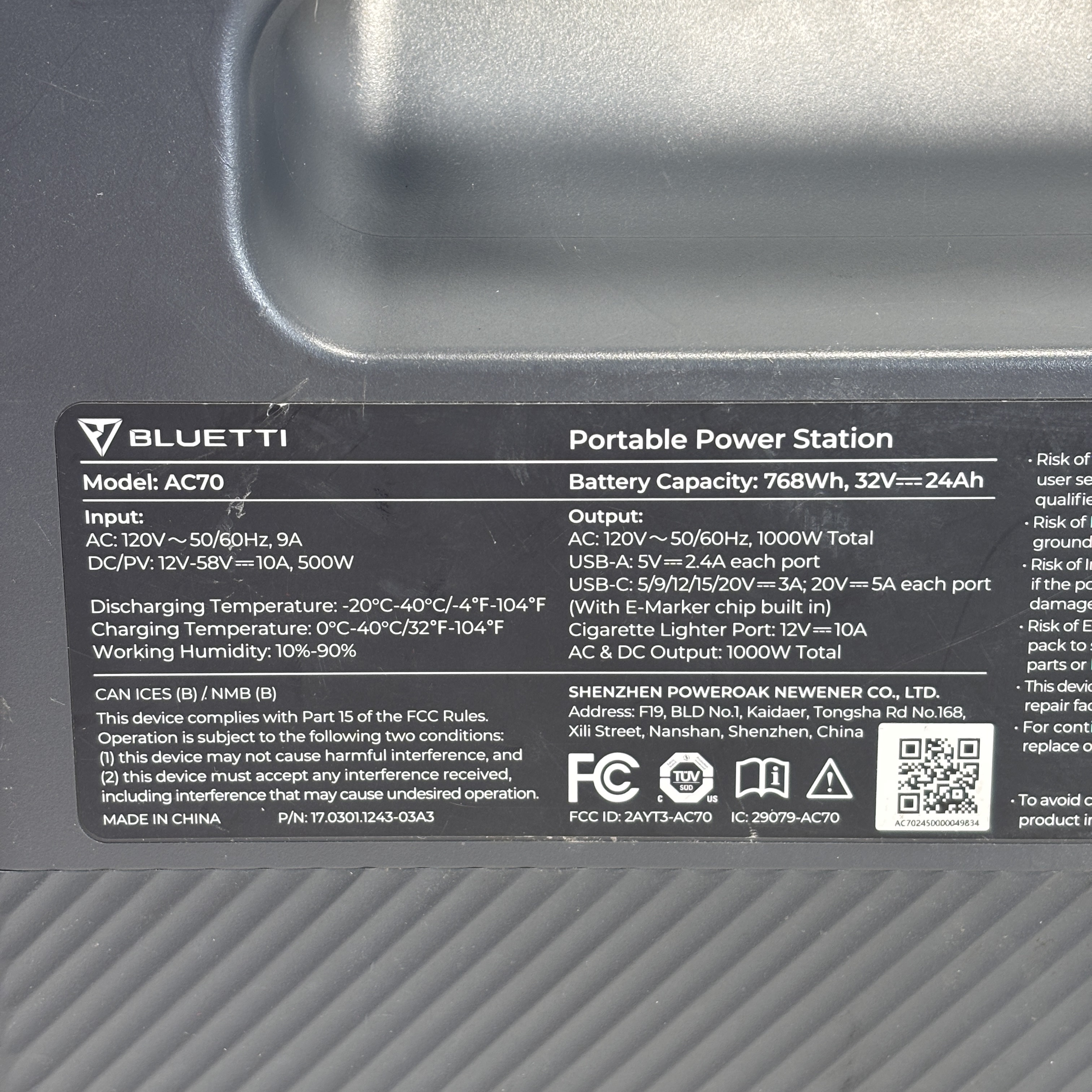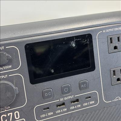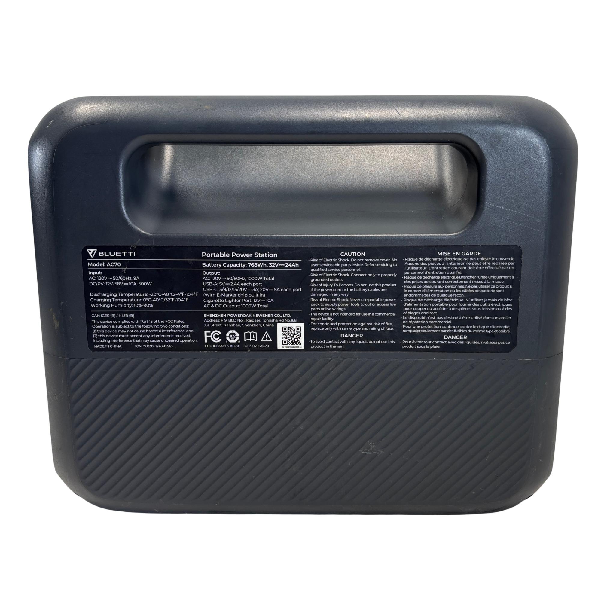 The BLUETTI AC70 Portable Power Station is a compact and powerful device featuring a lithium battery designed for versatile off-grid power needs. It includes multiple output options such as USB-C, USB-A, and AC output with a pure sine wave, making it suitable for charging a wide range of electronics and appliances. This portable generator supports a 12V-58V DC/PV input up to 10A and delivers up to 500W for DC output, optimized for outdoor, emergency, and backup power applications.