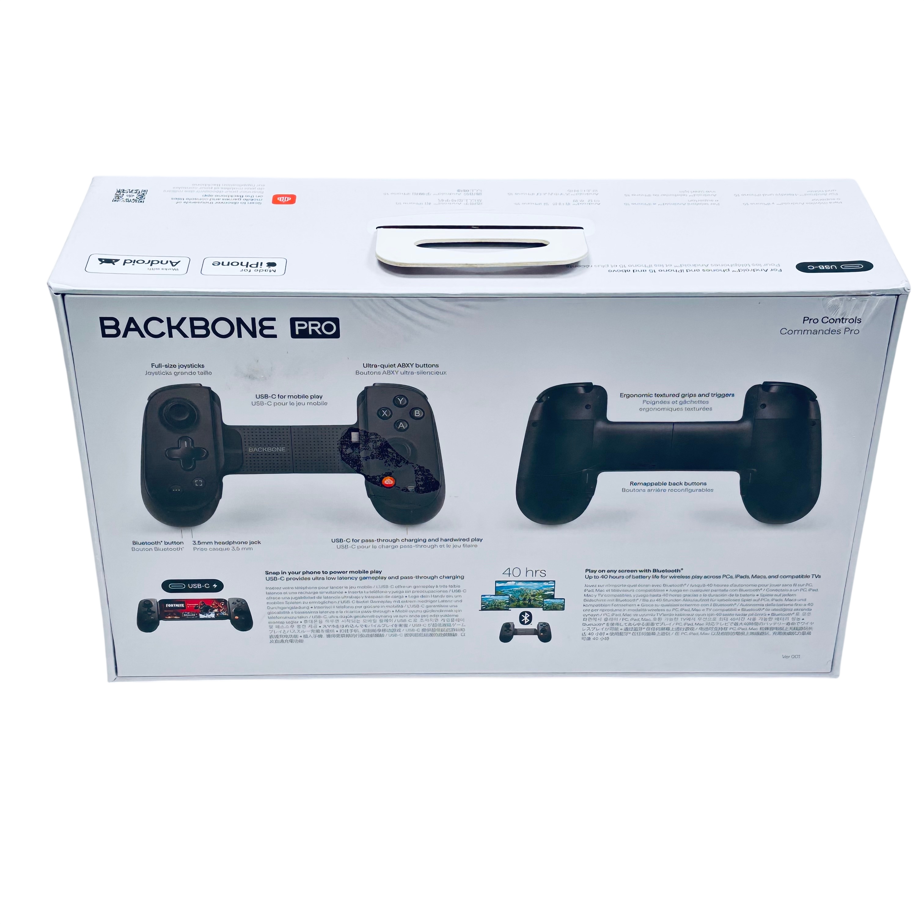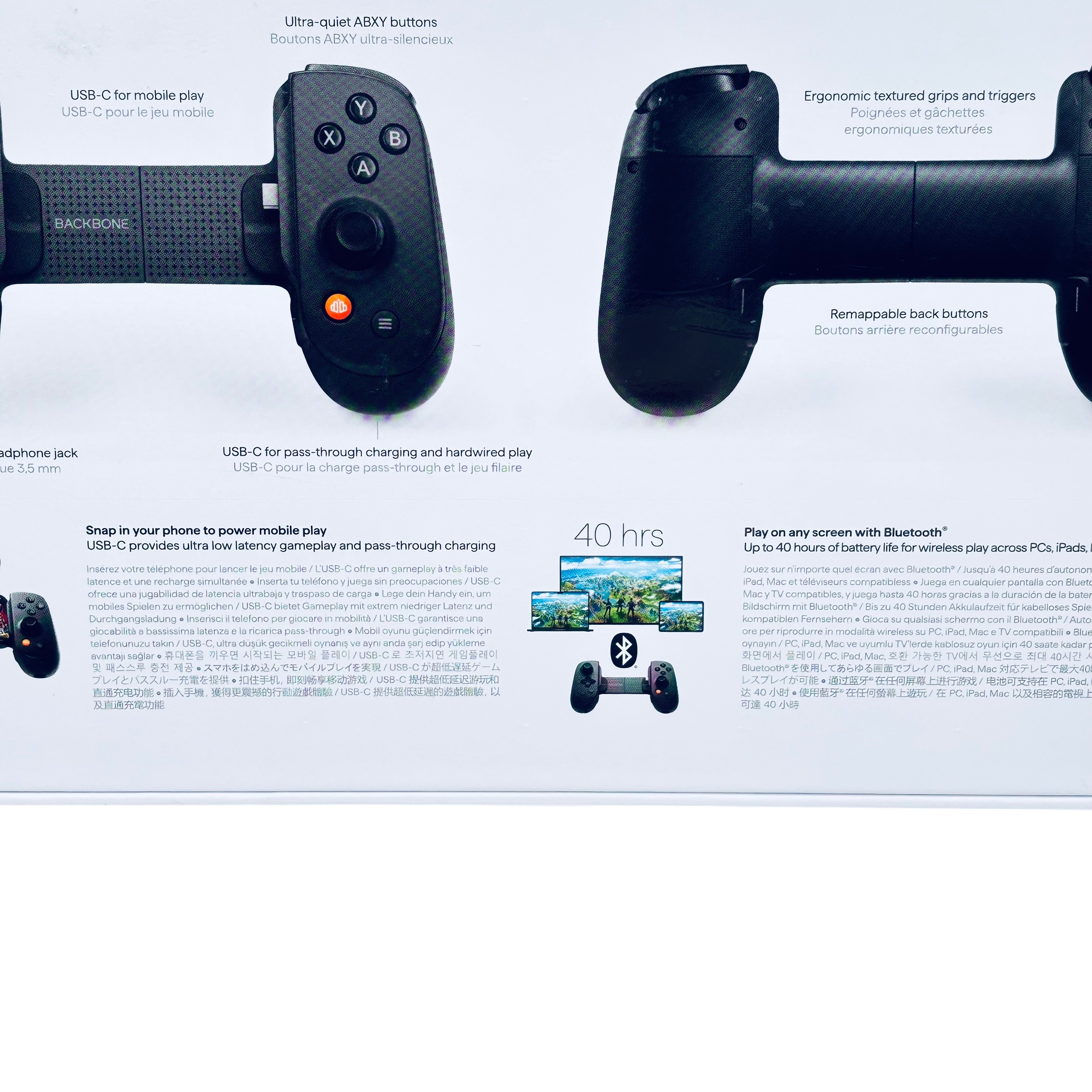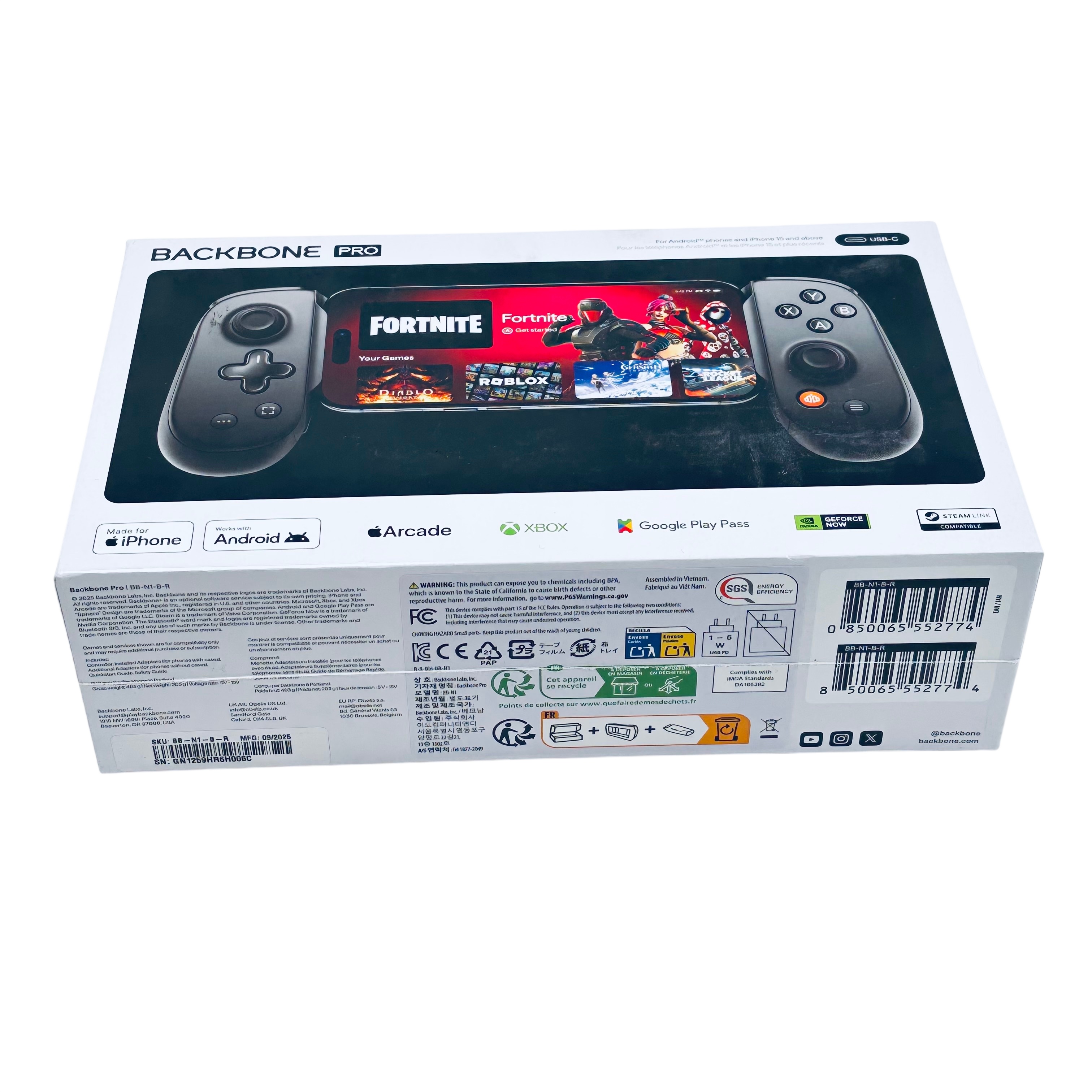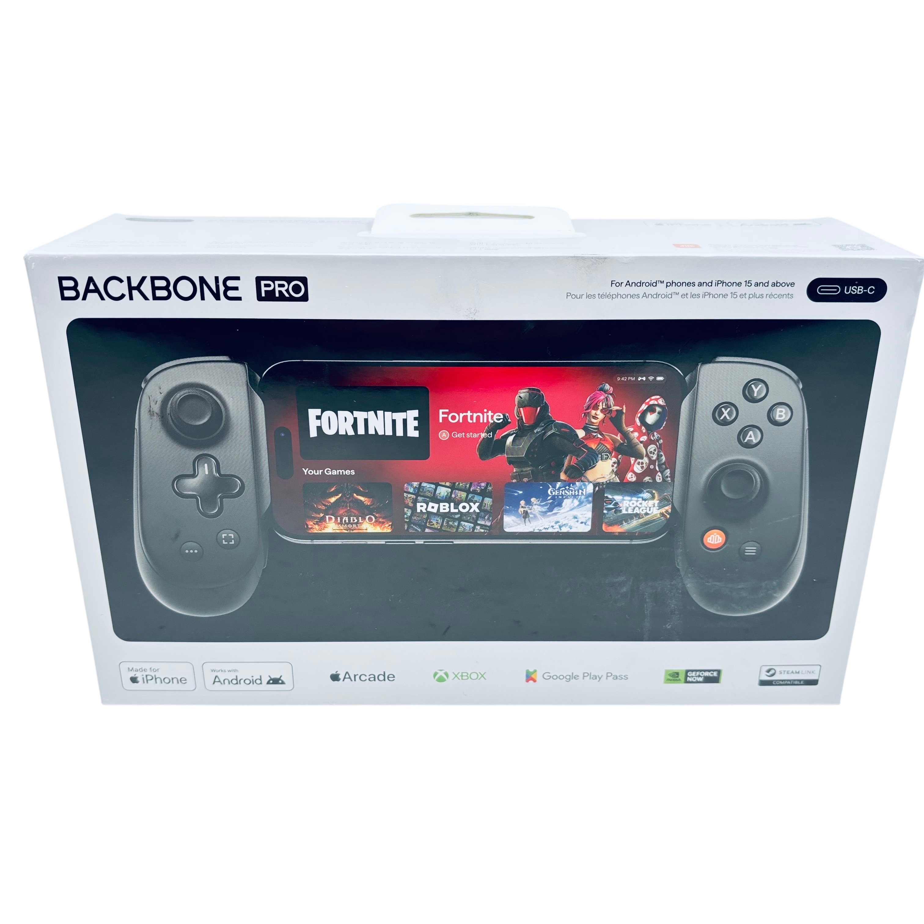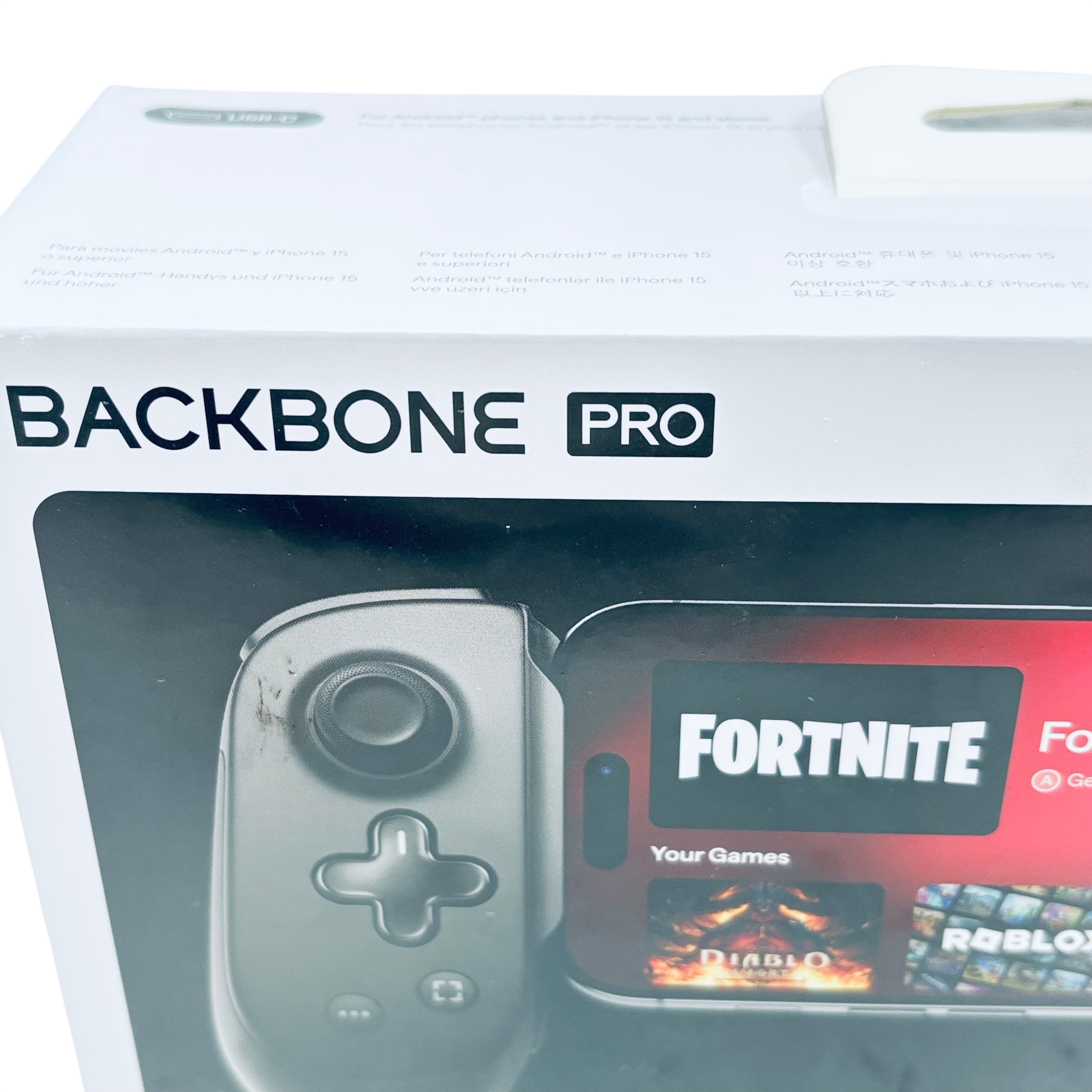 The Backbone Pro USB-C Controller (Model BB-N1-B-R) is a premium mobile gaming controller designed for Android phones and iPhone 15 and above. Featuring USB-C connectivity, it offers ultra-low latency gameplay with pass-through charging to keep your device powered during extended sessions. The controller includes ergonomic textured grips, ultra-quiet ABXY buttons, remappable back buttons, and a 3.5mm headphone jack for an immersive gaming experience. Compatible with popular gaming platforms like Apple Arcade, Xbox, Google Play Pass, and Steam Link, this controller is perfect for gamers seeking precision and comfort on the go.