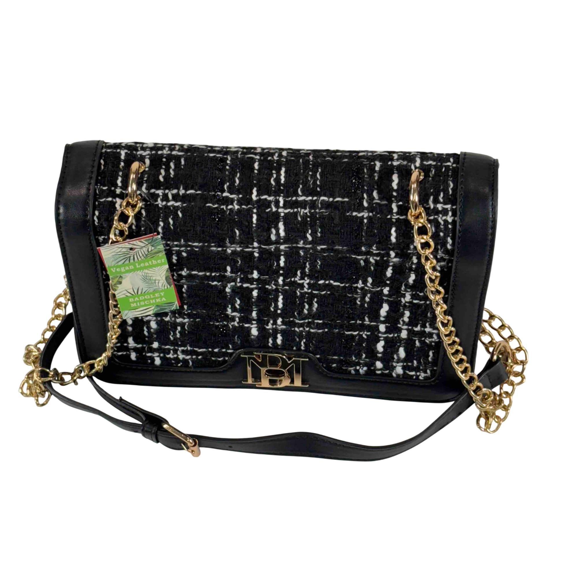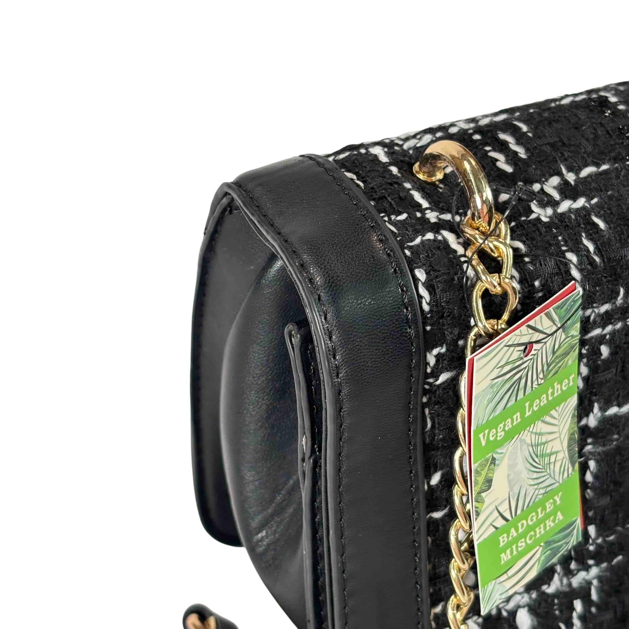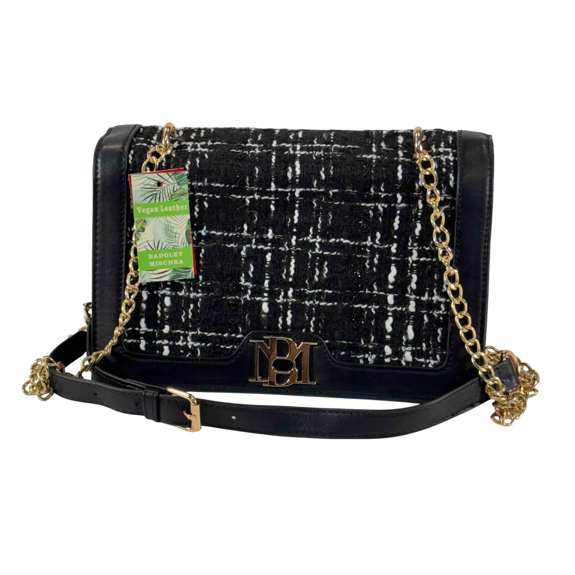 Elevate your style with the chic Badgley Mischka BM-4165 handbag. This elegant black and white tweed accessory features luxurious gold chain accents and a signature logo, crafted from premium vegan leather for an eco-friendly yet fashionable statement. Perfect for any occasion, this handbag seamlessly combines timeless design with modern flair.