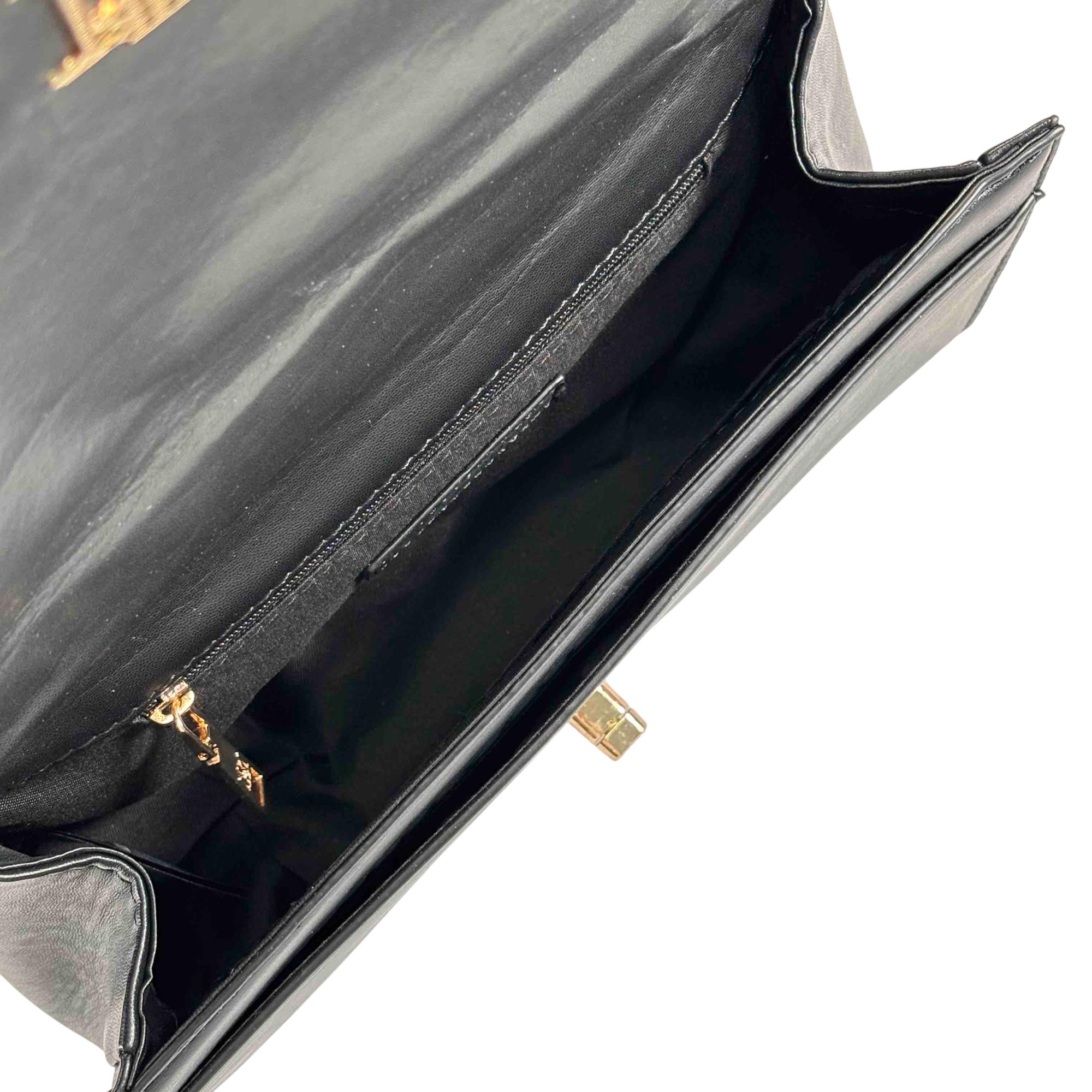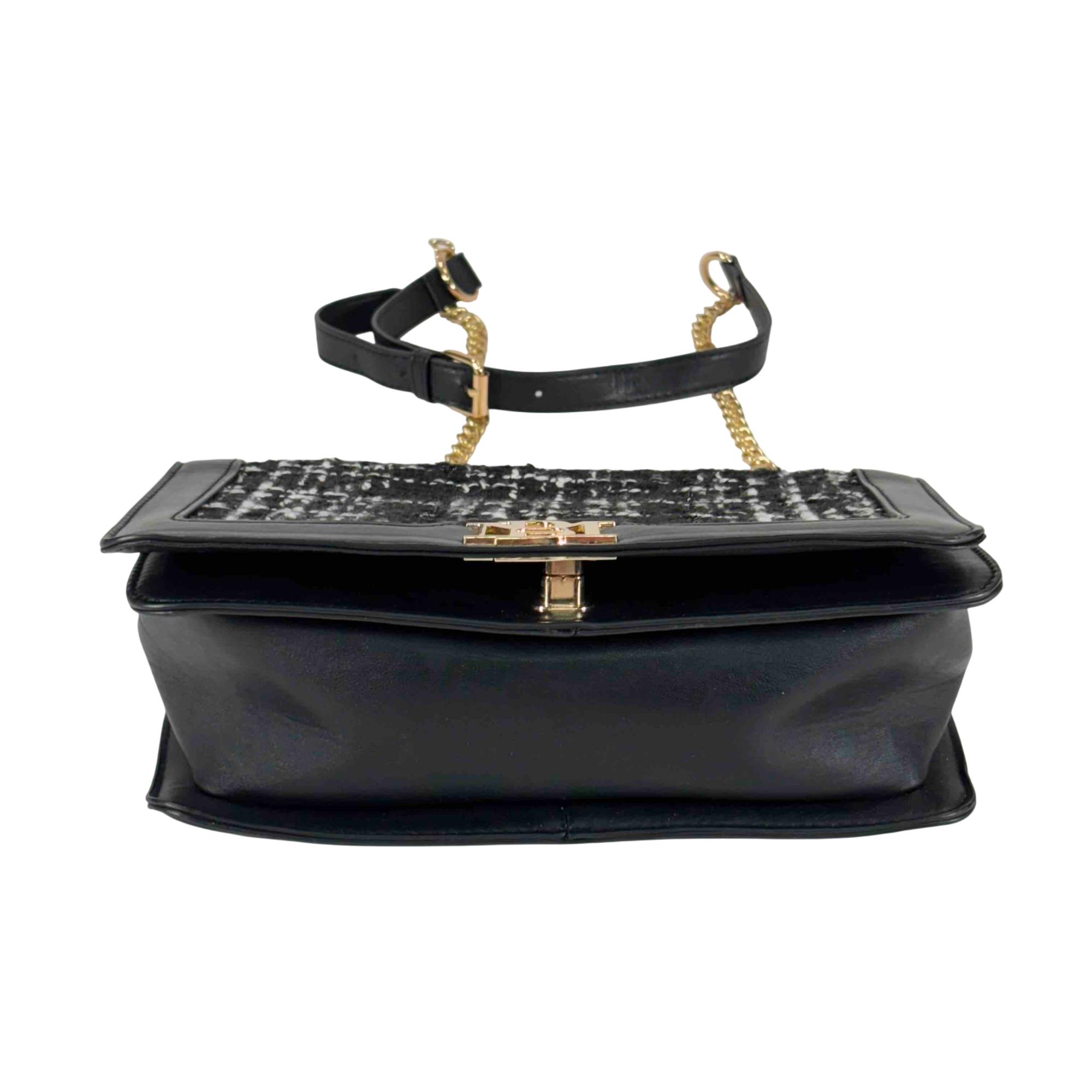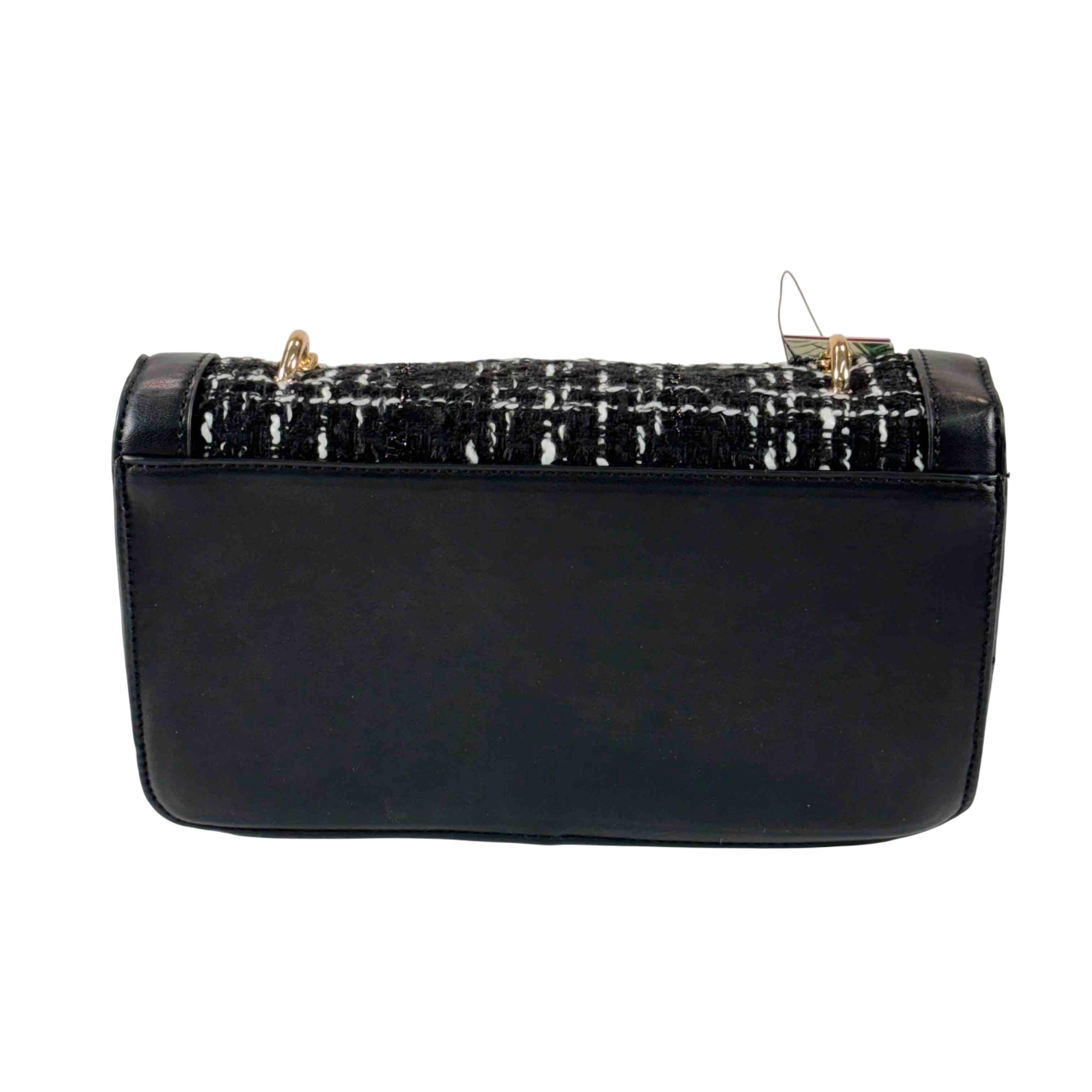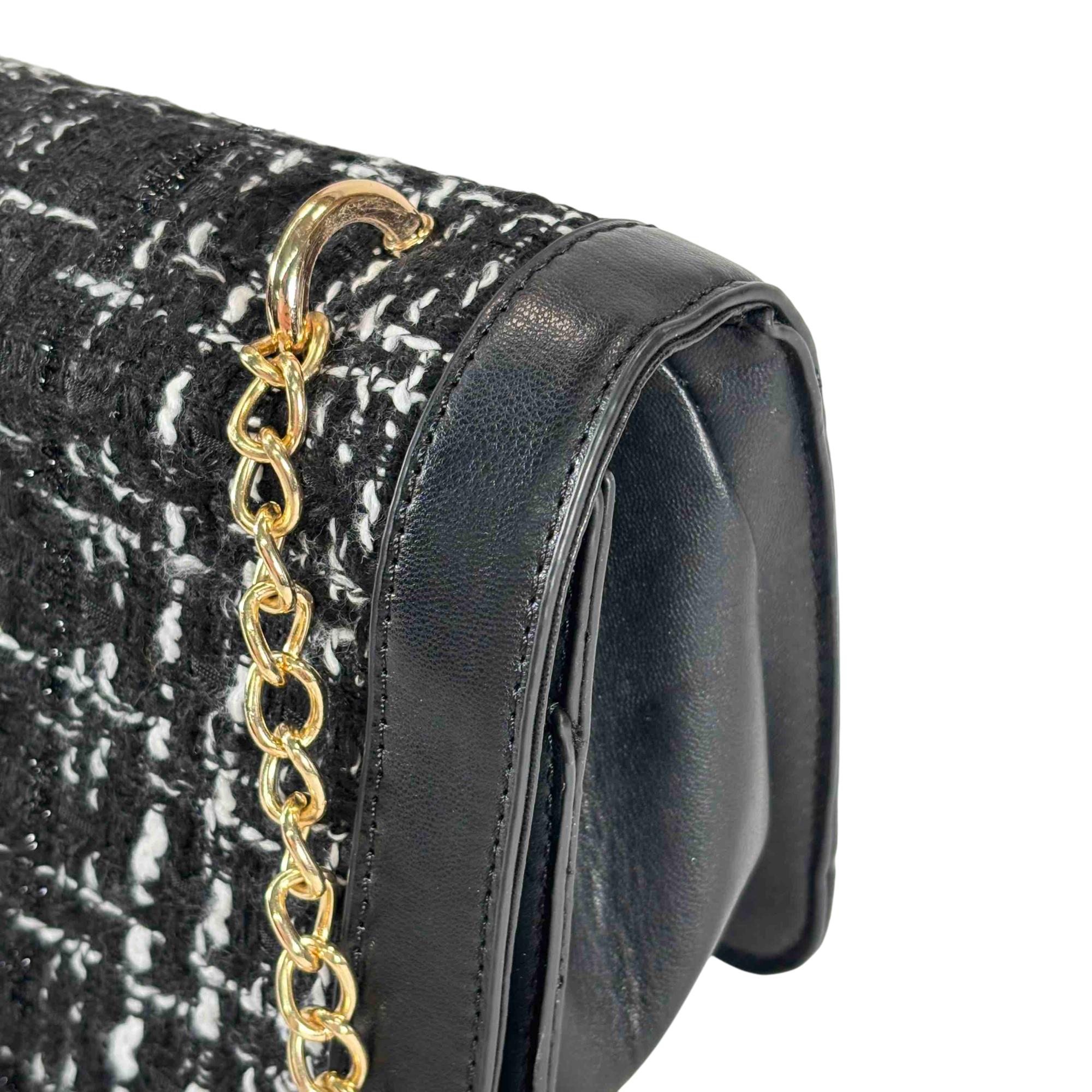 Elevate your style with the chic Badgley Mischka BM-4165 handbag. This elegant black and white tweed accessory features luxurious gold chain accents and a signature logo, crafted from premium vegan leather for an eco-friendly yet fashionable statement. Perfect for any occasion, this handbag seamlessly combines timeless design with modern flair.