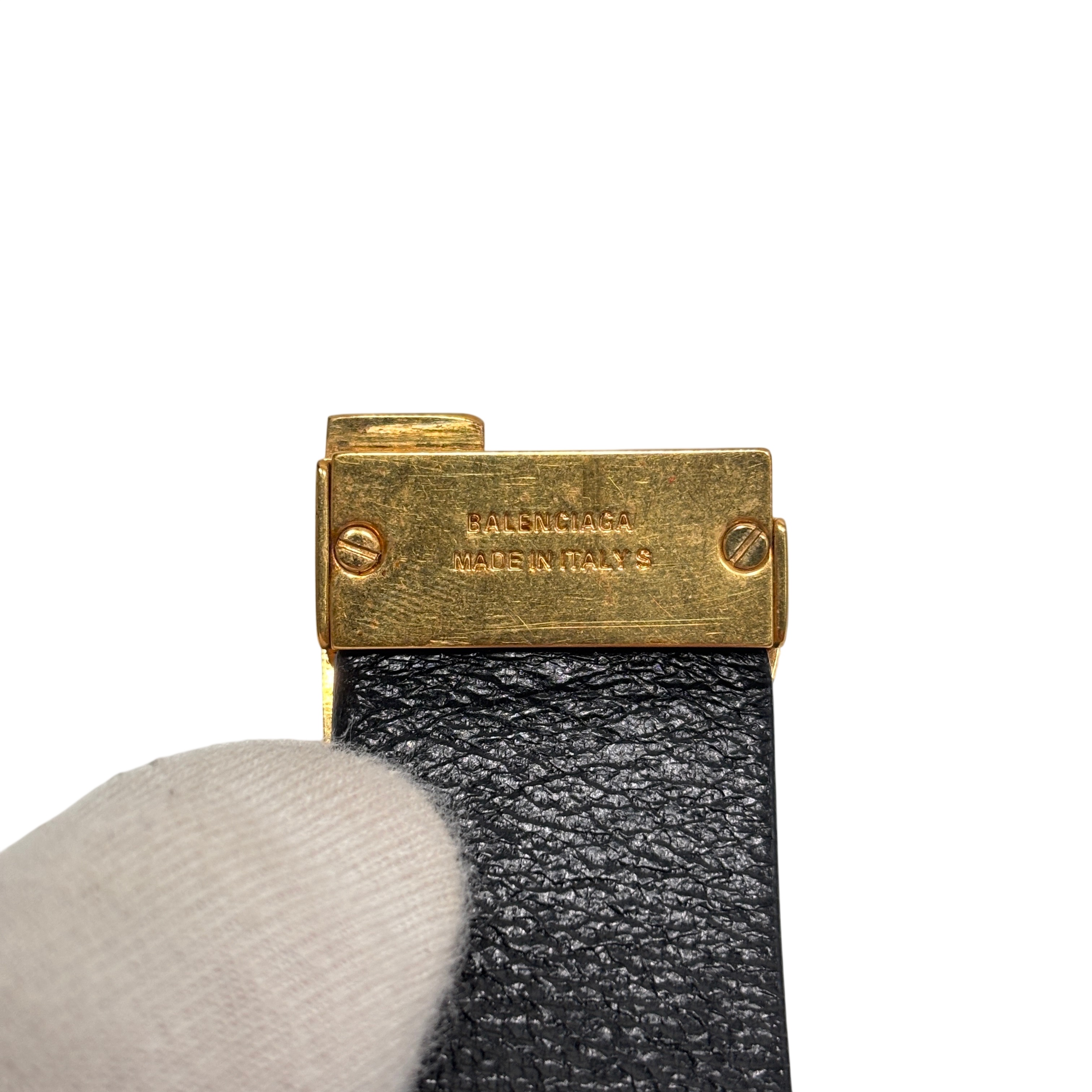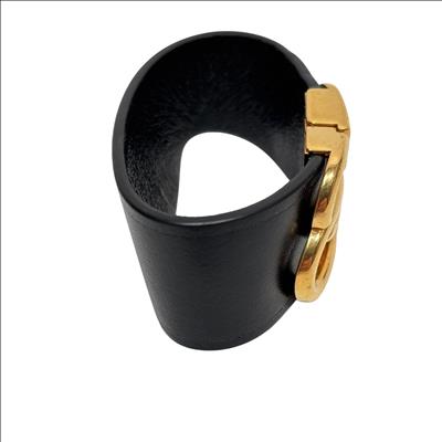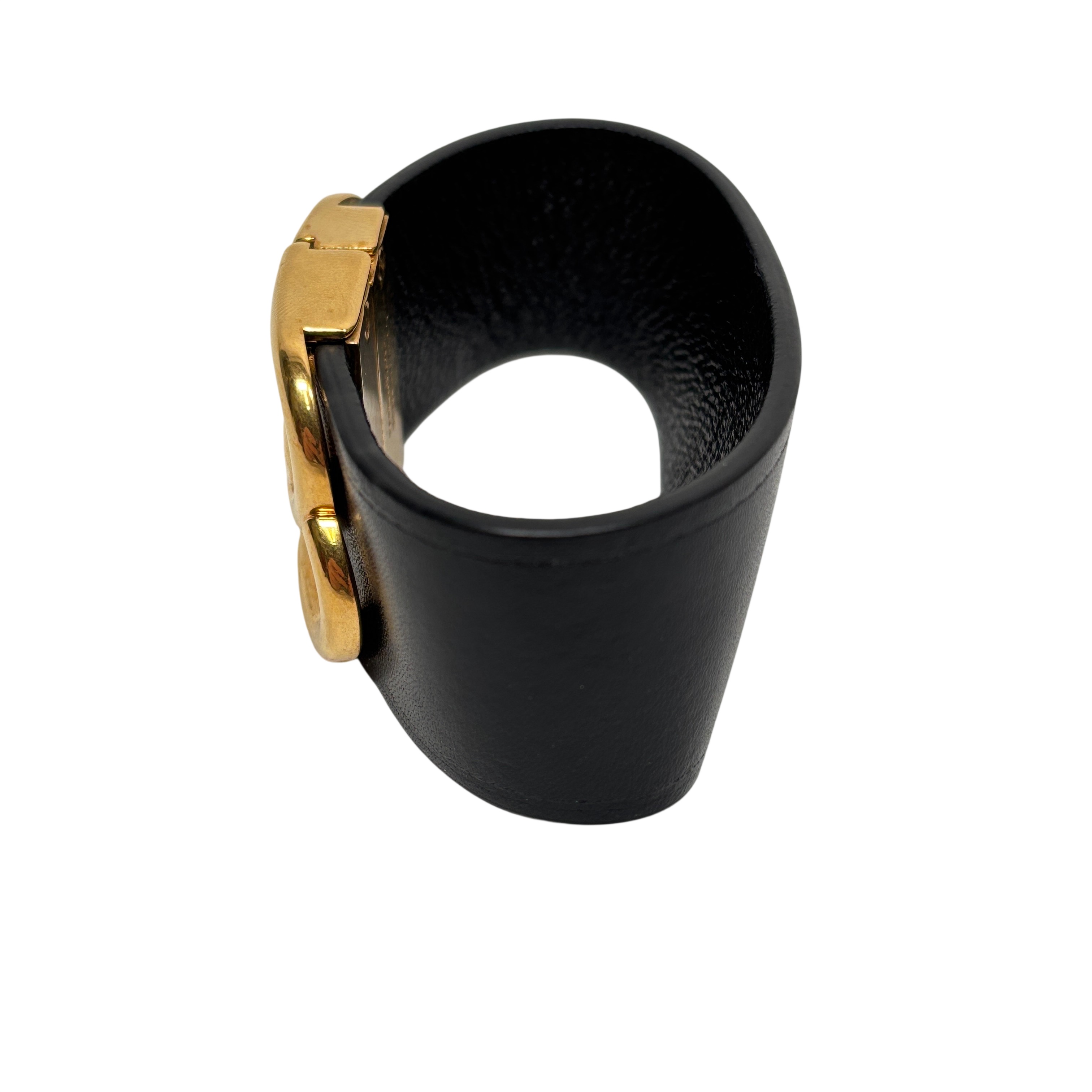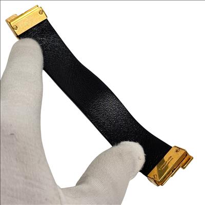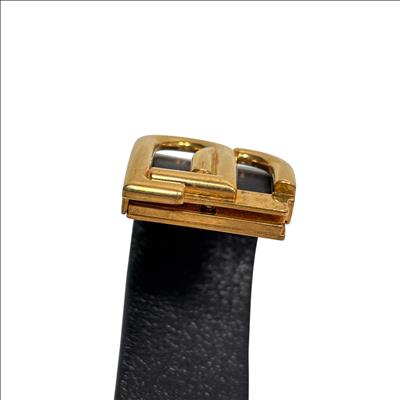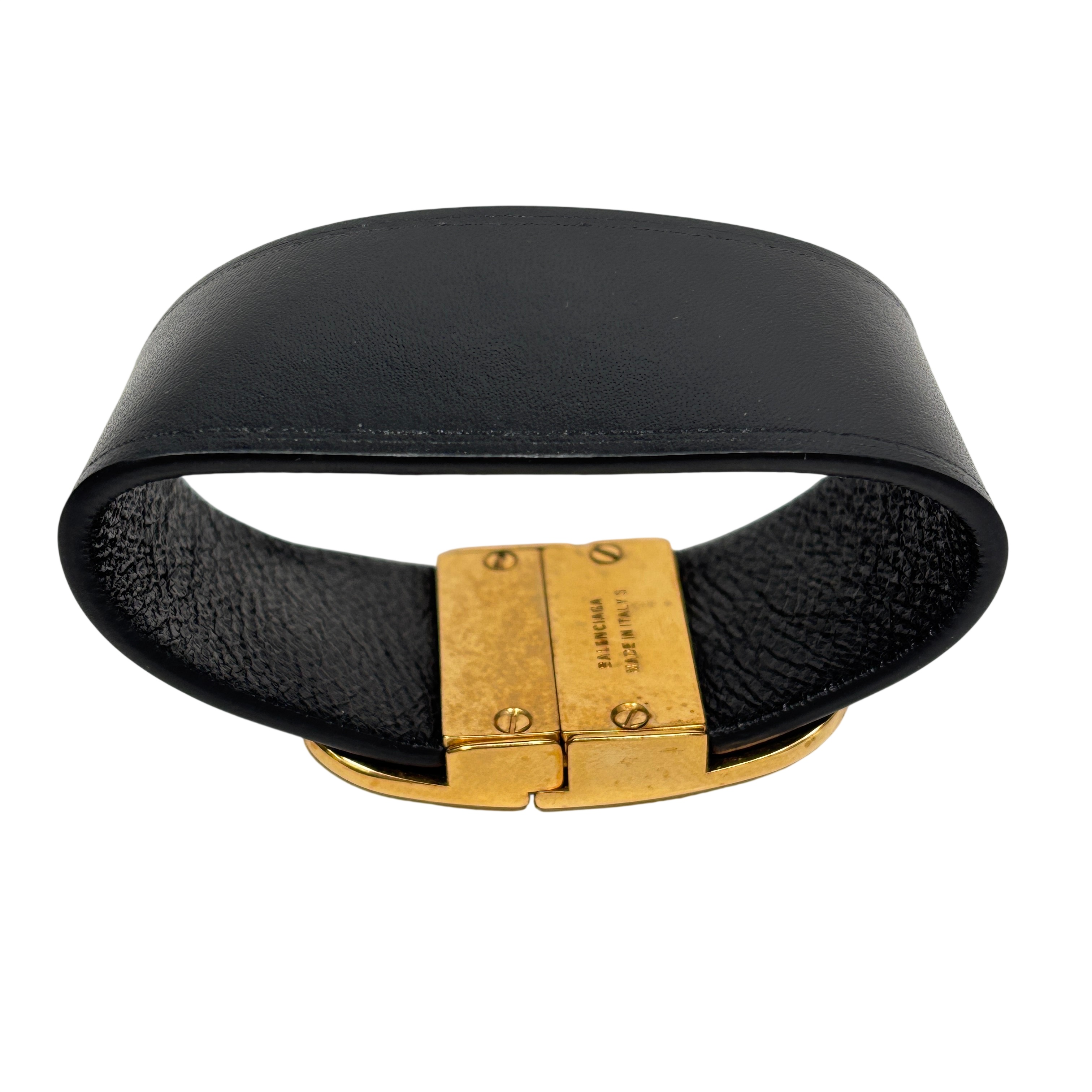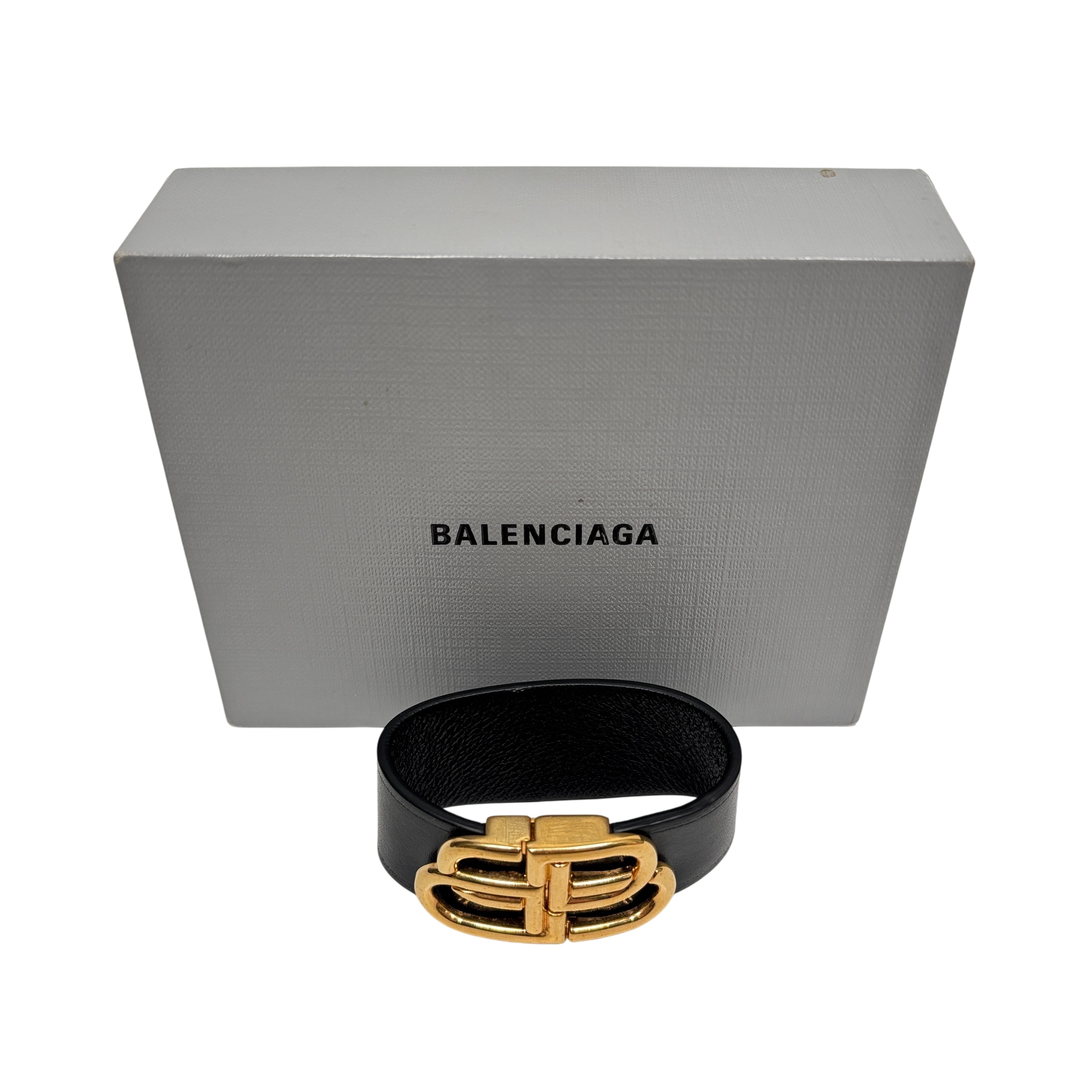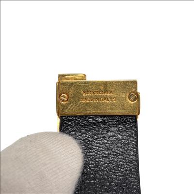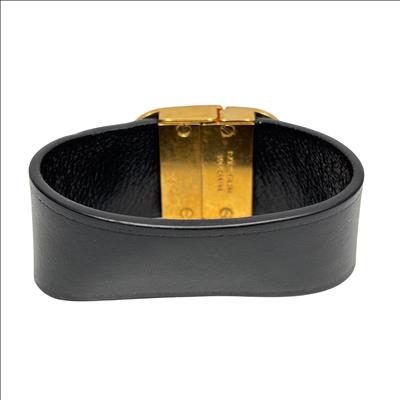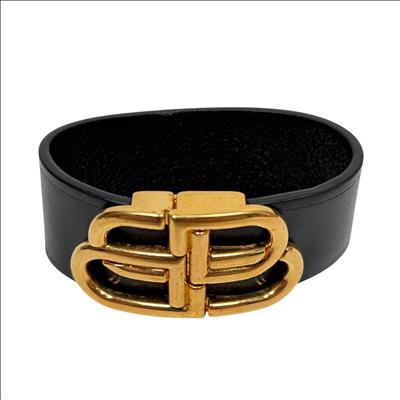 Balenciaga BB Leather Bracelet features a sleek black leather band paired with a distinctive gold-tone BB logo clasp. Made in Italy, this stylish accessory combines luxury craftsmanship with modern design. Measuring approximately 6 inches in length, it offers a comfortable fit and a bold statement for any outfit. Perfect for adding a touch of high fashion to your jewelry collection.