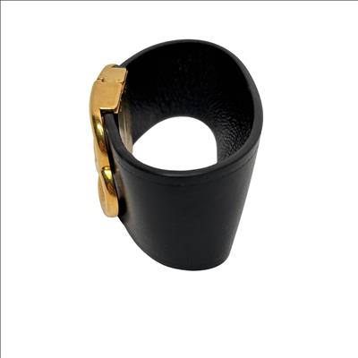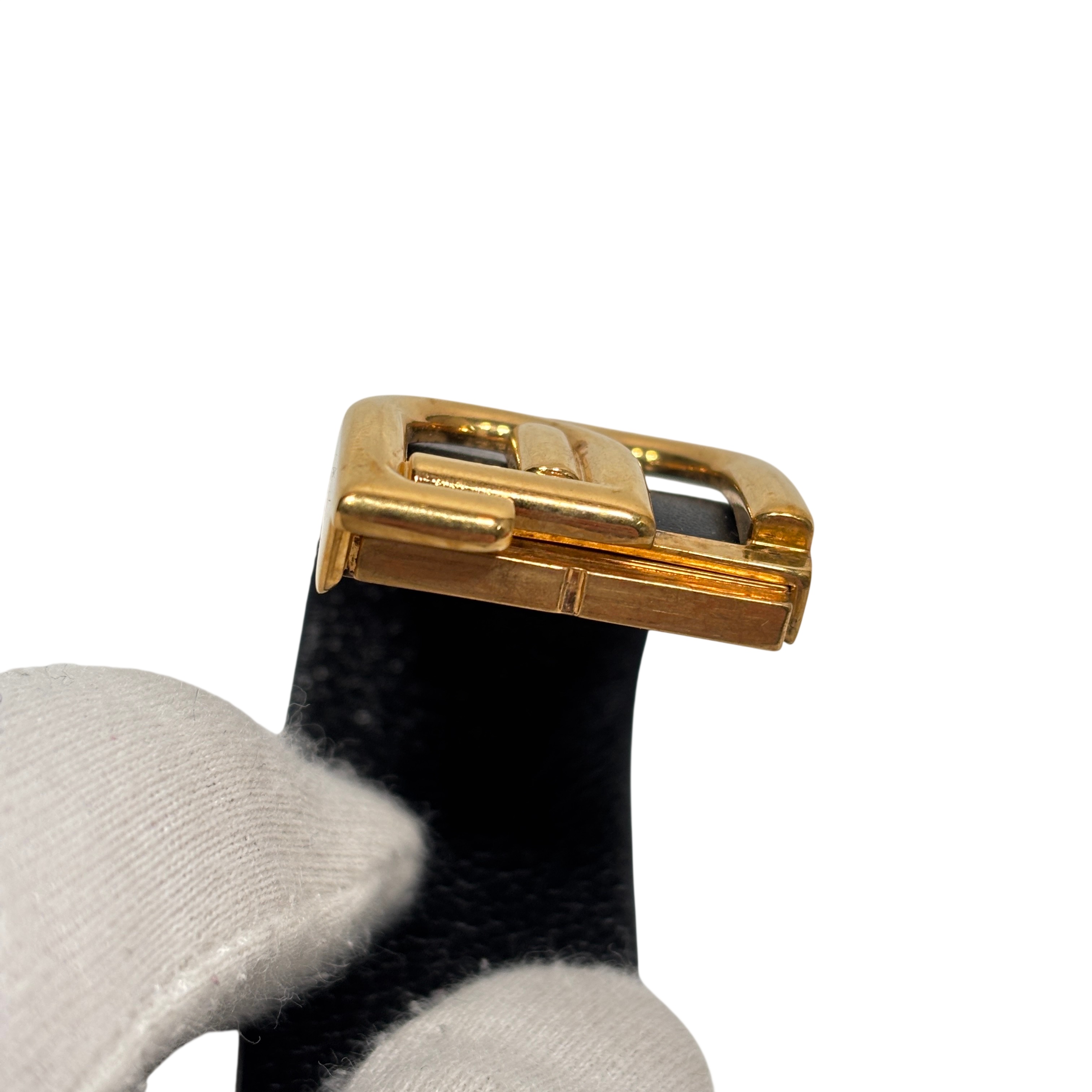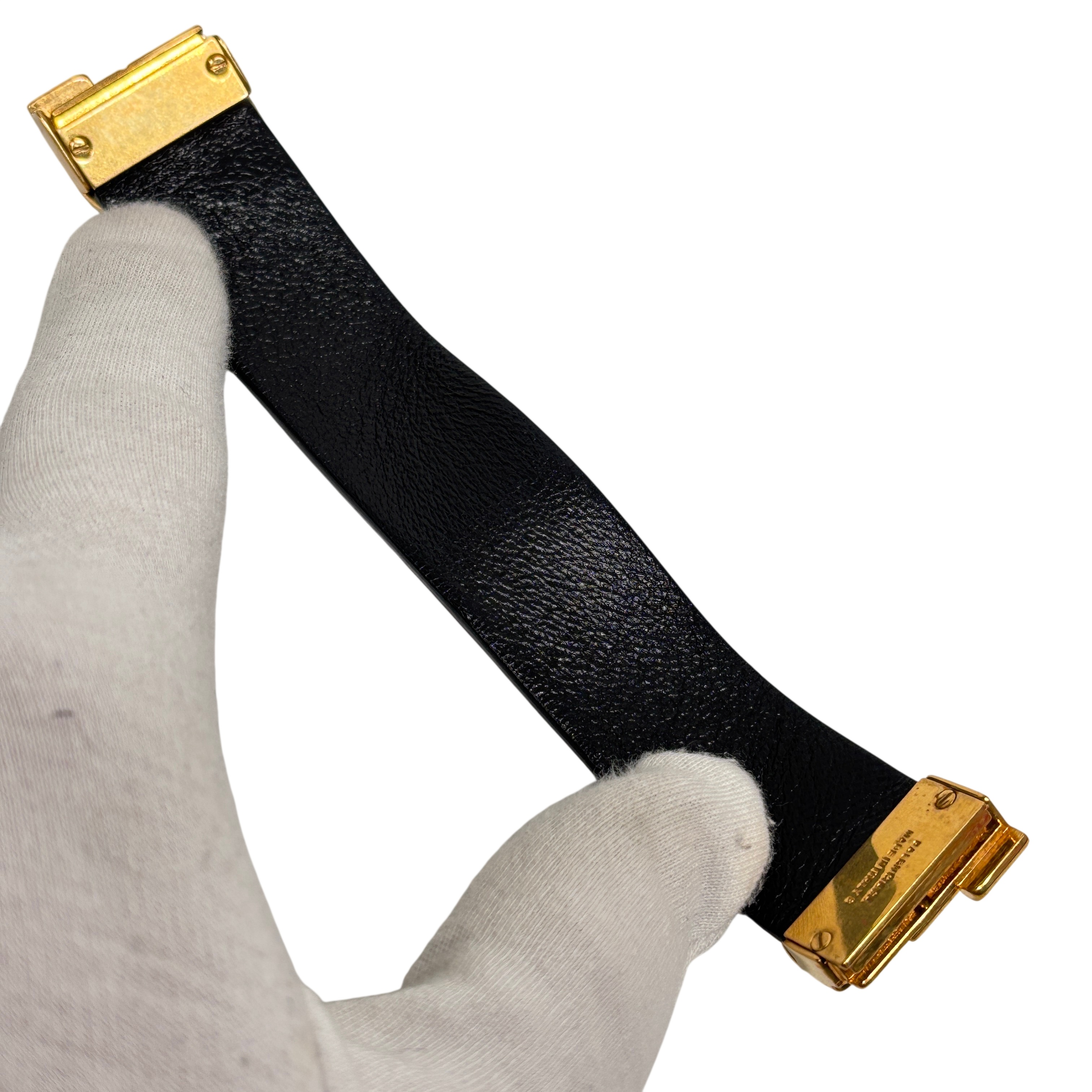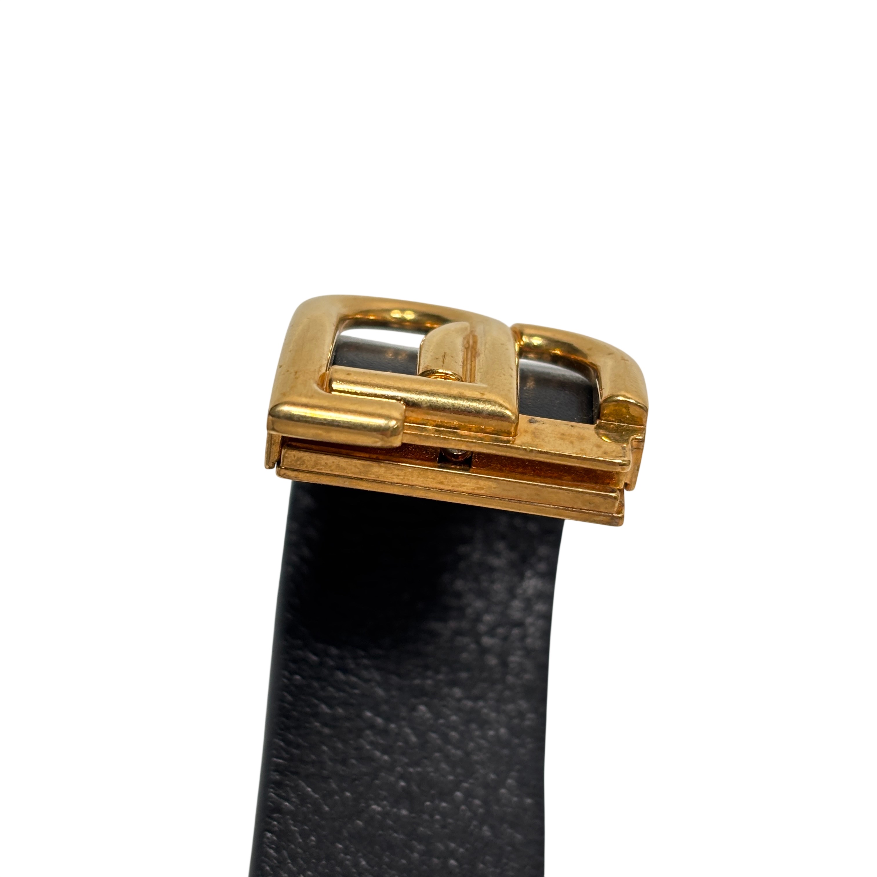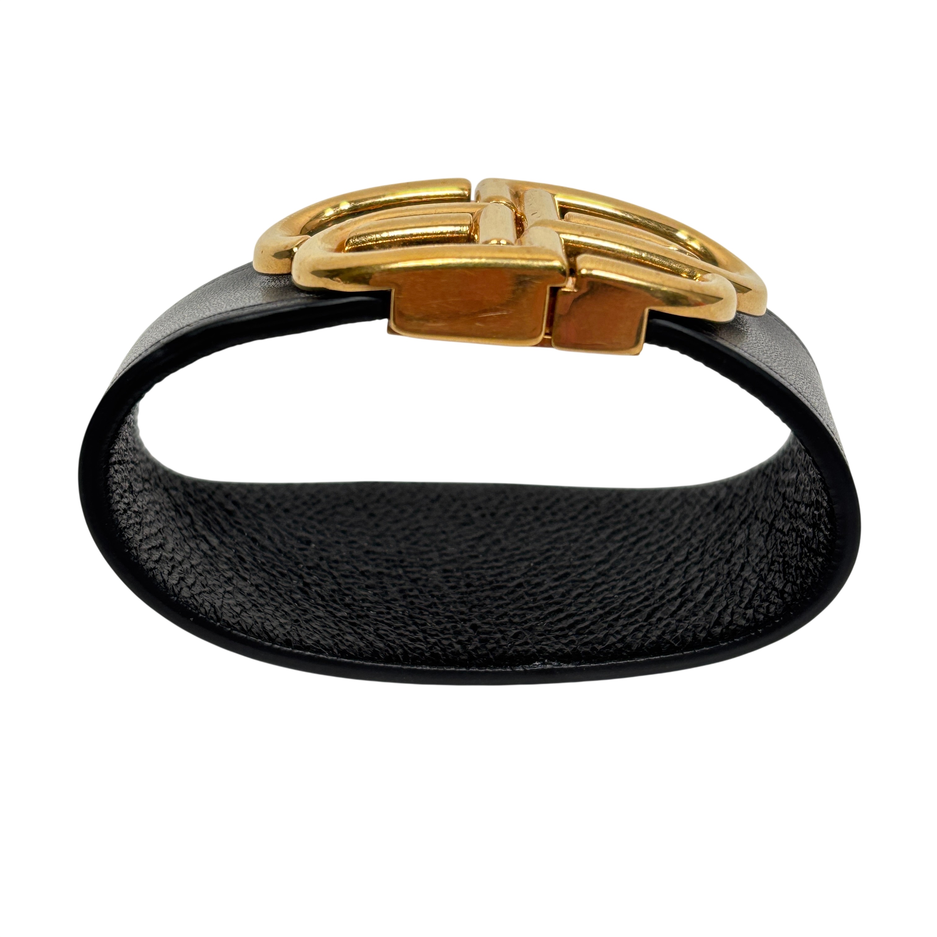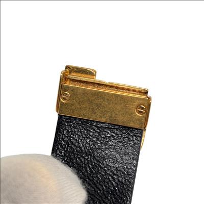 Balenciaga BB Leather Bracelet features a sleek black leather band paired with a distinctive gold-tone BB logo clasp. Made in Italy, this stylish accessory combines luxury craftsmanship with modern design. Measuring approximately 6 inches in length, it offers a comfortable fit and a bold statement for any outfit. Perfect for adding a touch of high fashion to your jewelry collection.