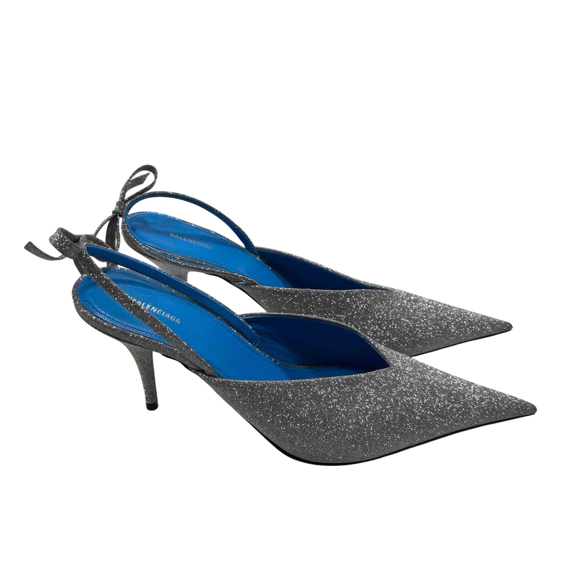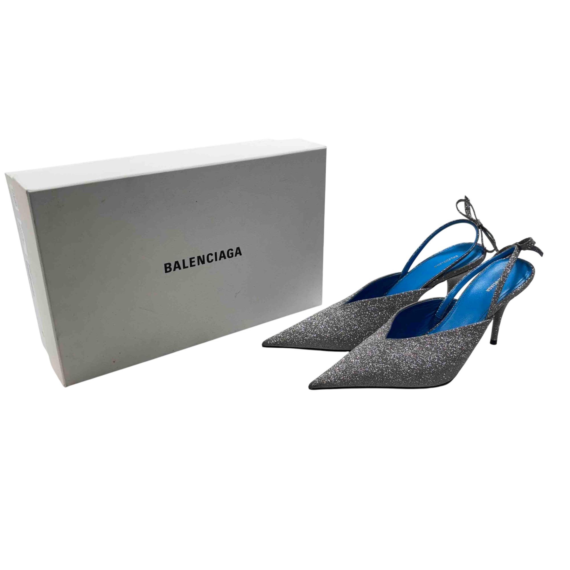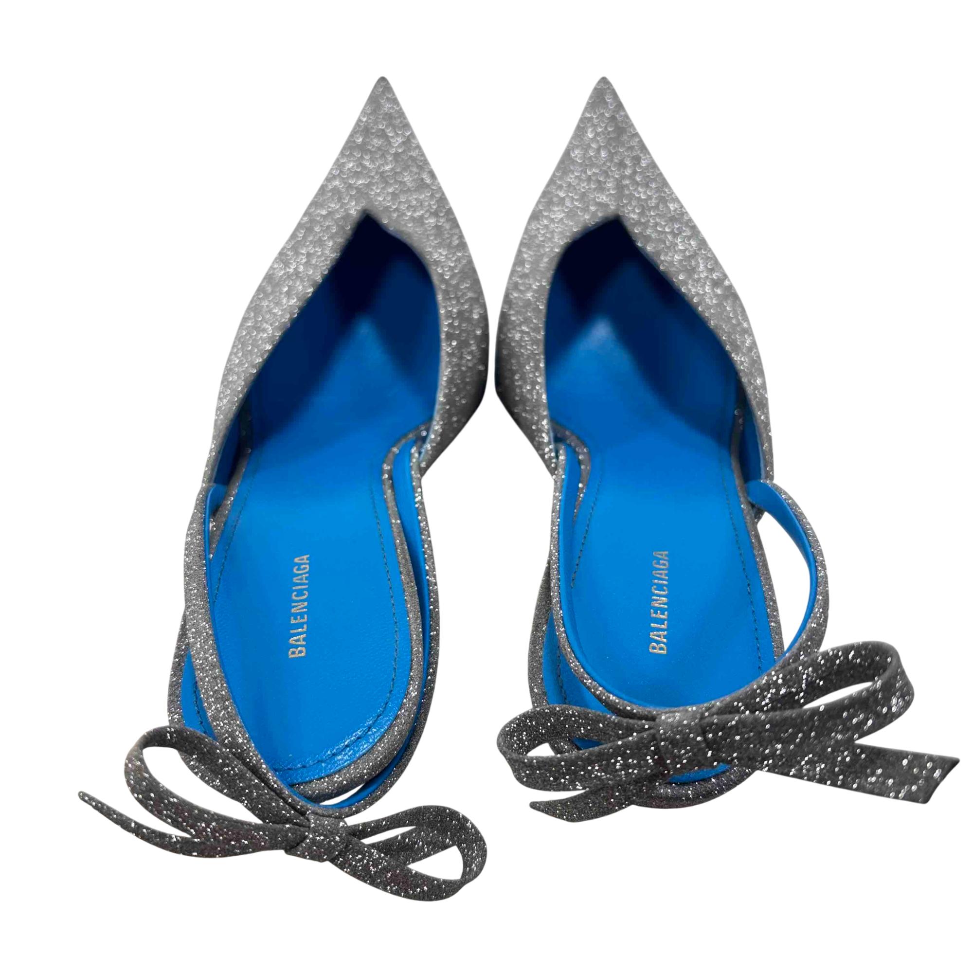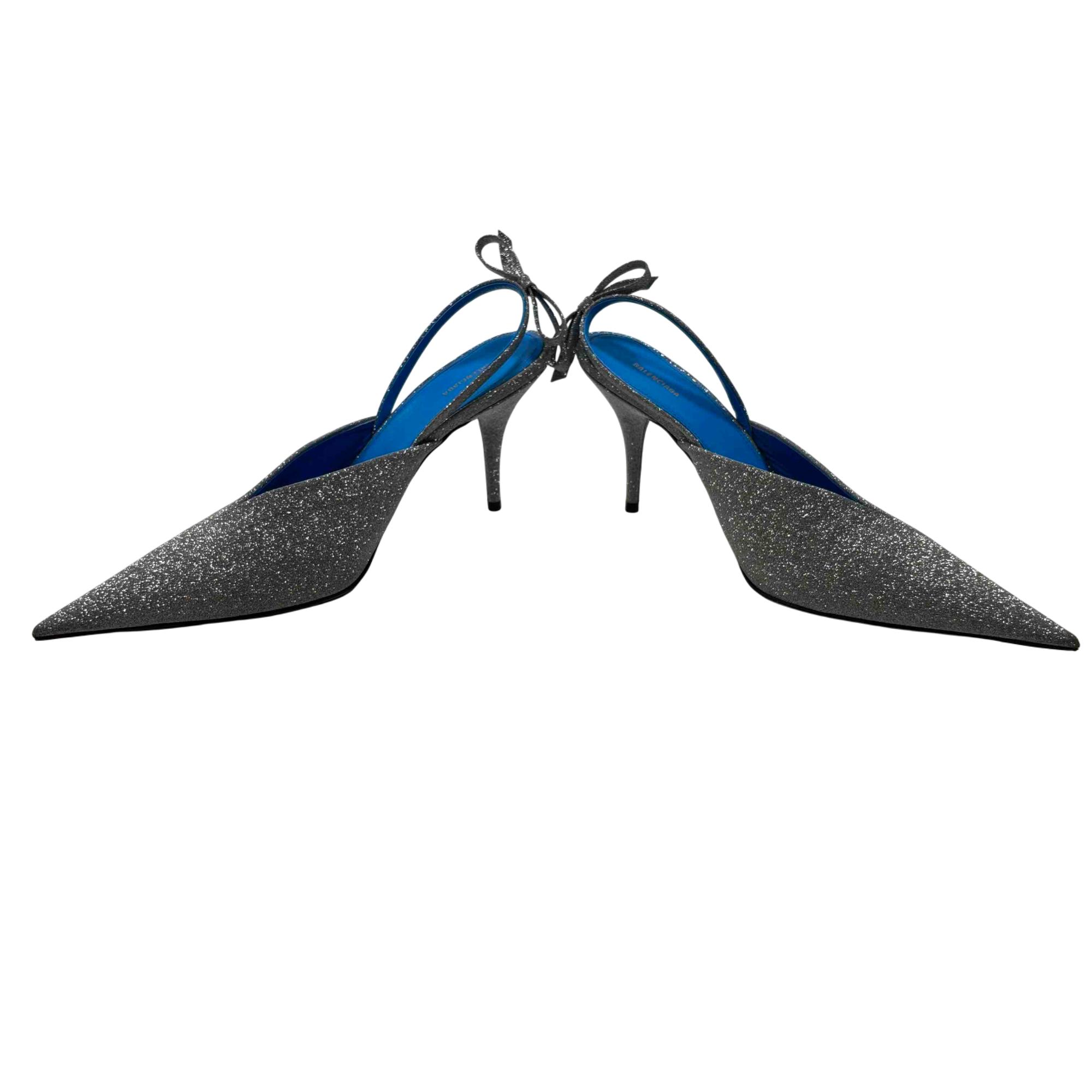 Step into luxury with these stunning Balenciaga high-heeled shoes. Featuring a captivating silver and blue glitter finish, these heels are adorned with an elegant bow, making them perfect for any glamorous event or a night out. Elevate your style and confidence with these exquisite designer shoes.