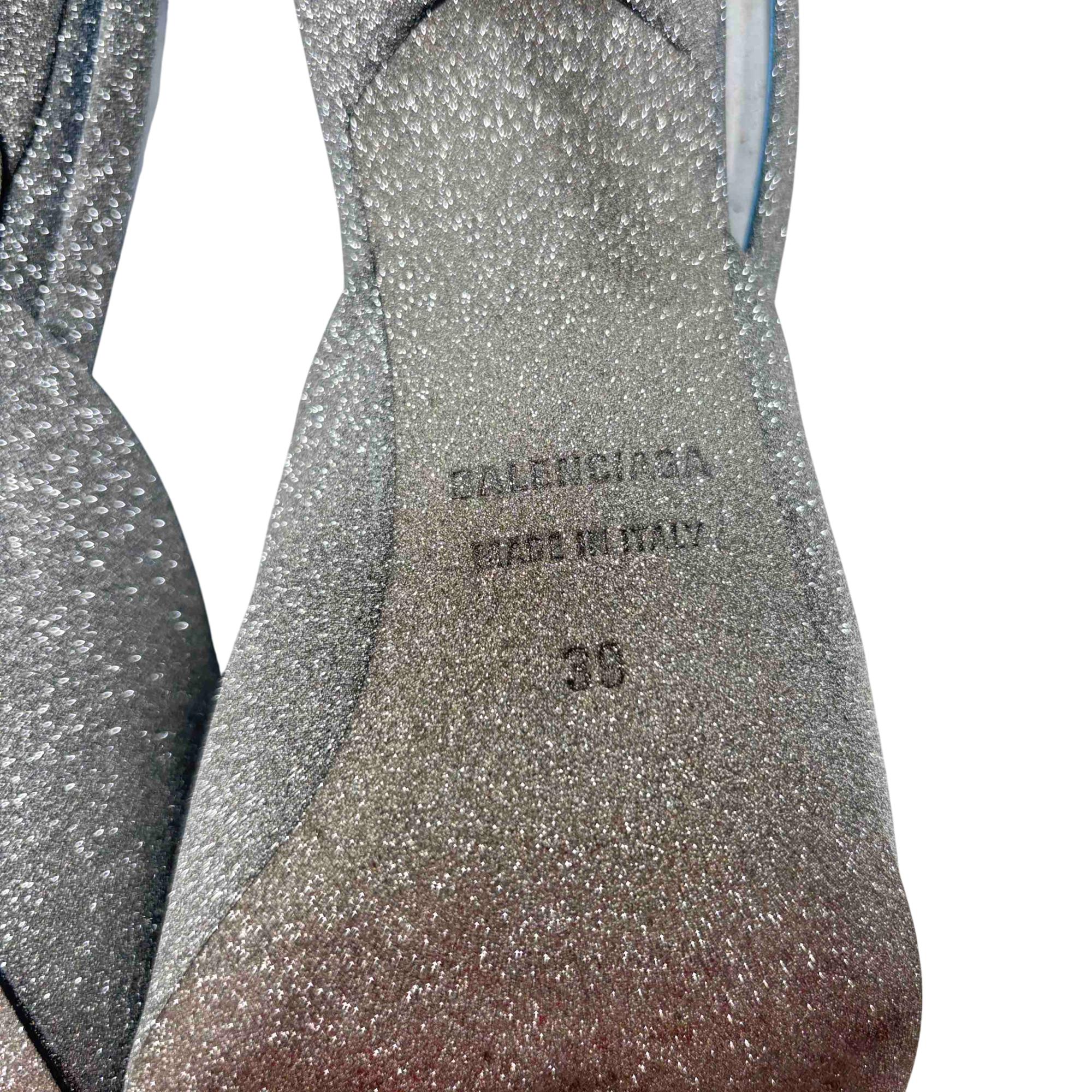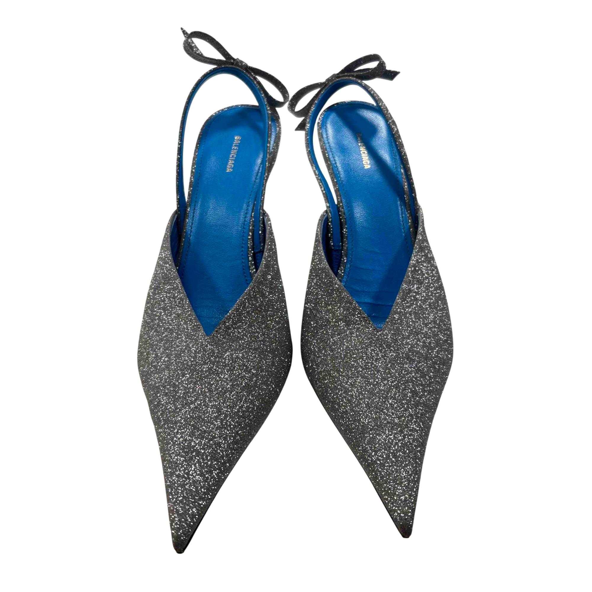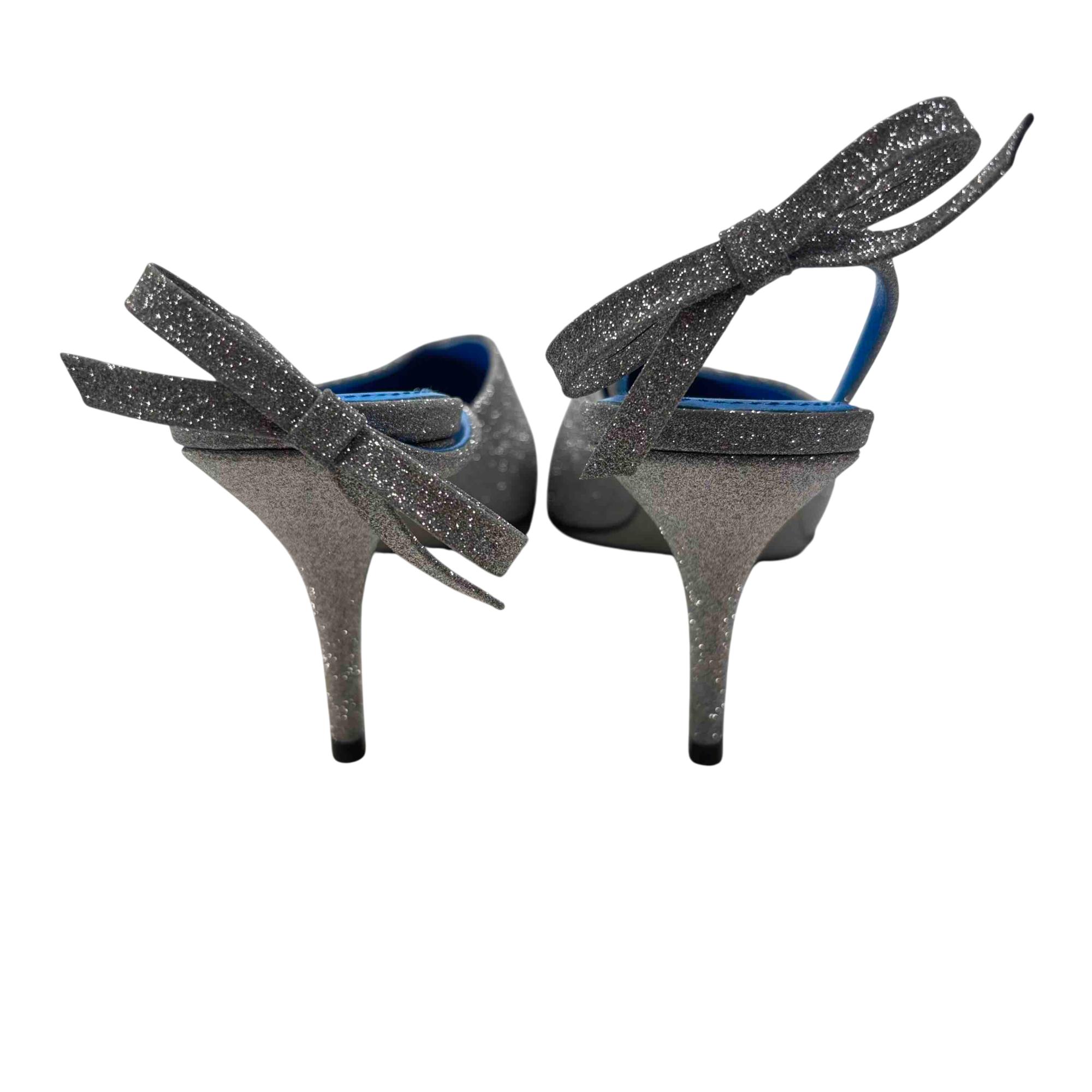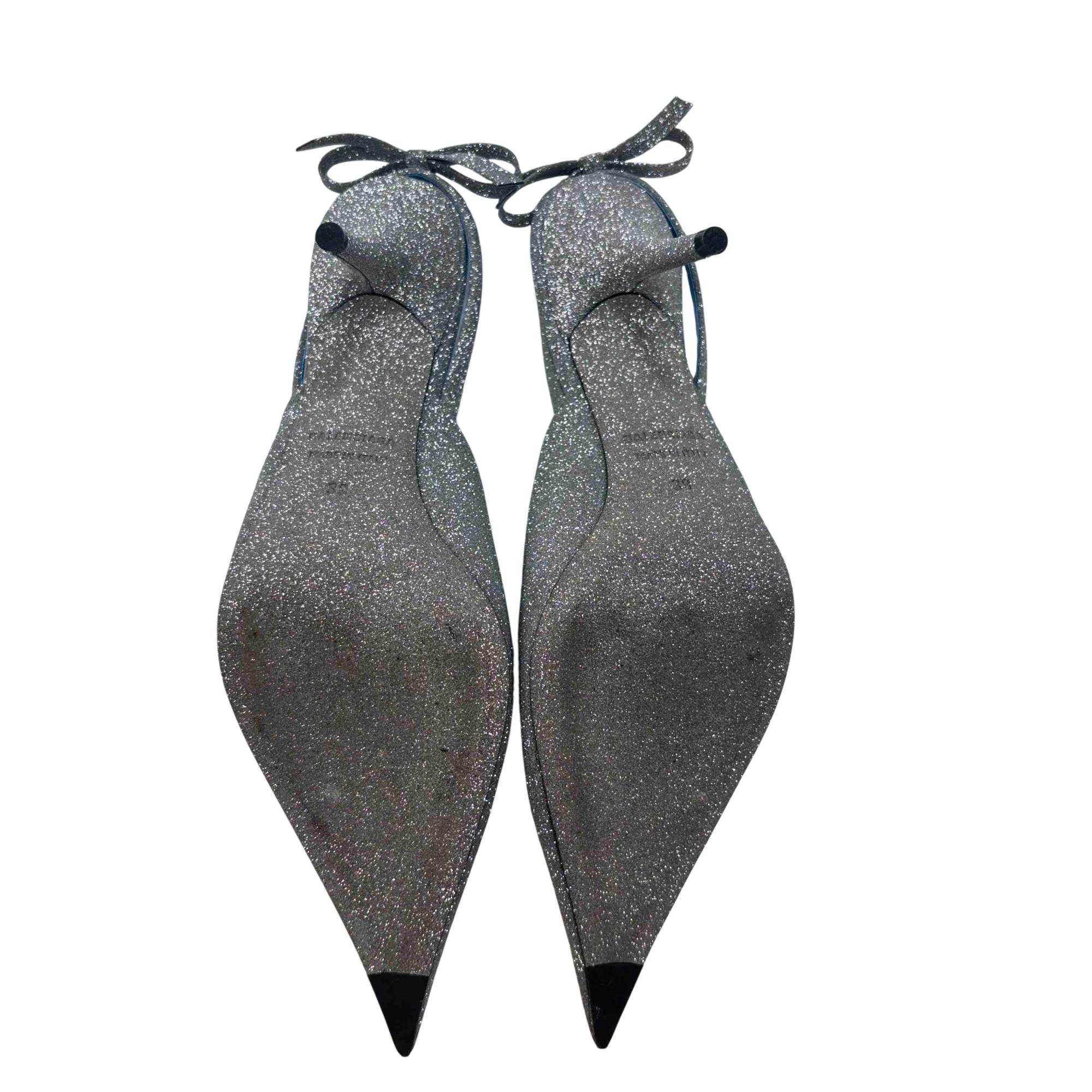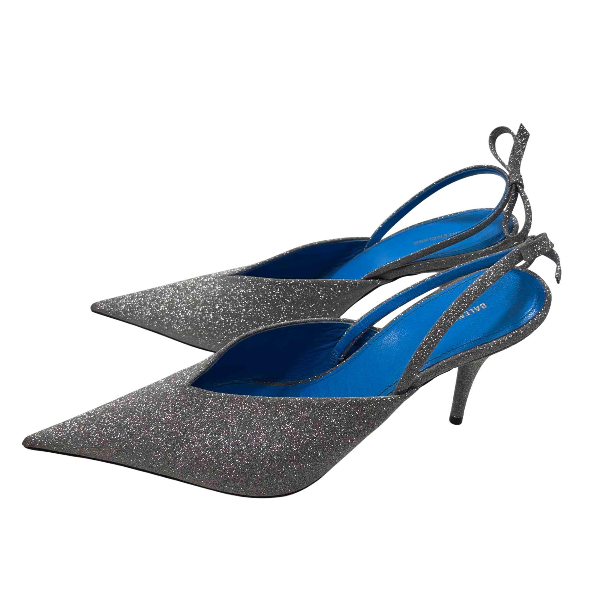 Step into luxury with these stunning Balenciaga high-heeled shoes. Featuring a captivating silver and blue glitter finish, these heels are adorned with an elegant bow, making them perfect for any glamorous event or a night out. Elevate your style and confidence with these exquisite designer shoes.